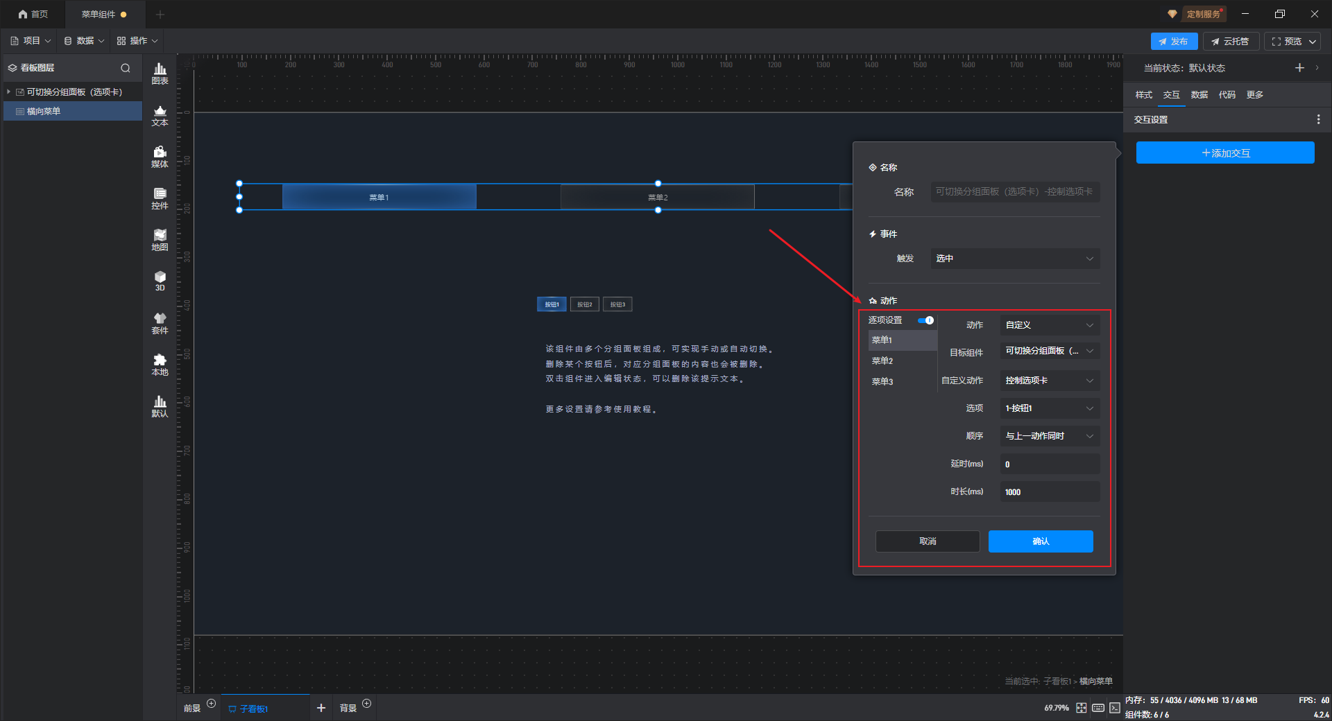 我们可以通过对“菜单组件”设置交互,实现点击菜单组件选项时,可切换分组面板组件自动切换至对应选项的效果,需要开启逐项设置,为每个菜单按钮绑定对应可切换分组面板组件中的按钮。