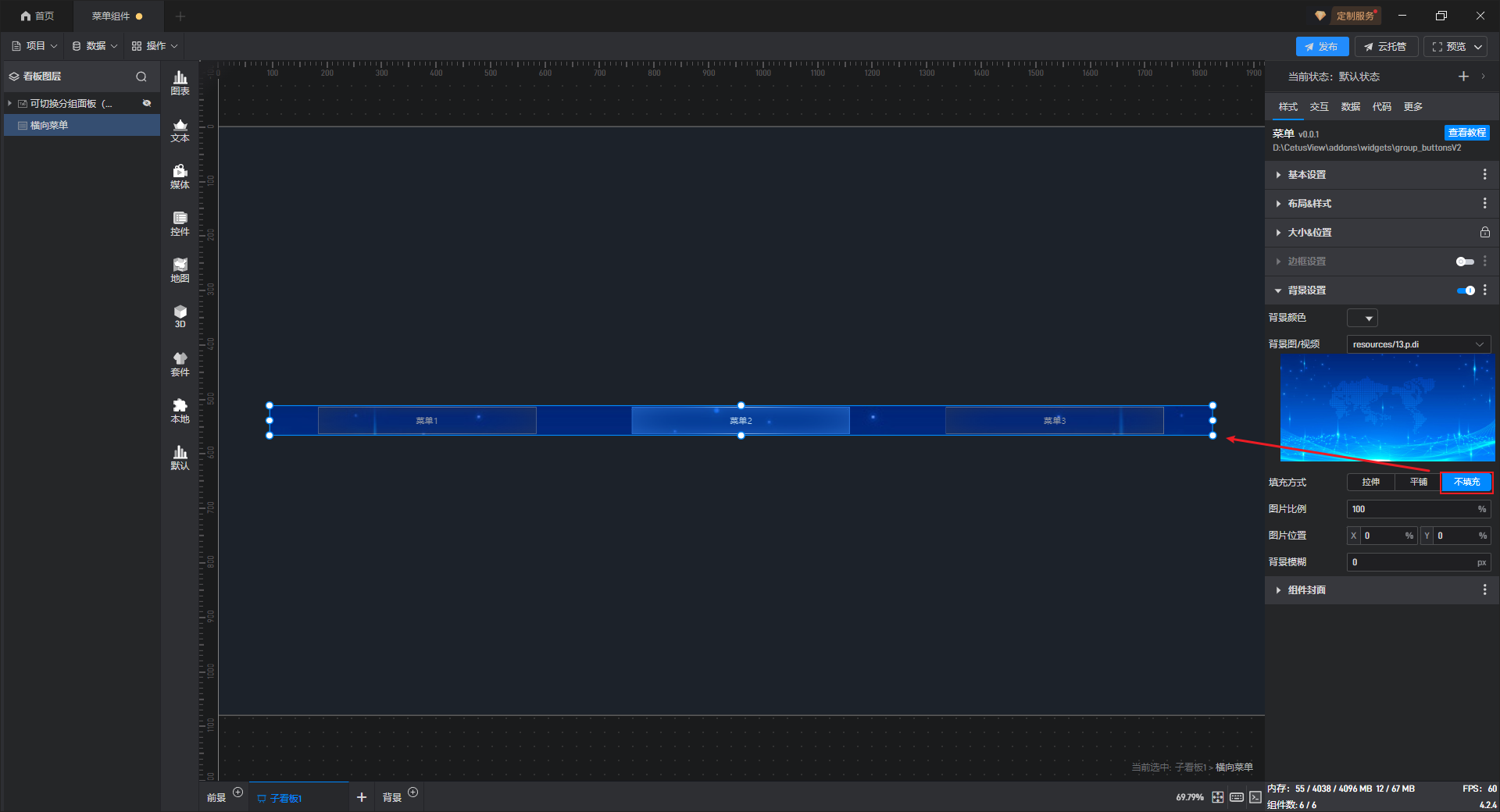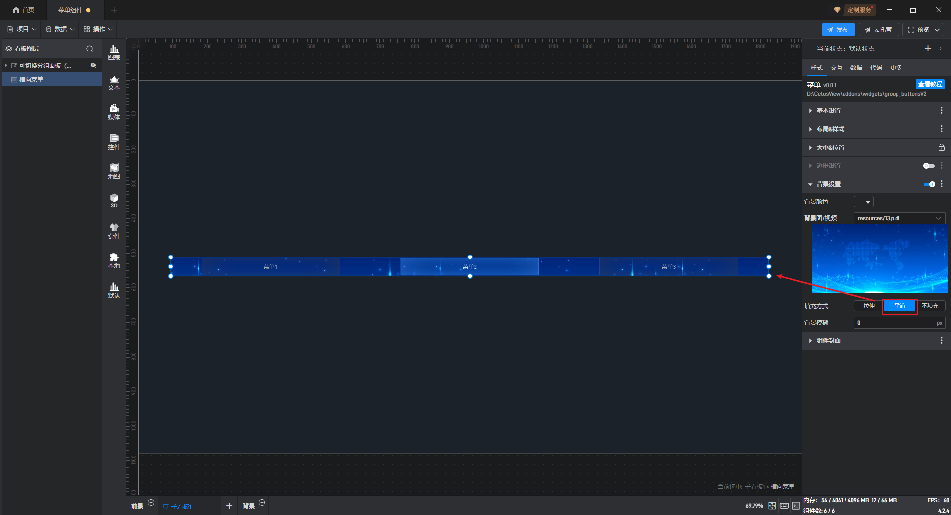 | 填充方式 | 背景“拉伸”方式下,图片会根据目标区域的大小进行拉伸或压缩,以完全覆盖该区域;背景“平铺”方式下,会将图片按其原始大小和比例不变的方式铺满整个区域。还可以设置为不填充。 |