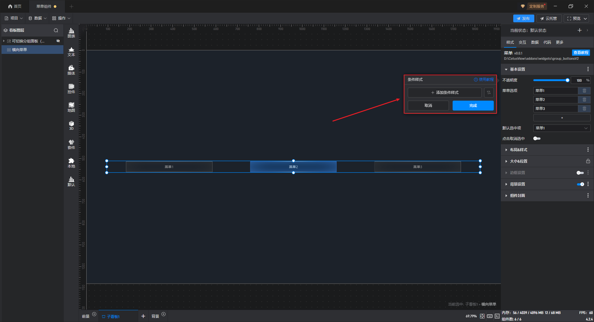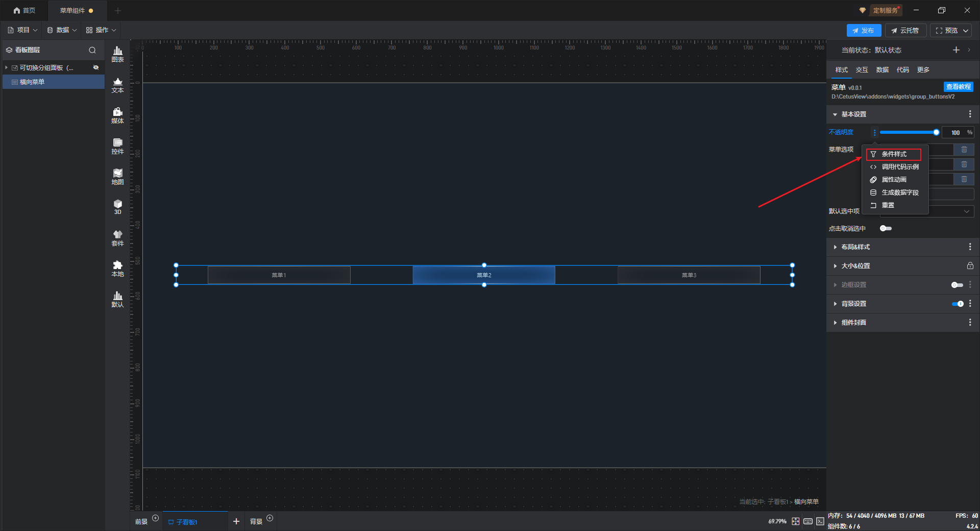 有一些设置项的条件设置方式会直接显示在设置项中,可以直接进行设置(比如数据表格组件),但菜单组件的条件样式只能通过方式 1 进行设置。