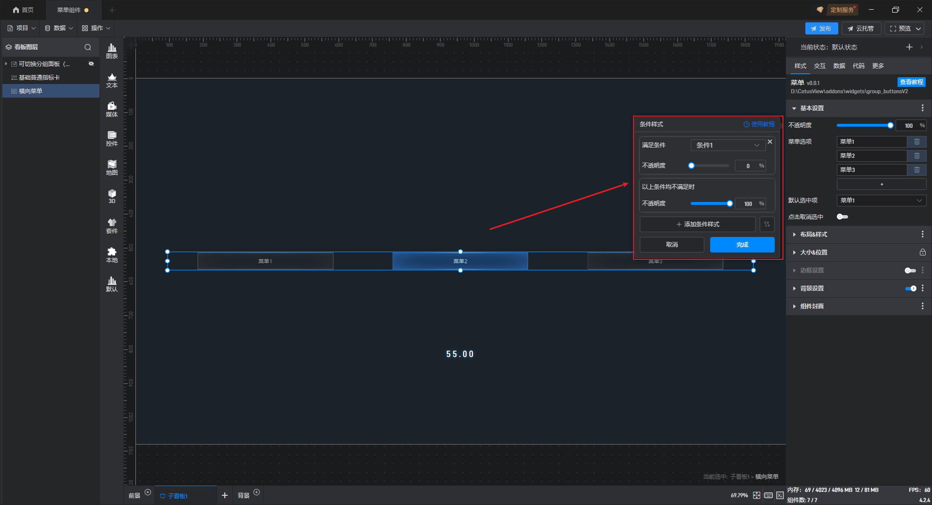 在这里我们可以选择已设置的数据条件,从而在数据条件满足时,组件的状态就会发生变化