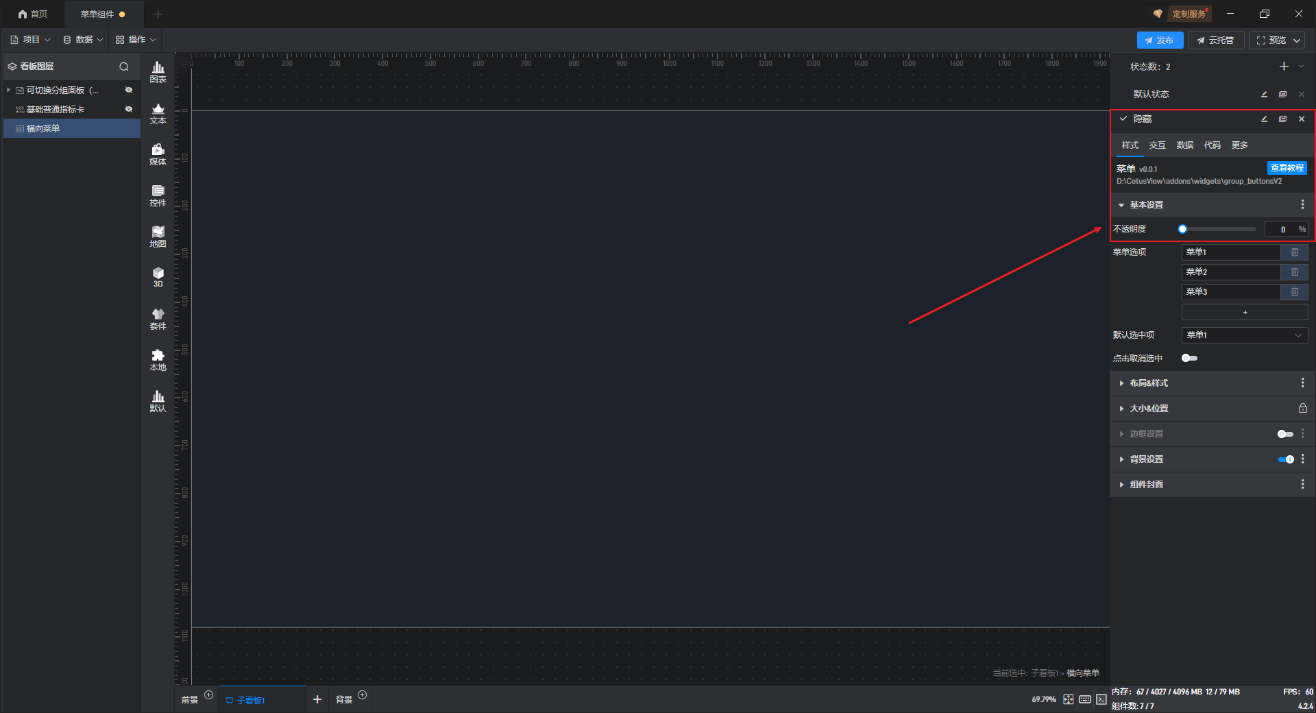 添加一个数值为“0”的数据到数据字段中,可以看到通过动态数据字段将不透明度的数值修改为“0”,从而使组件隐藏。