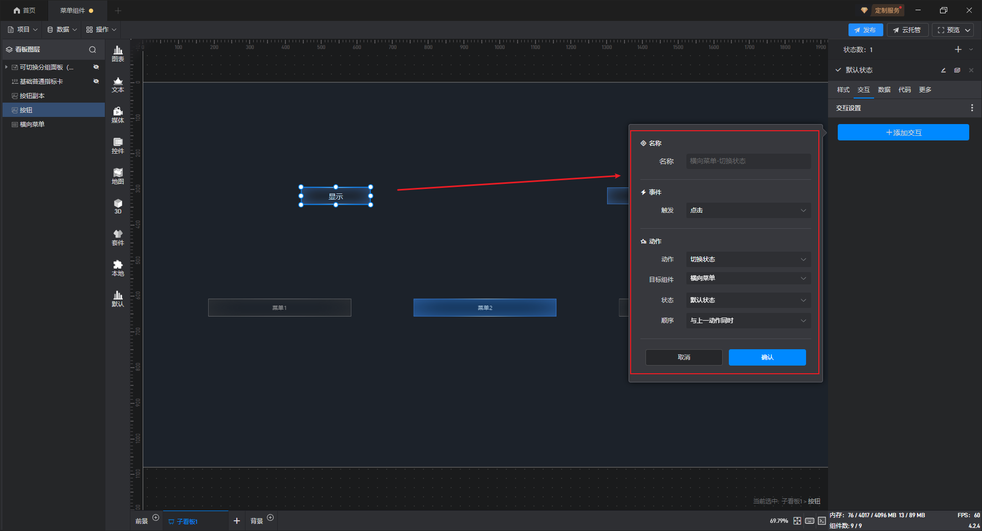 多状态主要用于通过数据条件或是点击交互(通常是点击其他组件来触发本组件的状态切换)来切换组件设置项的场景,这里的设置项包括组件的样式、交互、数据和代码。