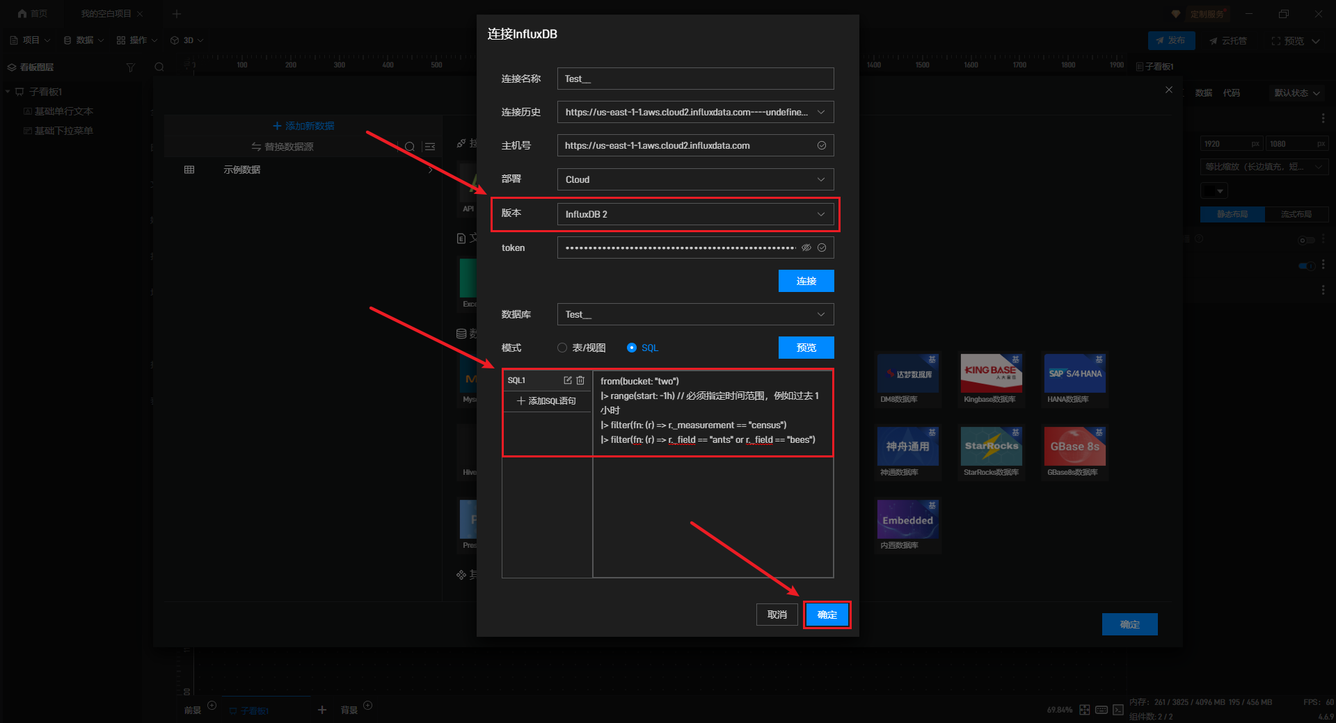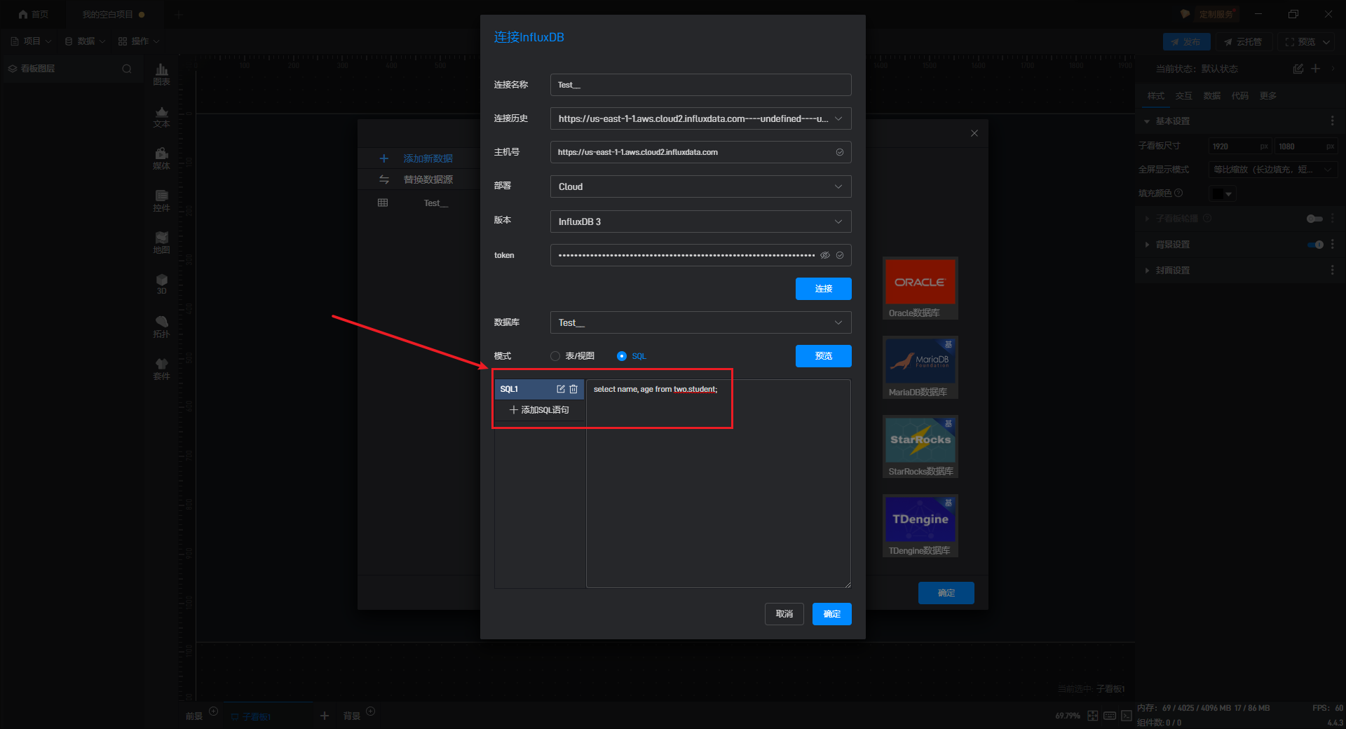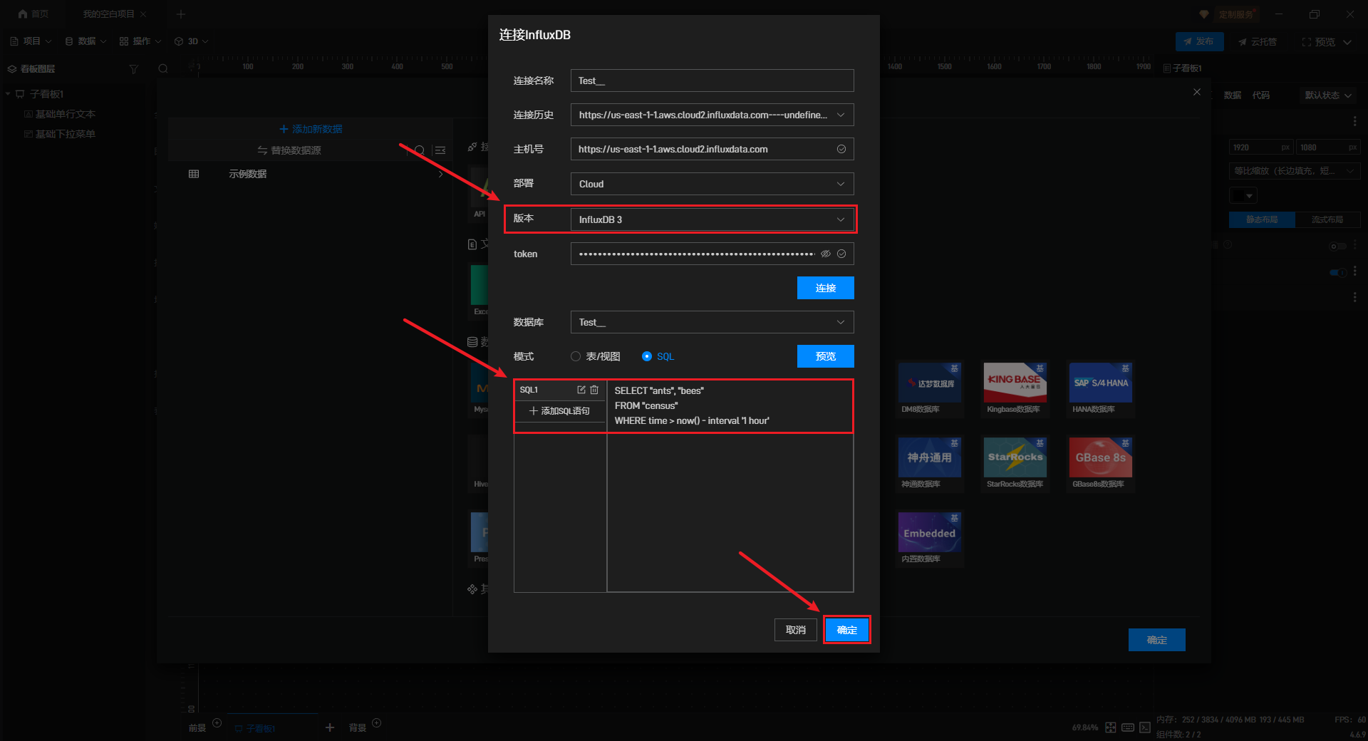 软件会弹出“连接 InfluxDB”的设置框,填入需要连接的数据库基本参数,并点击“连接”按钮。软件会自动尝试连接数据库并获取数据库中所有的表/视图。