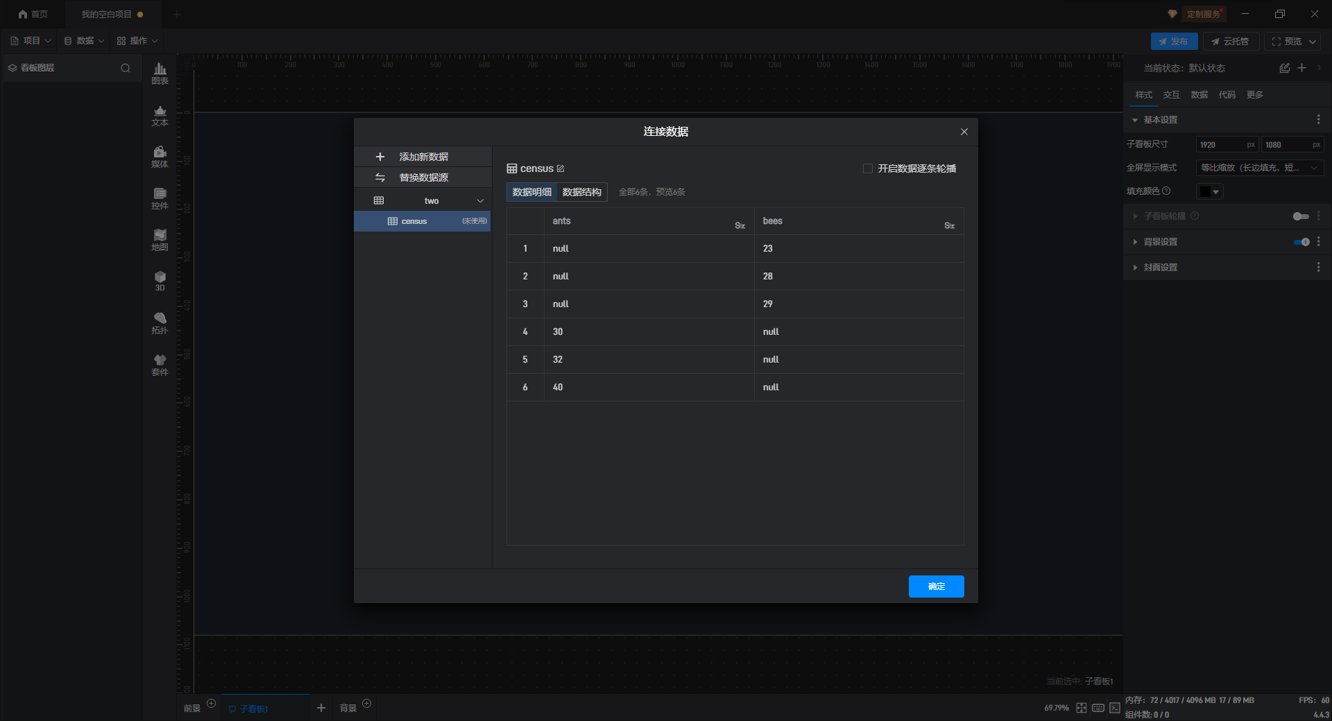 点击“连接”按钮后,在“SQL”模式下点击“+添加 SQL 语句”,输入 SQL 语句“select ants, bees from two.census;”,然后点击“确定”。