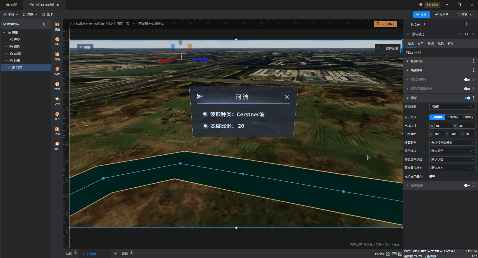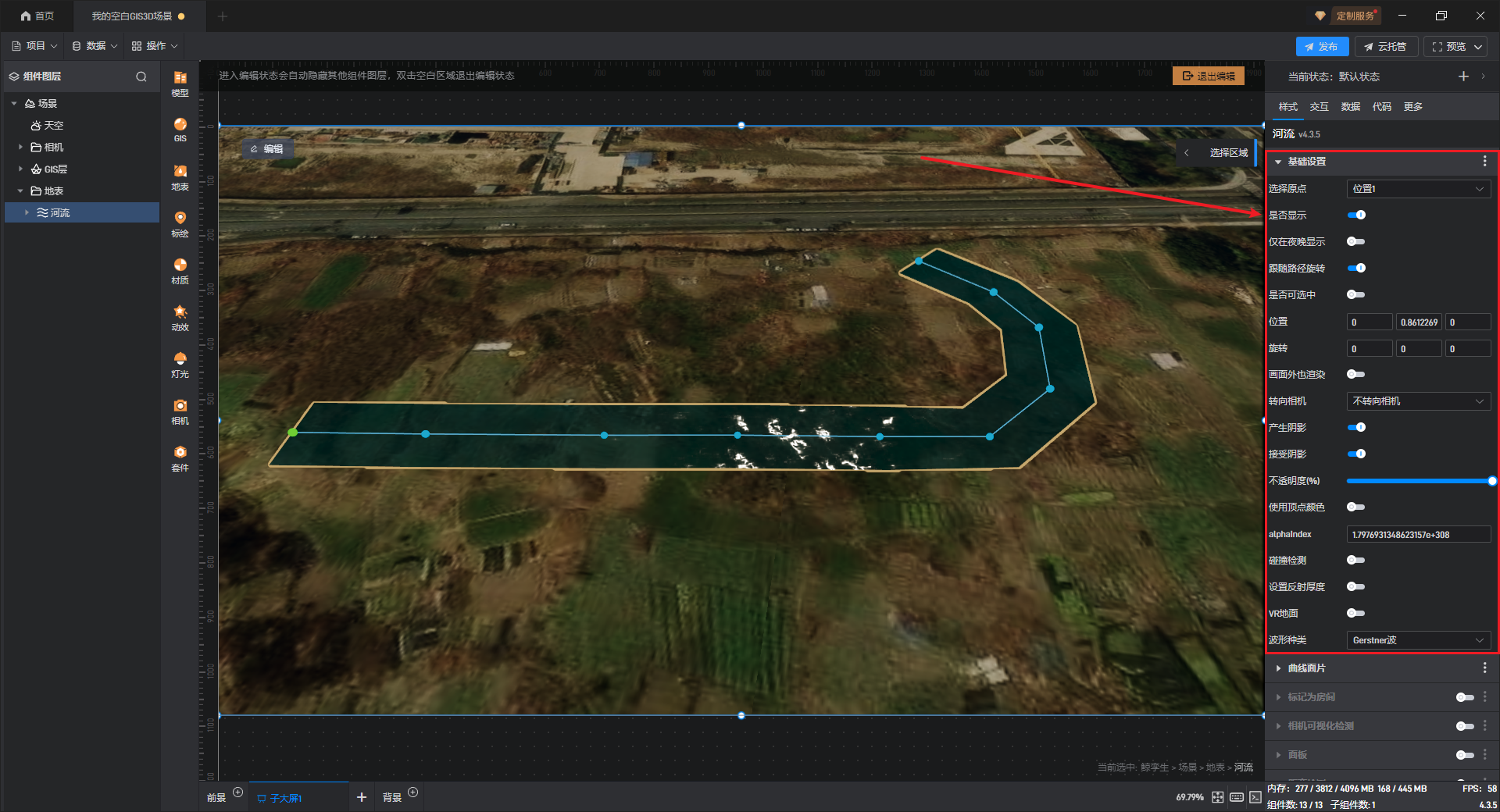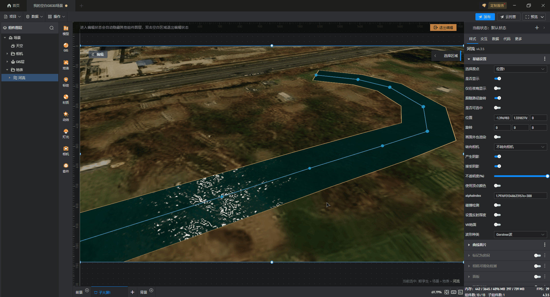 河流组件是鲸孪生内部的组件之一,属于水体类型之一,需要手动添加,可以删除,每一个鲸孪生组件可以添加多个河流。河流组件的样式主要分为六部分,分别是基础设置,曲线面片,标记为房间、相机可视化检测、面板和距离检测,下面分别进行介绍。