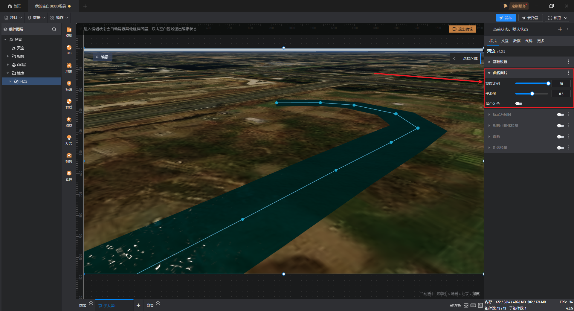 最后我们需要调整一下河流的宽度,选中河流组件,在“曲线面片”设置中增大“宽度比例”,如下图所示: