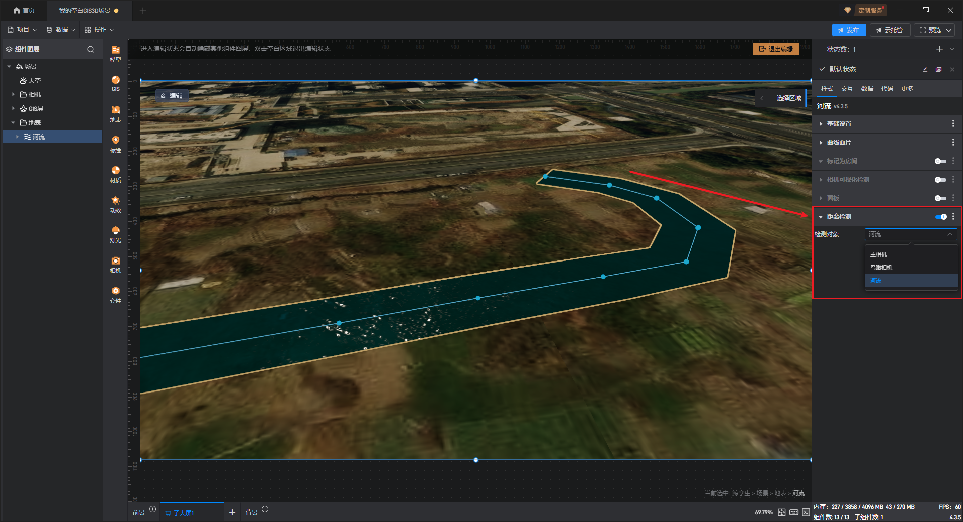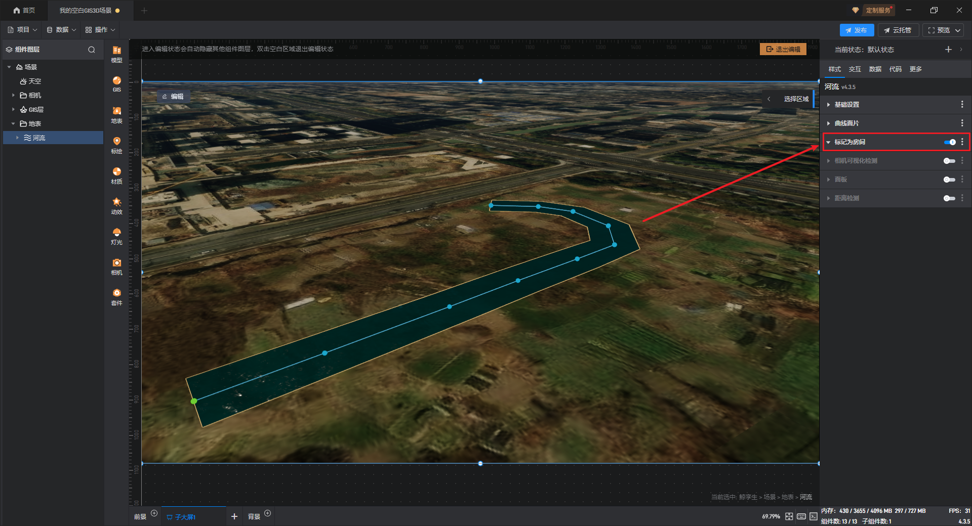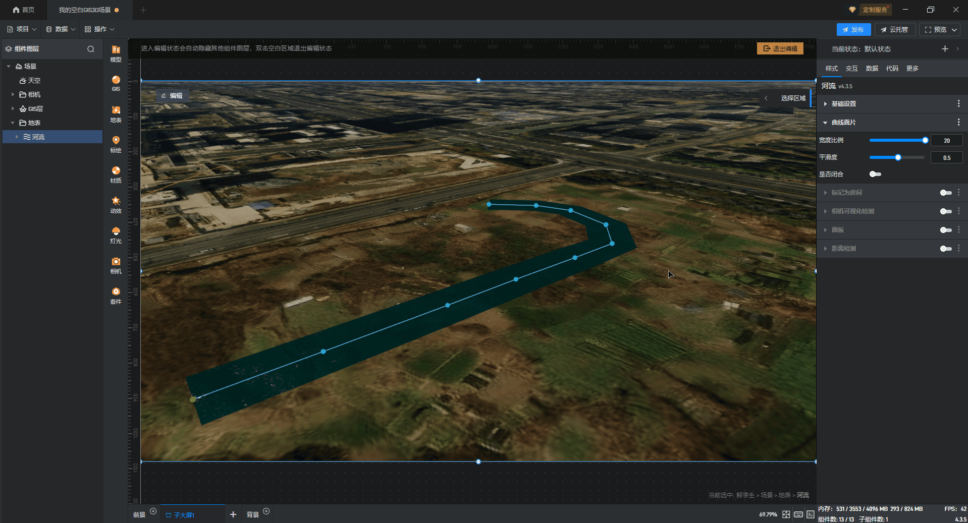 在工具栏中点击“地表”,选择“水体-河流”,将河流添加至场景中。