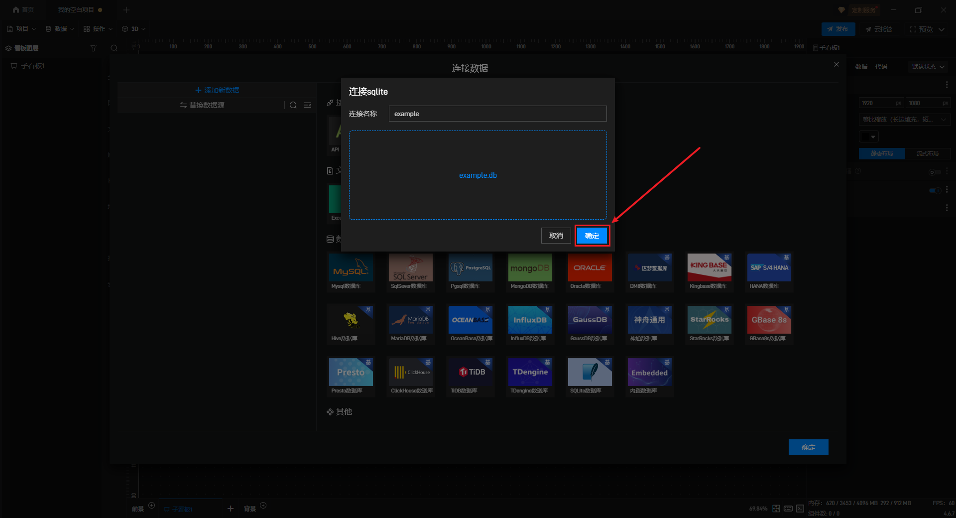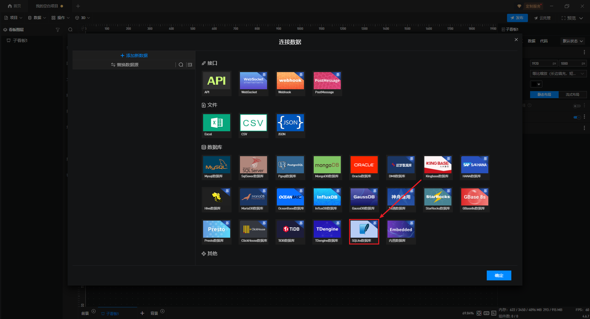 在数据源编辑窗口中,在左侧选择“添加新数据”选项卡,然后在右侧点击数据库分类中的“SQLite 数据库”选项框。