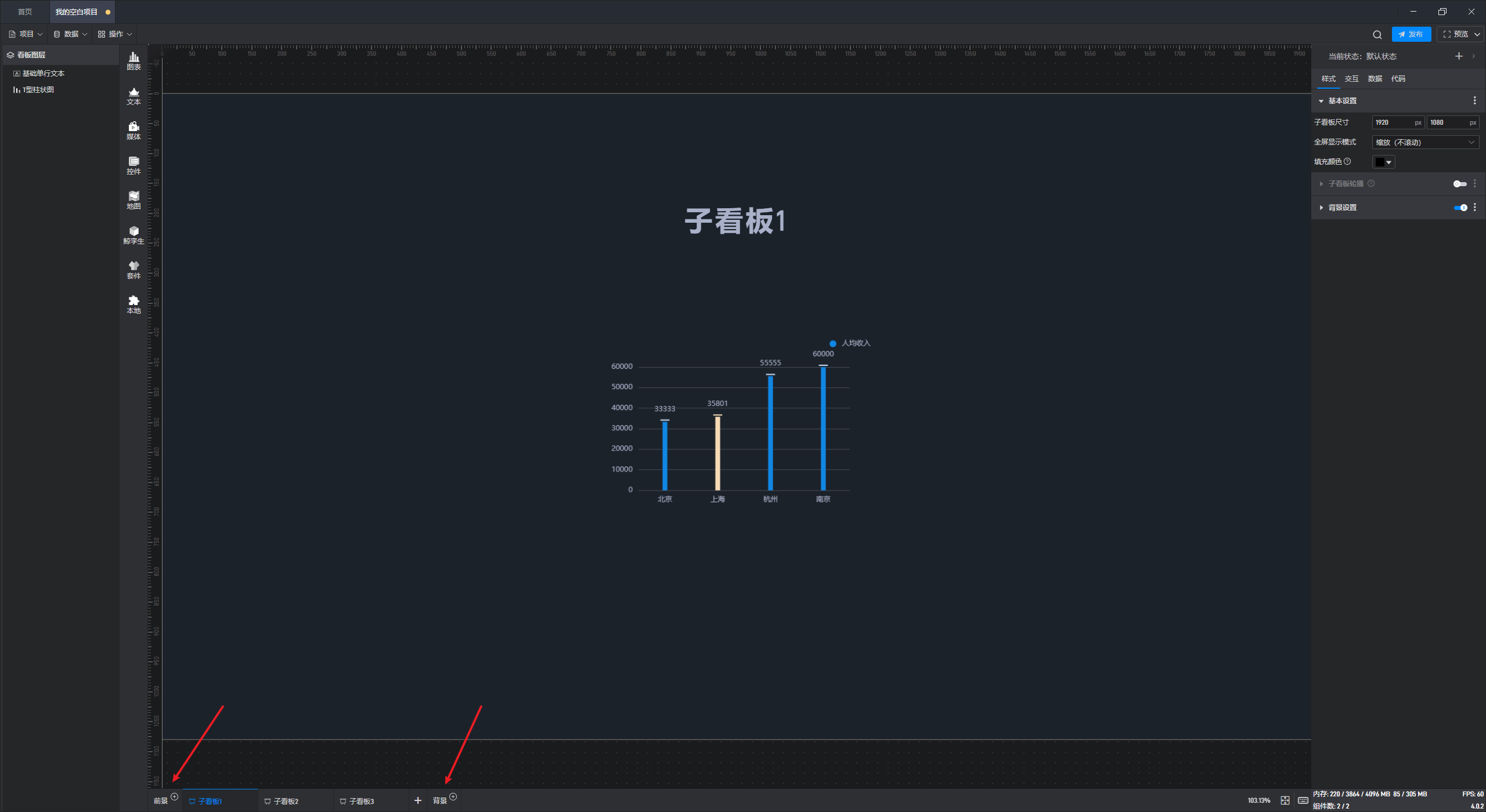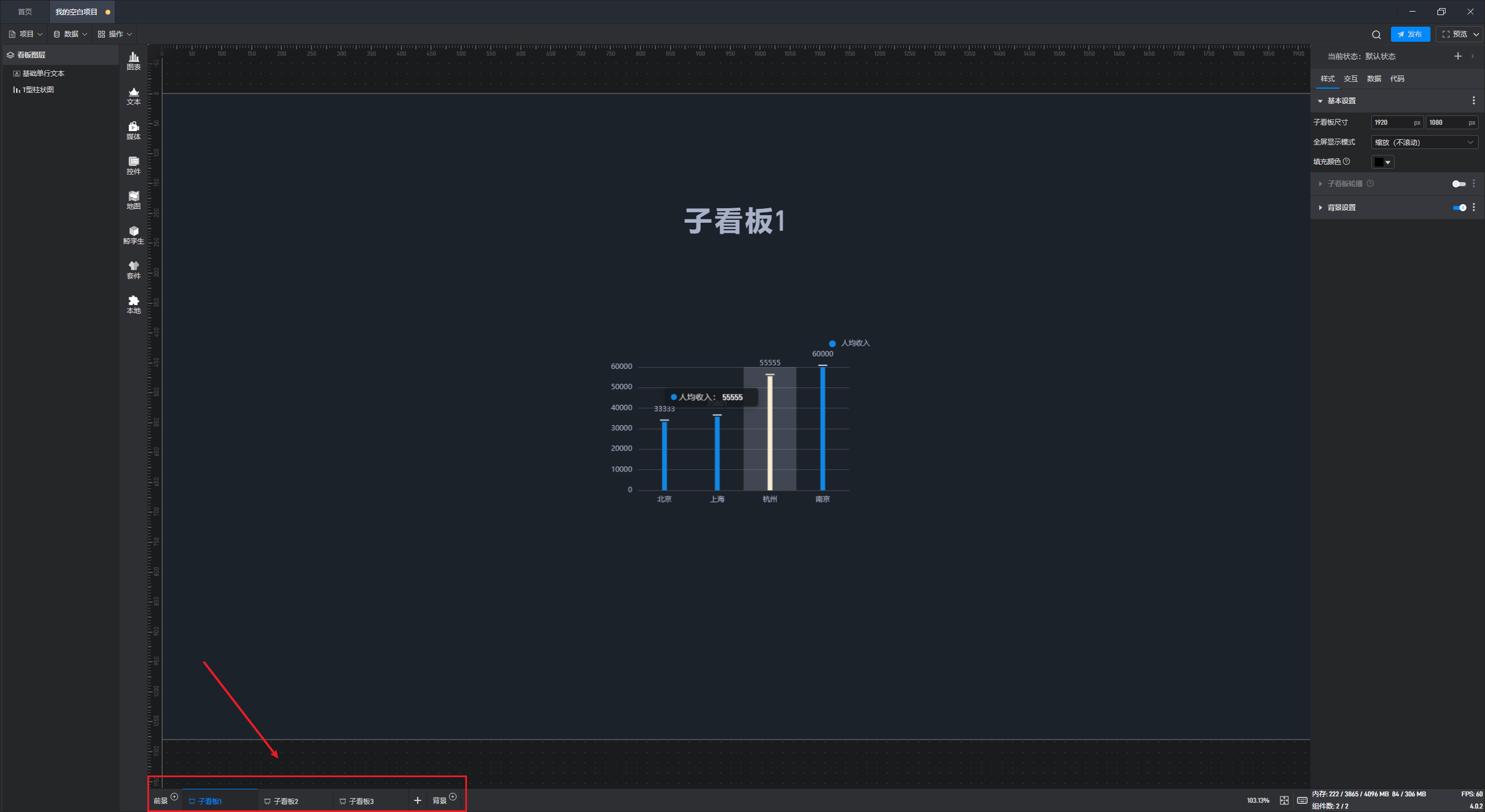 每一个项目是由多个子看板组成的,子看板之间通常是树状结构(例如,公司总部和子公司)或者平行结构(例如,公司的不同业务板块),一般会采用点击按钮进行跳转或者自动轮播展示。
