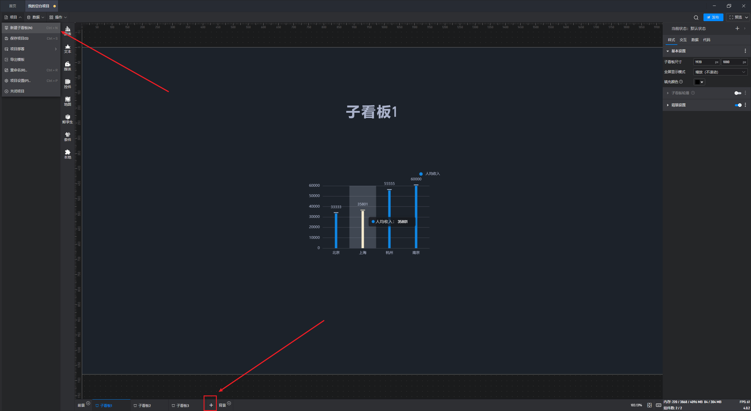 在新建项目时默认会创建一个子看板,我们也可以添加多个子看板,点击项目菜单中的“新建子看板”或者标签栏的加号按钮即可。