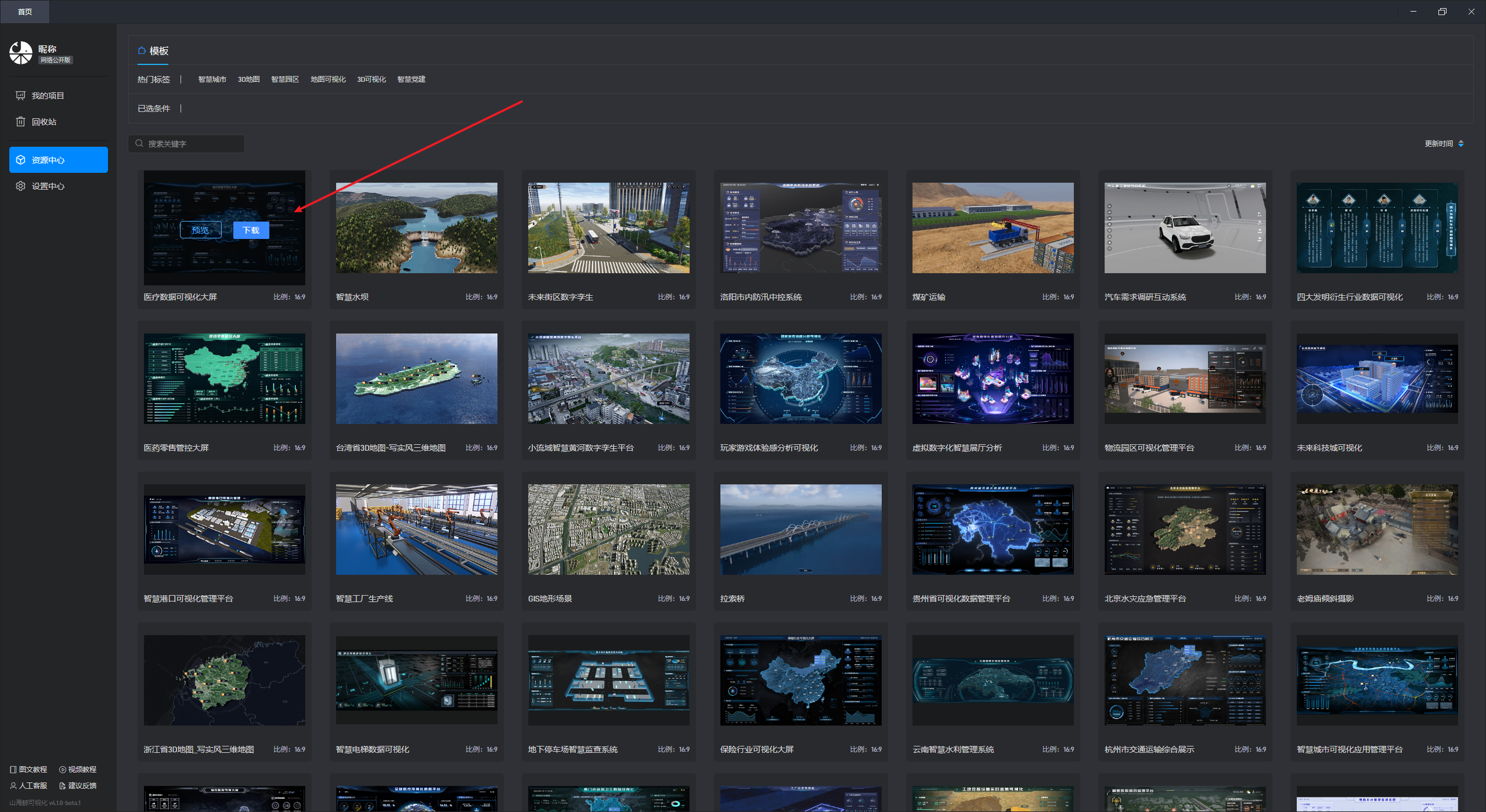 在资源中心中,我们可以通过搜索找到想要的大屏模板,然后进行预览和下载。