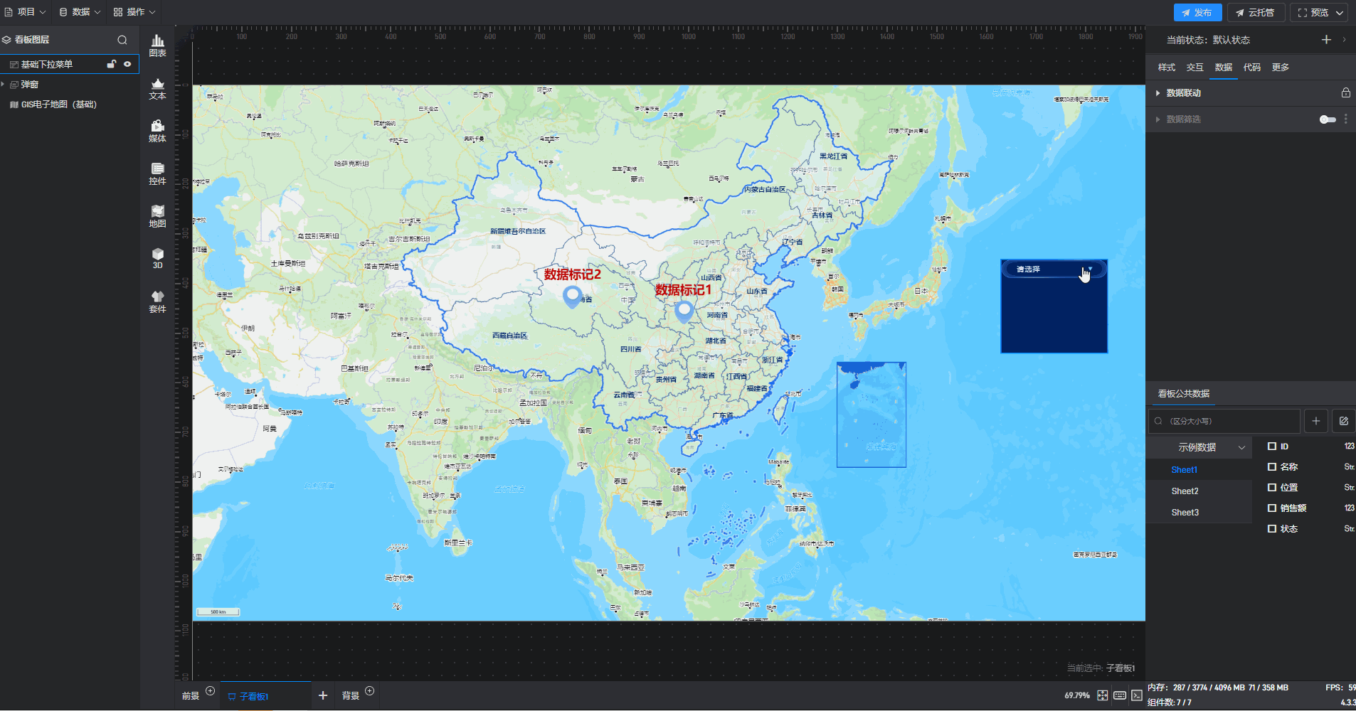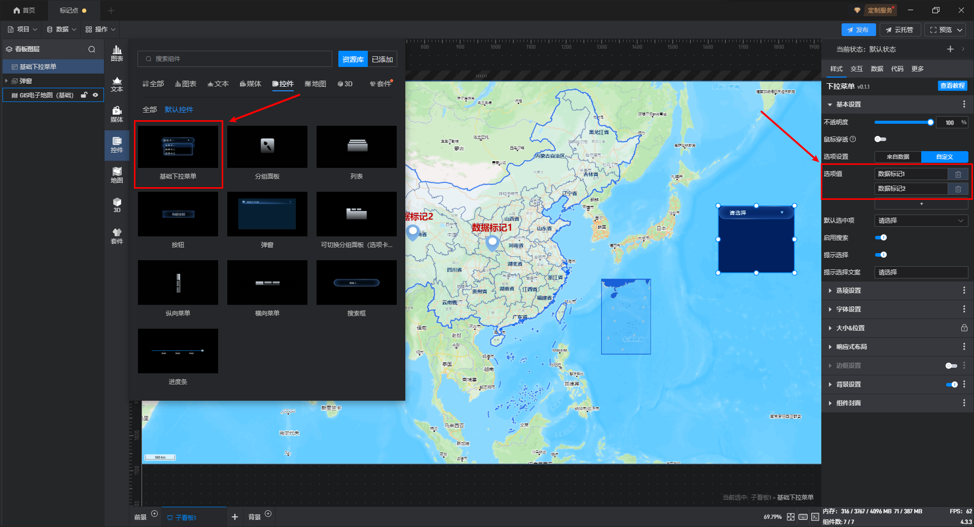 有的时候我们希望只显示符合条件的标记点,这时就要用到标记点筛选了,我们在画面中添加一个下拉菜单组件,并添加“数据标记 1”和“数据标记 2”两个选项。
