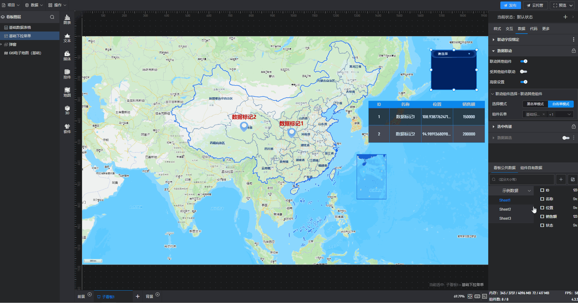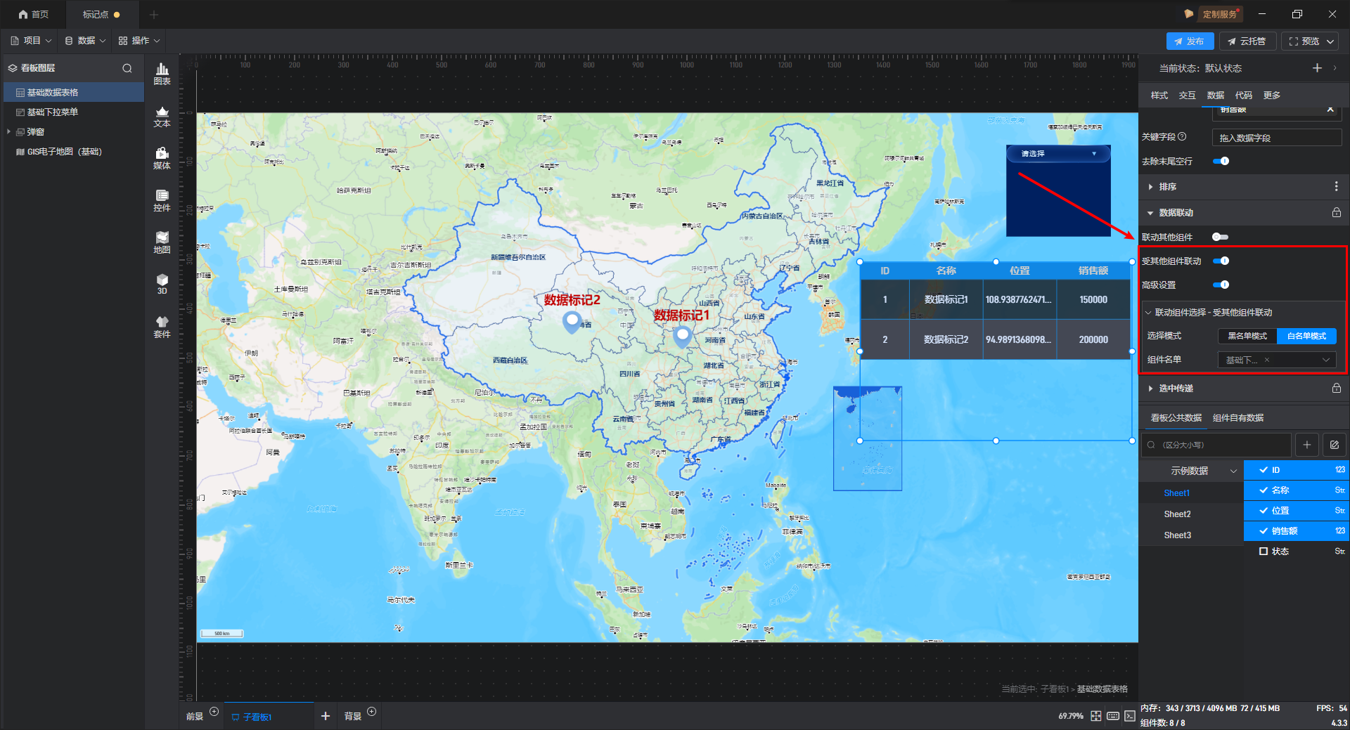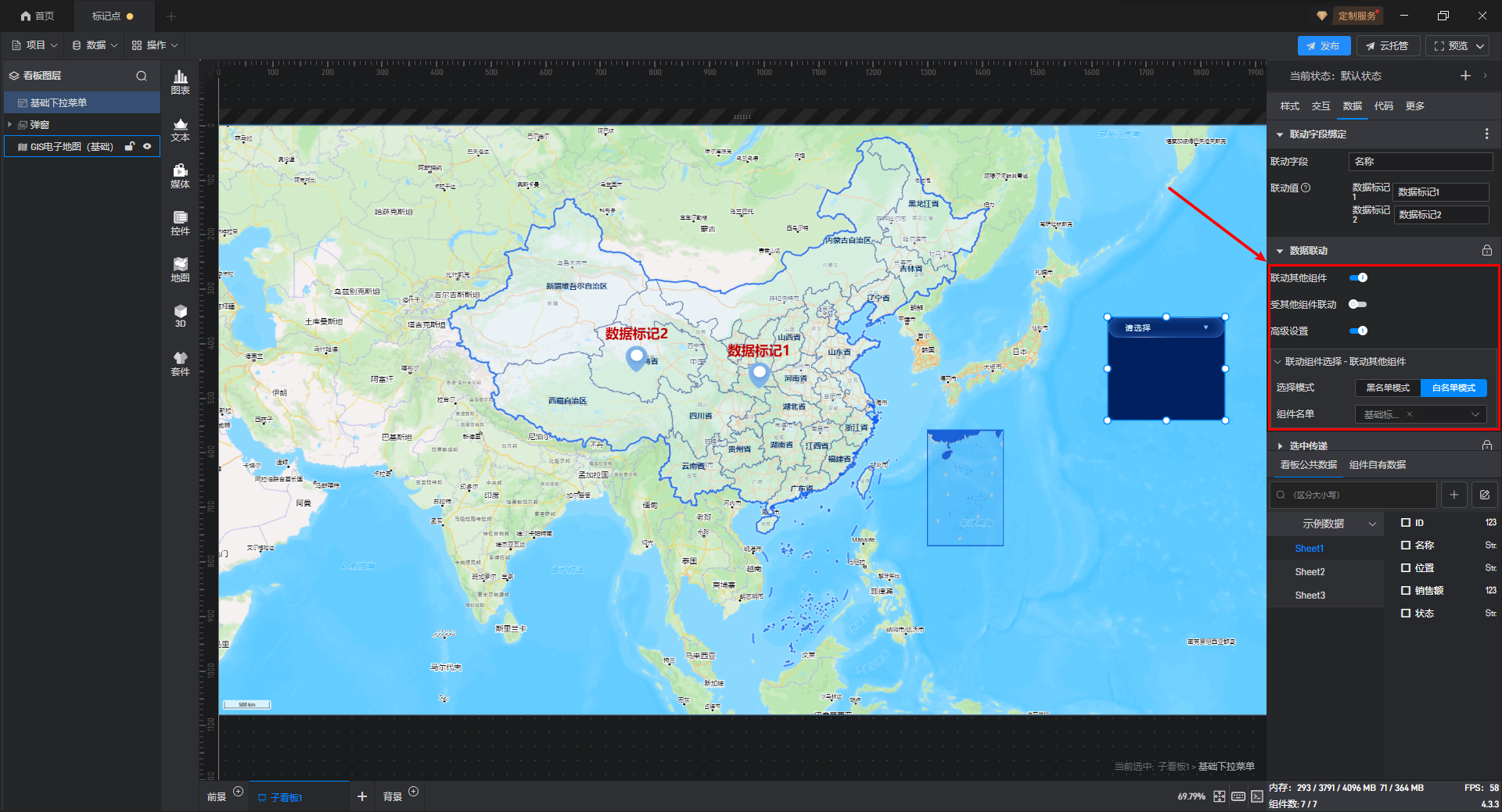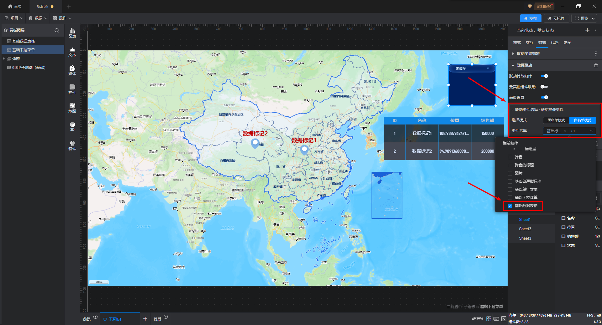 然后我们双击进入 GIS 电子地图编辑模式,将“基础标记组”也打开受其他组件联动,同样,如果希望精准控制,也可以打开高级设置,选择受其他组件联动,并切换成白名单模式,选择为下拉菜单组件。