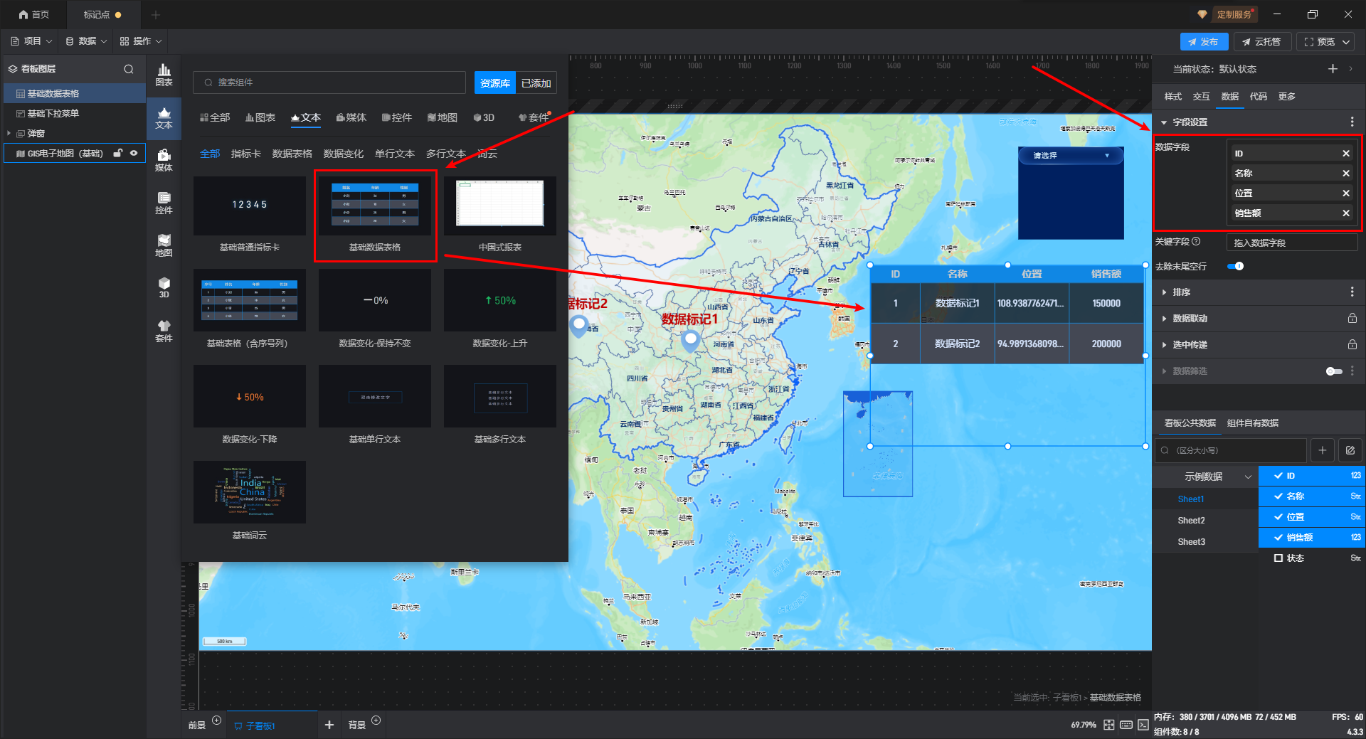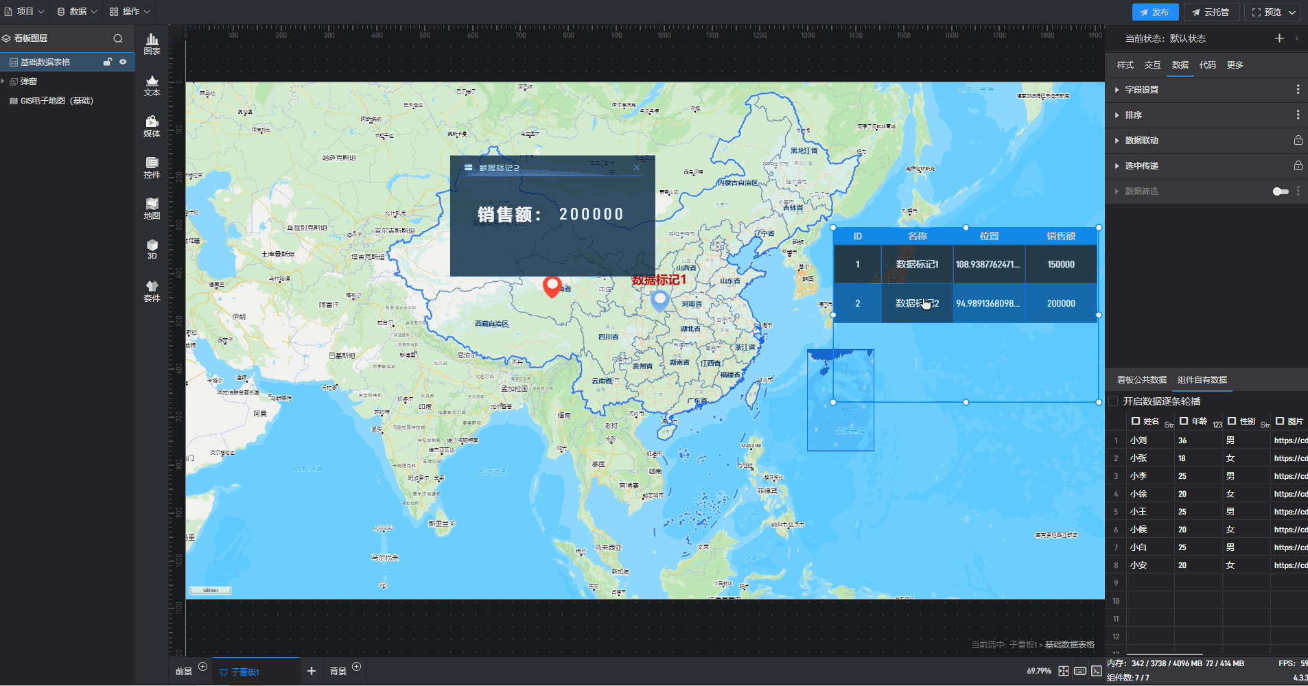 此时我们选中数据表格组件的某一行后,对应的标记点就会被自动选中。