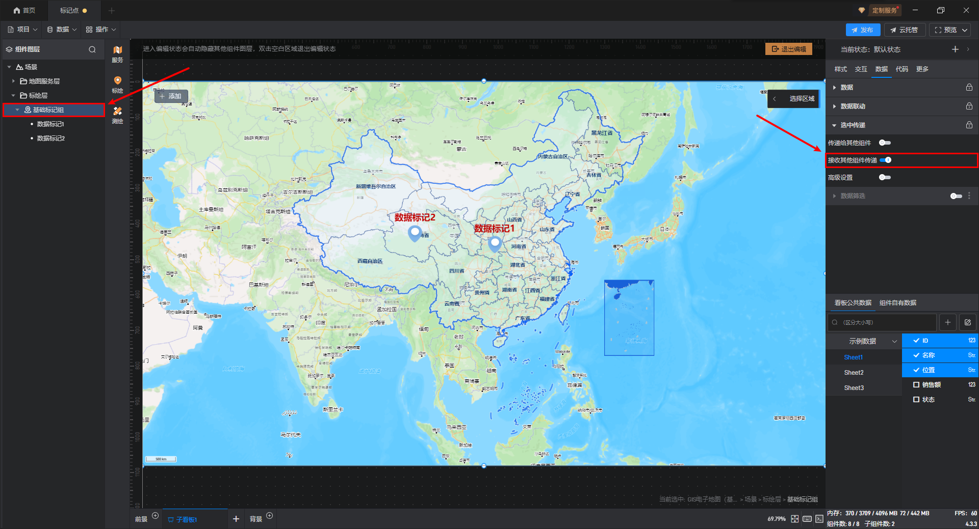 下面我们希望选中数据表格组件的一行,同时也能自动选中对应的标记点,这个设置很简单。和筛选联动一样,我们只需要设置打开触发一方的选中传递和接受一方的选中传递即可。我们首先打开数据表格组件的选中传递。