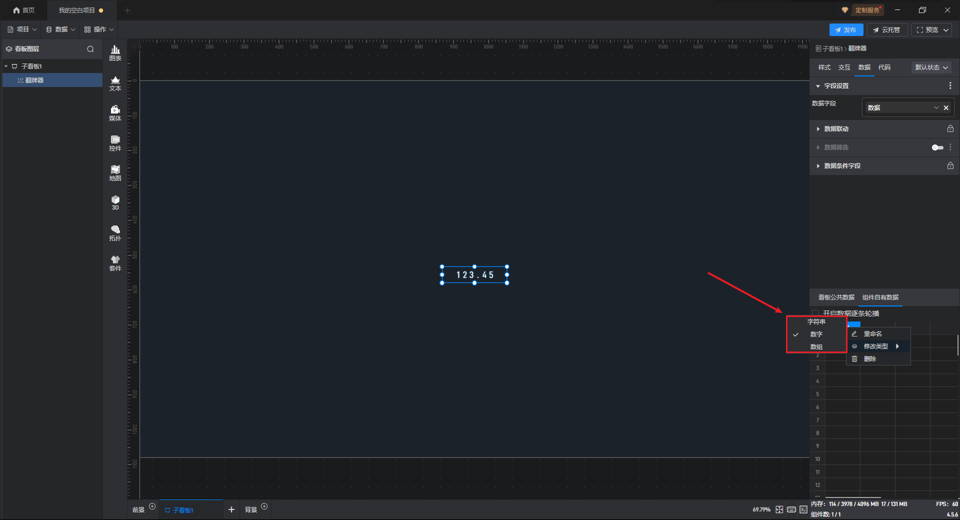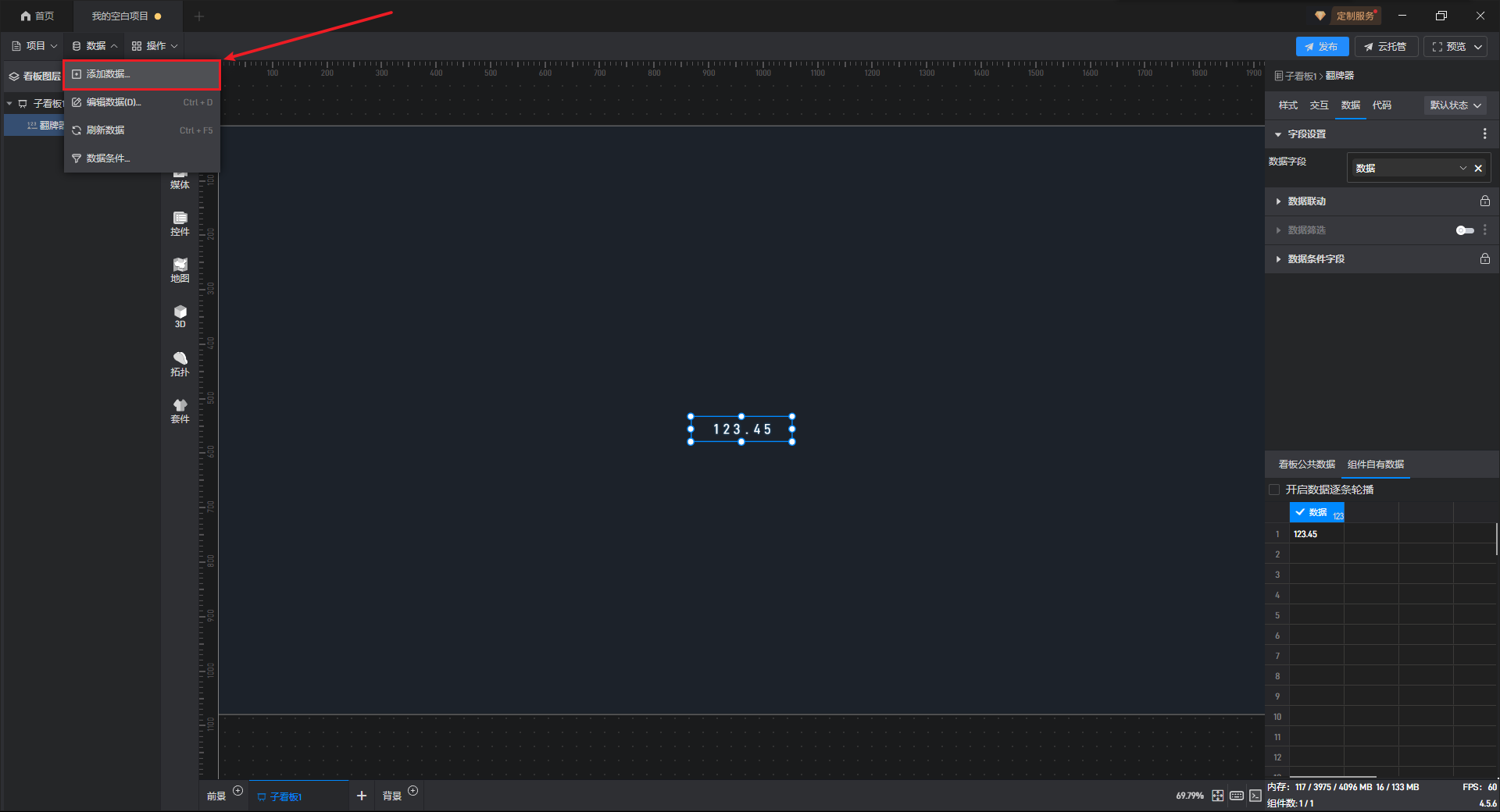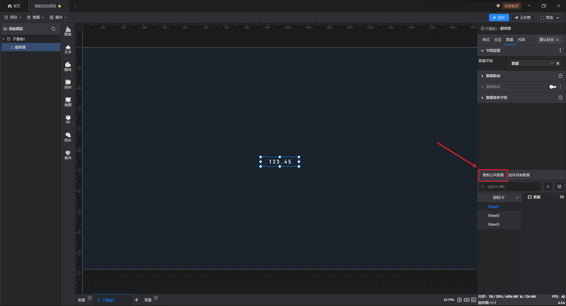 点击选中组件,在右侧“数据”设置窗口中切换到“看板公共数据”(同一个项目中所有数据源是共享的)。