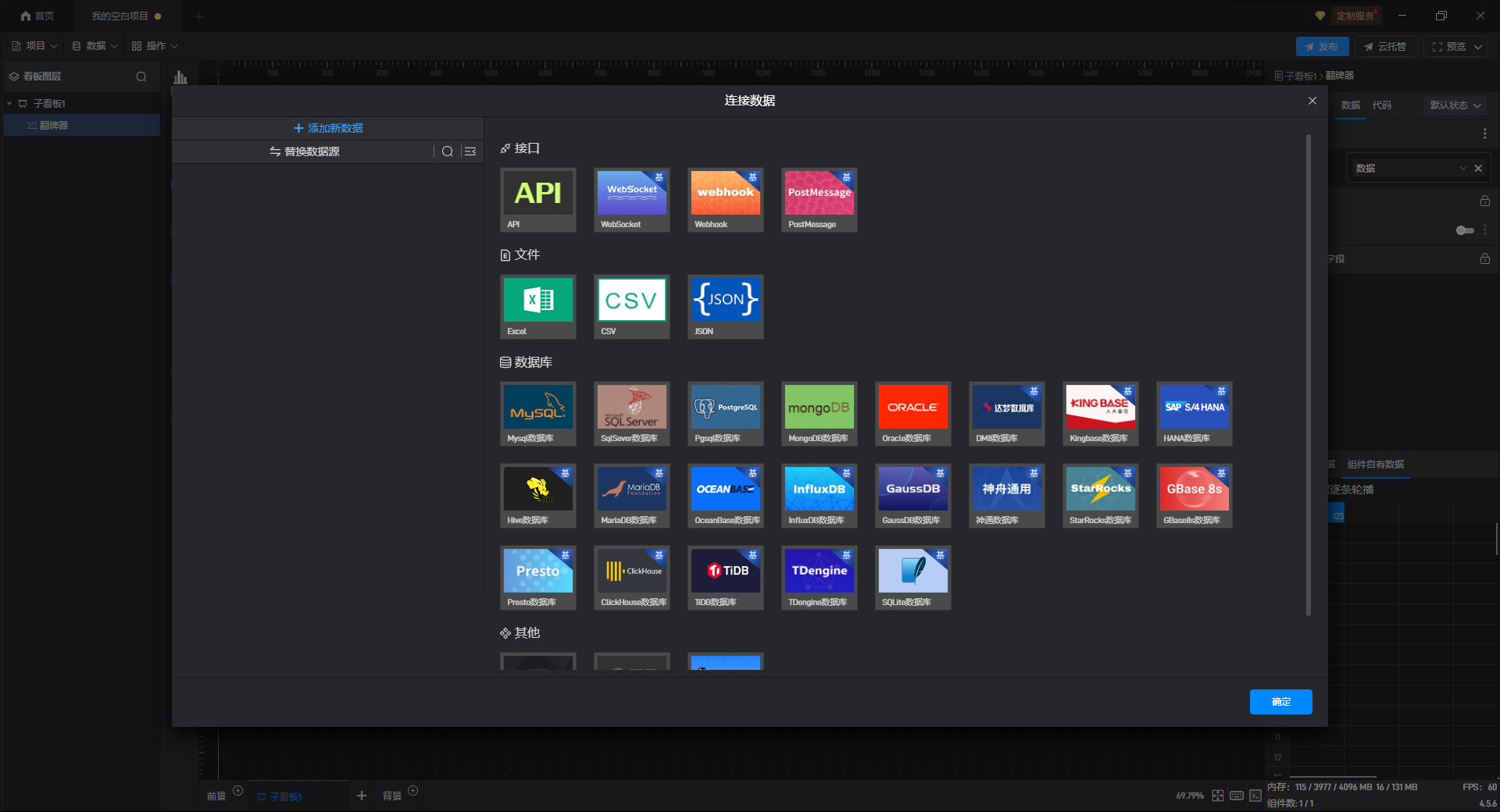 在“连接数据”的窗口中,选择对应的数据源类型。