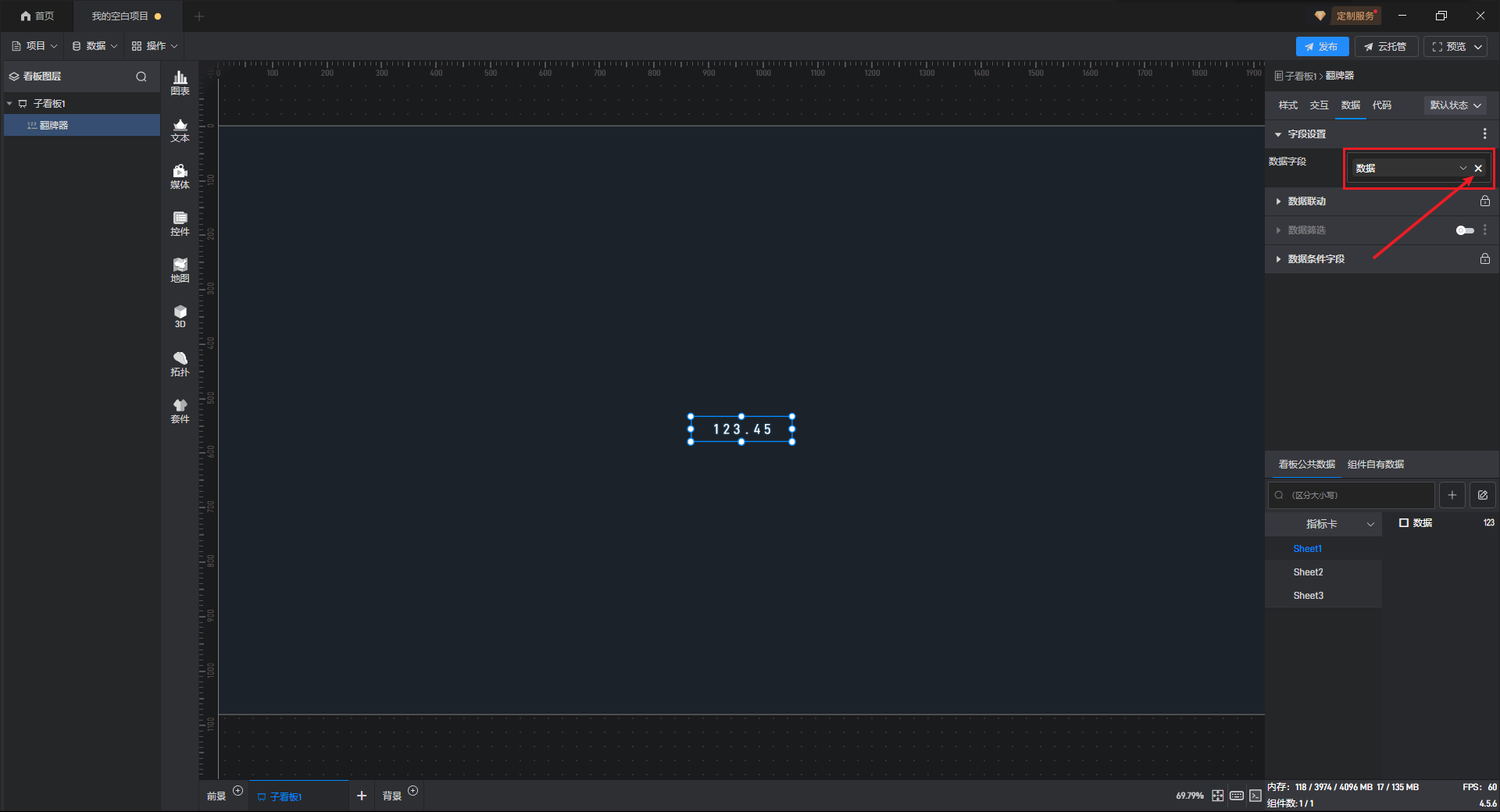 单击选中组件,在右侧“数据”设置窗口中,可以看到组件已经设置好了数据字段,且数据字段来自于“组件自有数据”。