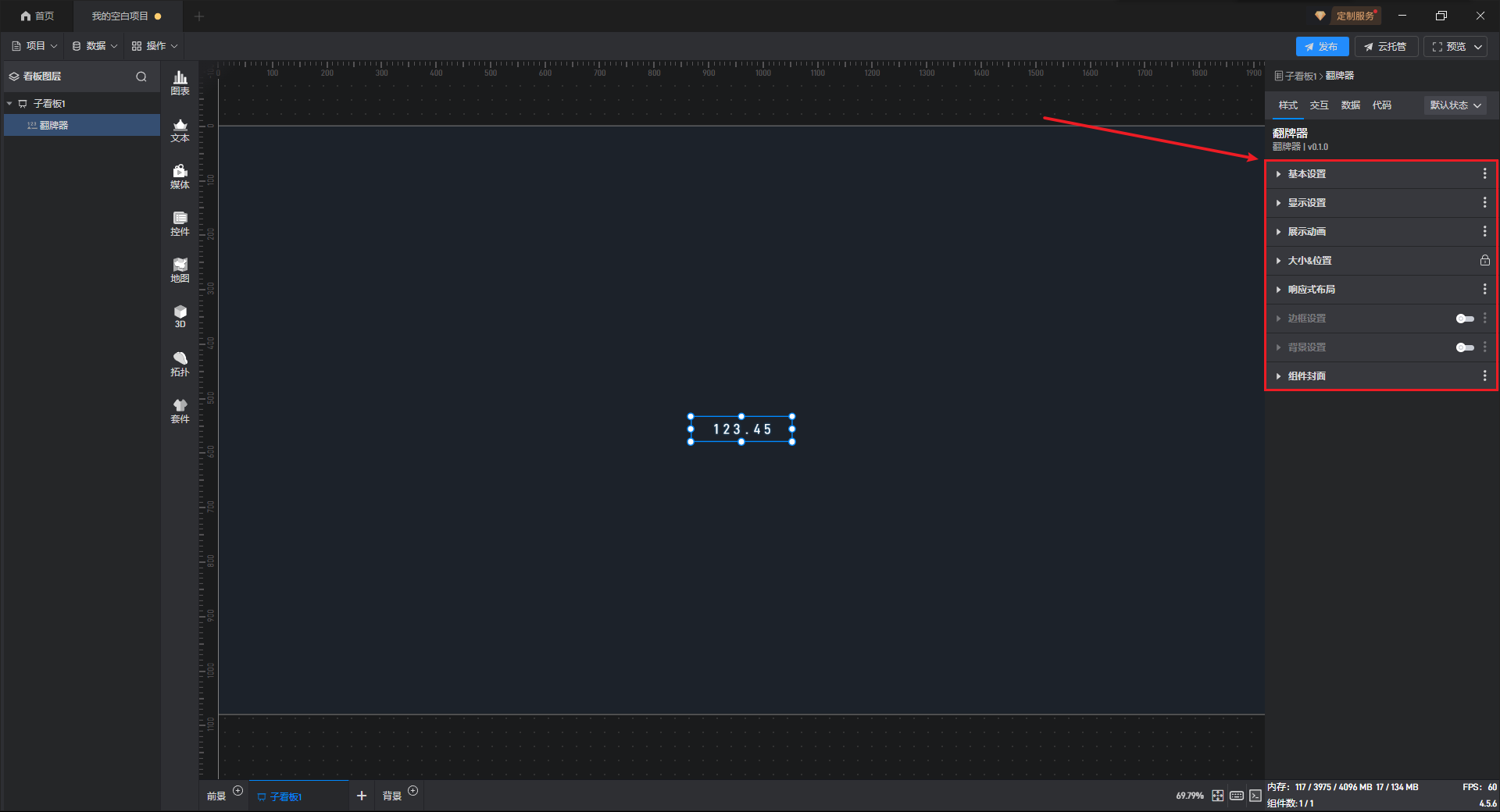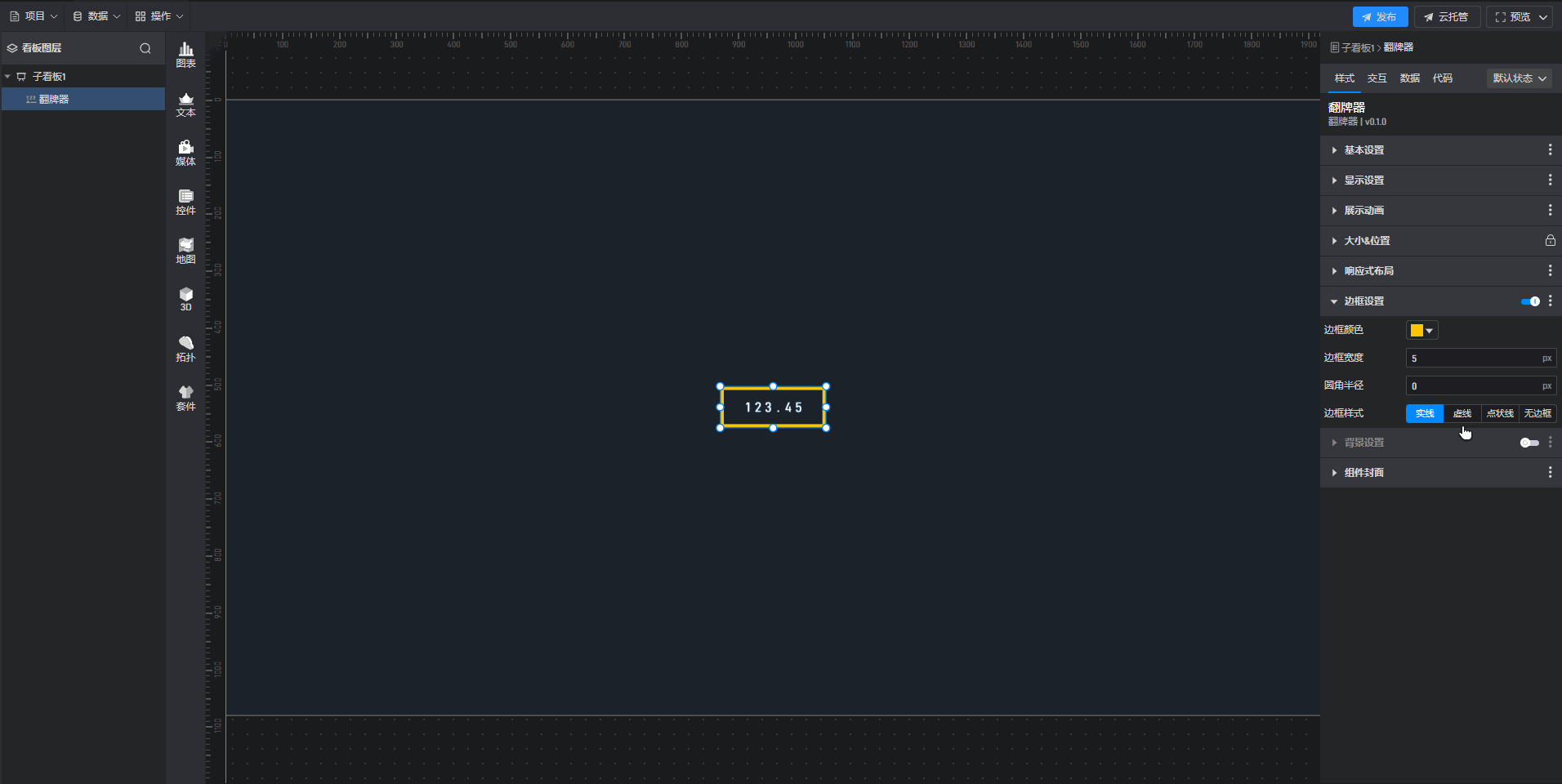 在样式中可以设置翻牌器组件的位置、颜色、坐标轴、提示信息和动画等。