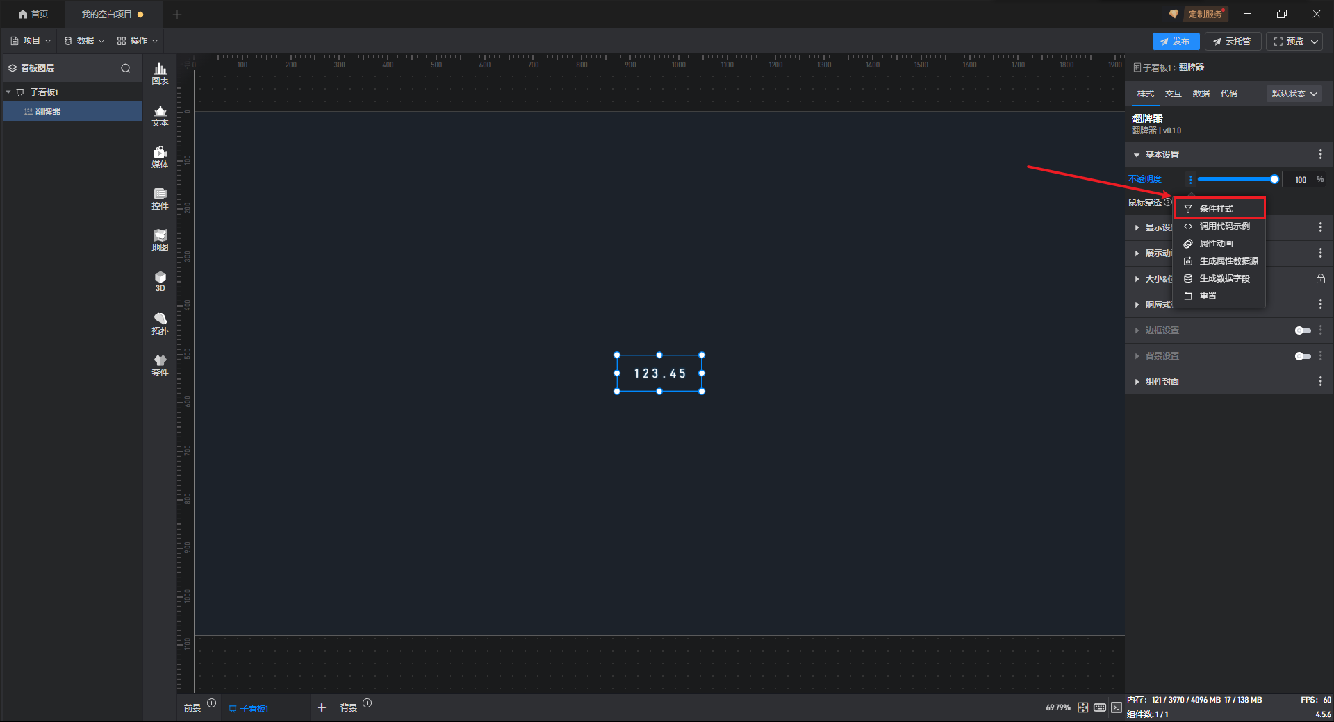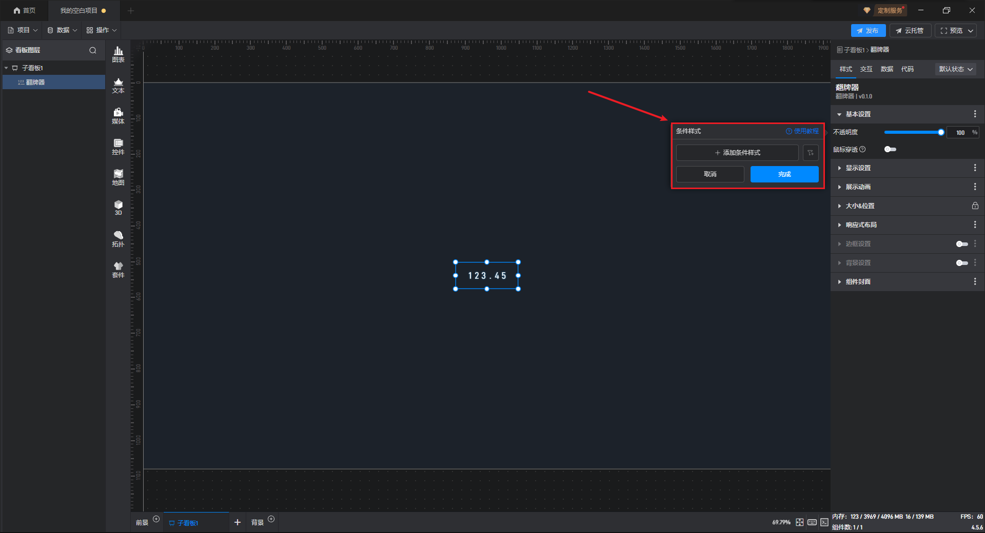 有一些设置项的条件设置方式会直接显示在设置项中,可以直接进行设置,例如比较常用的一个设置就是根据数据条件来改变组件的颜色,但翻牌器组件目前未提供直接在设置项中设置条件样式的方法。