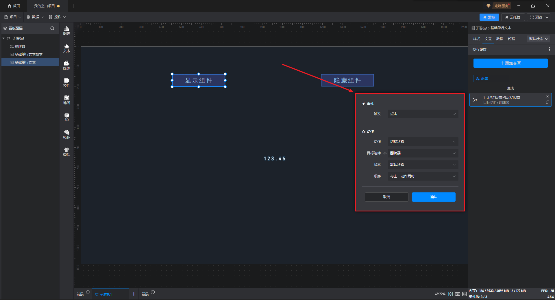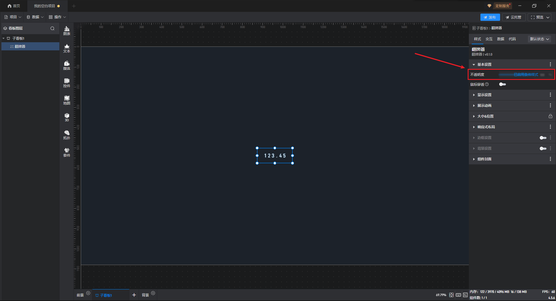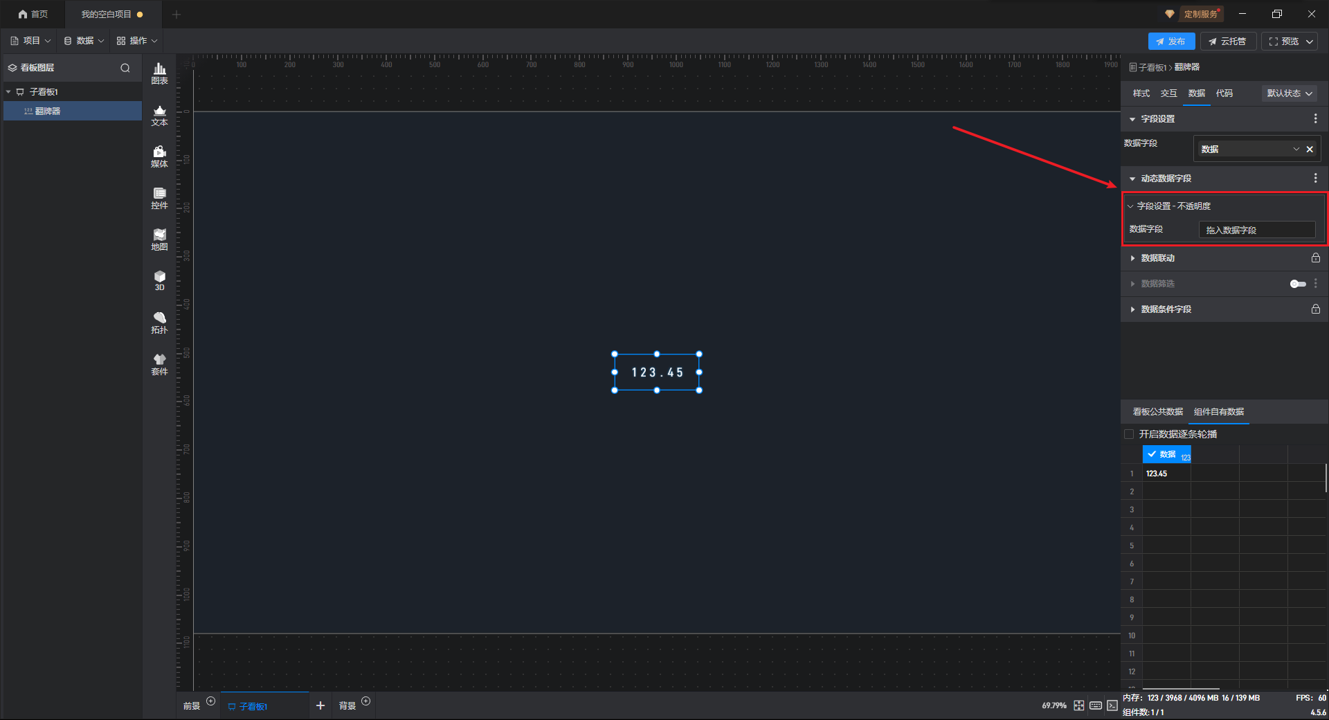 这里我们添加的数据字段中,数值是 0,所以最终效果是,通过动态数据字段将不透明度的数值修改为 0,从而让组件变成了隐藏。