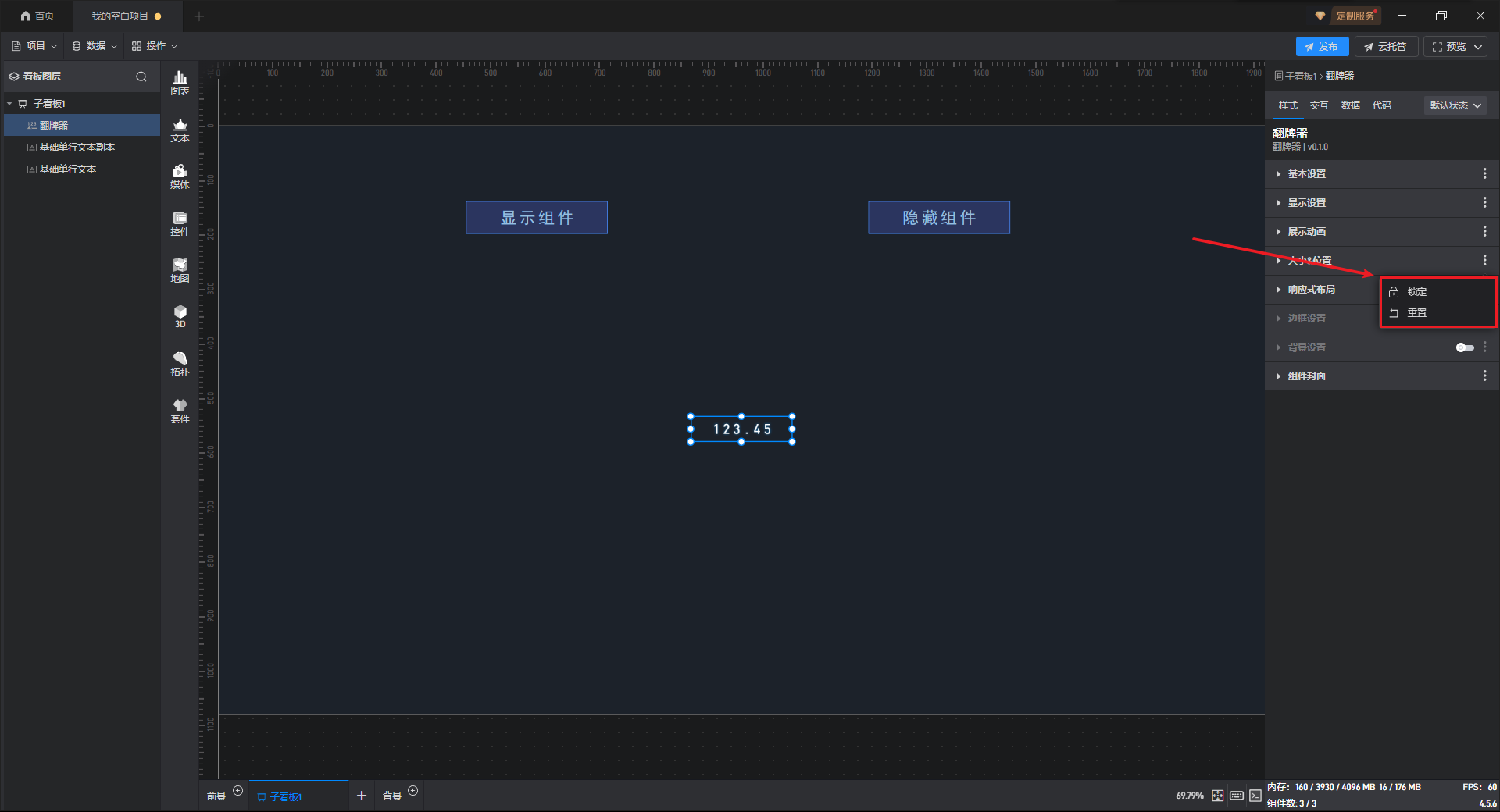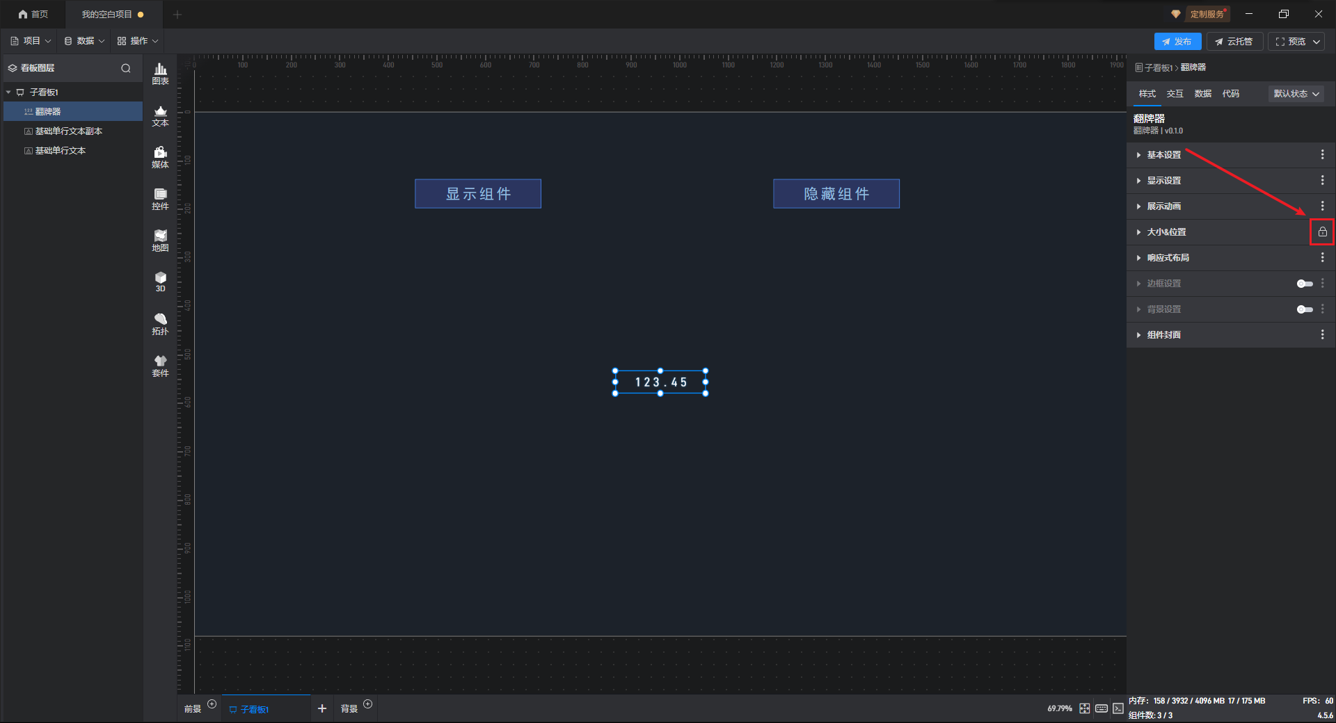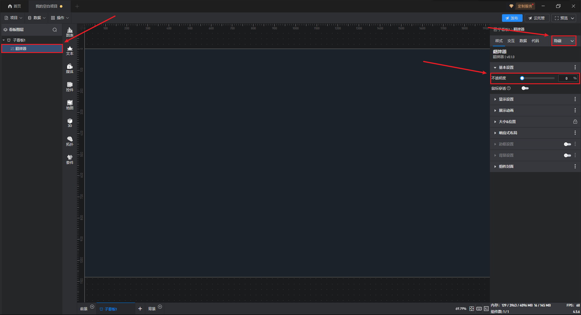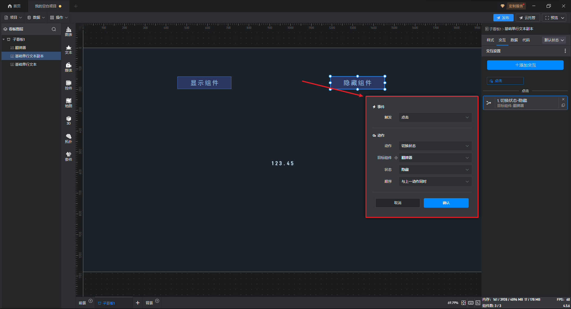 这里我们添加的数据字段中,数值是 0,所以最终效果是,通过动态数据字段将不透明度的数值修改为 0,从而让组件变成了隐藏。