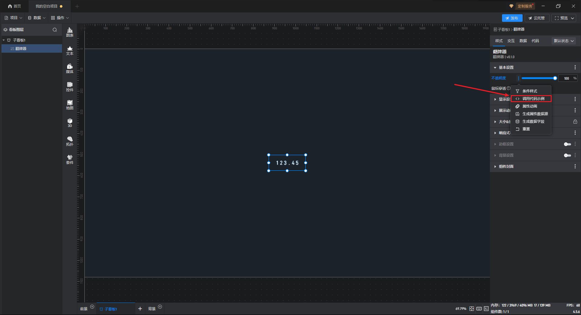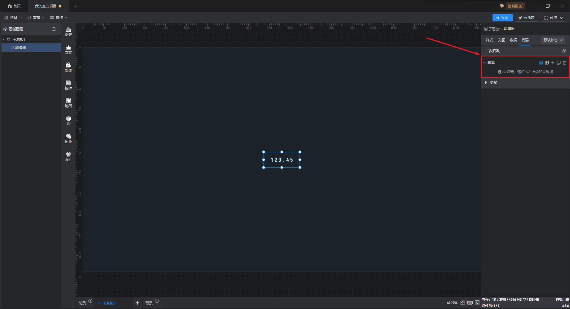 点击选中组件,在右侧设置窗口中切换到“代码”,可以对组件进行二次开发设置。