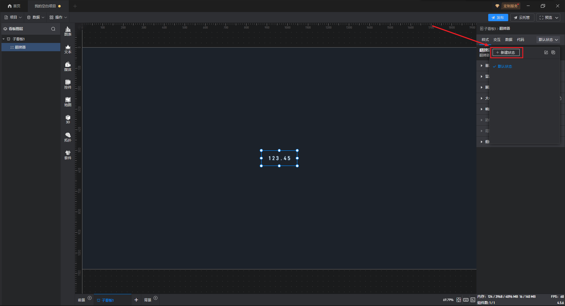 多状态主要用于通过数据条件或是点击交互(通常是点击其他组件来触发本组件的状态切换)来切换组件设置项的场景,这里的设置项包括组件的样式、交互、数据和代码。
