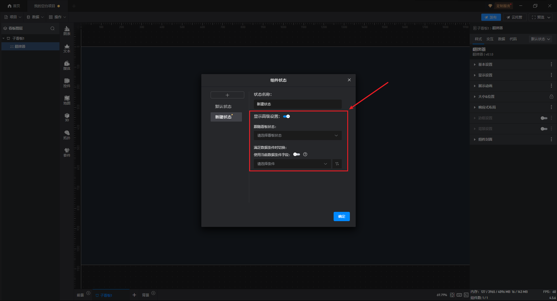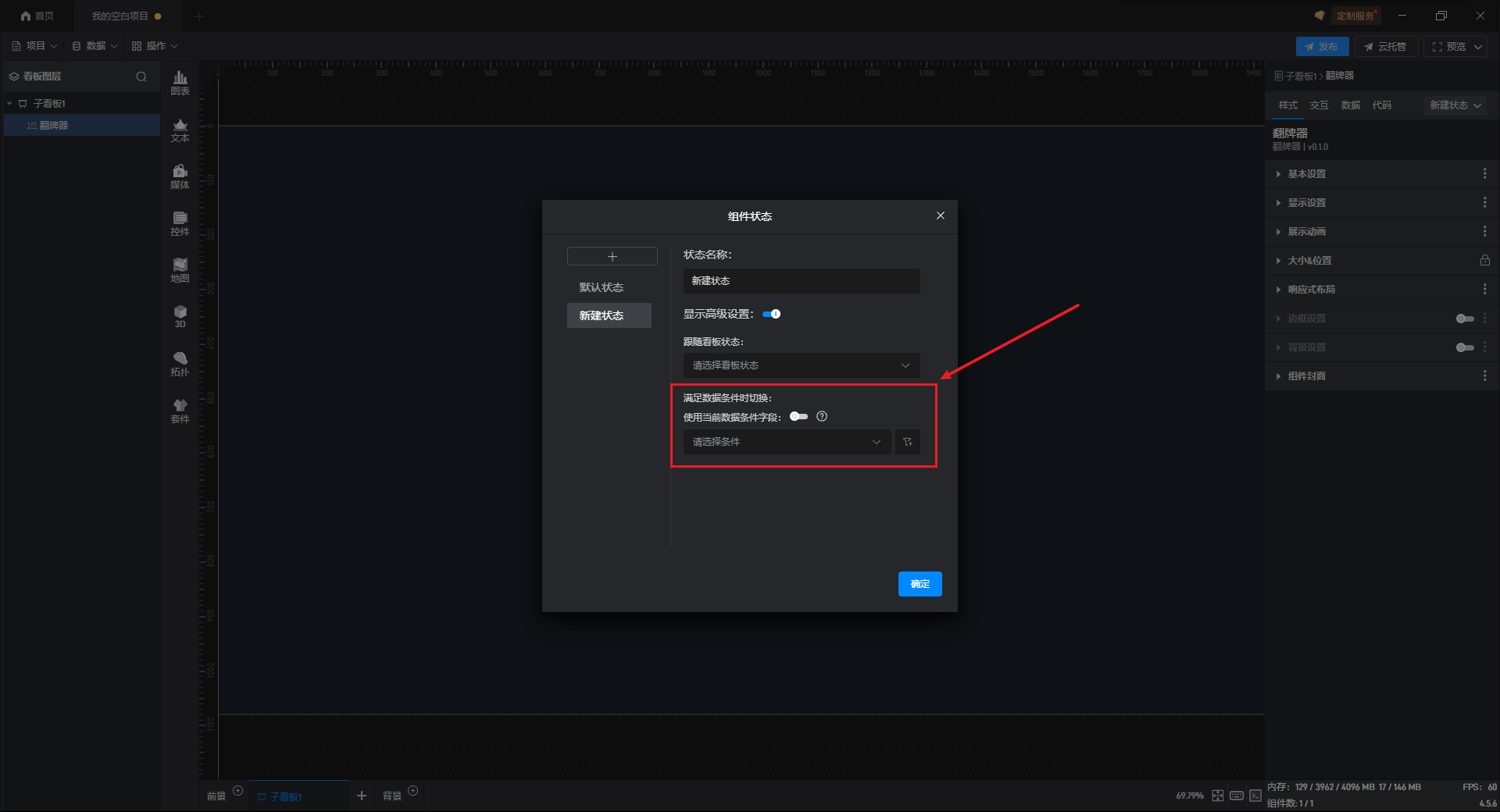 在这里我们可以选择已设置的数据条件,从而在数据条件满足时,组件的状态就会发生变化。
