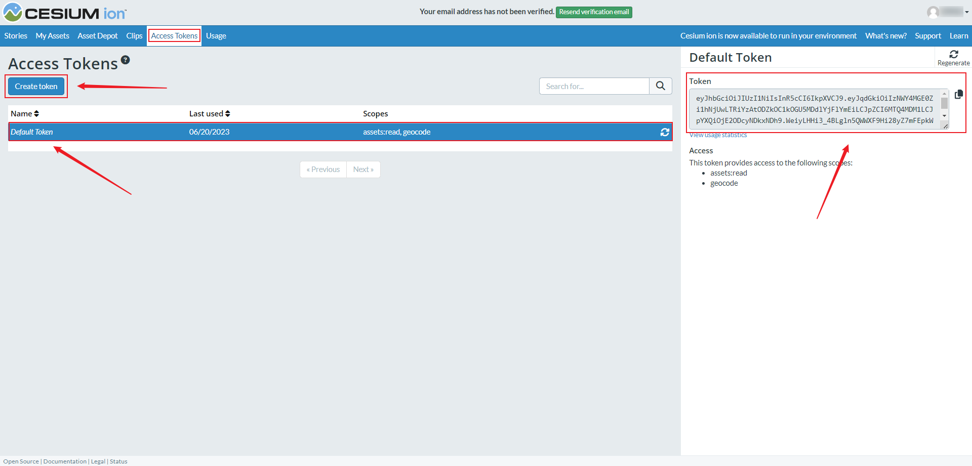 3)在登陆后的Cesium ion 页面中点击“Access Tokens”,点击“Create Token”可以创建 Token,或者点击“Default Token”选择默认 Token,并在右侧将其复制。