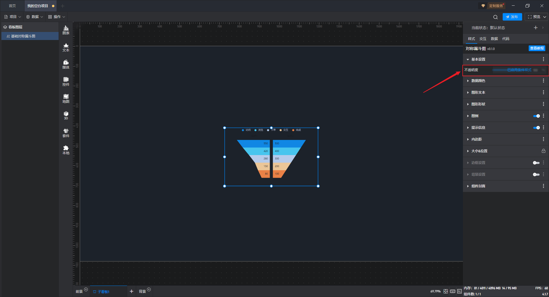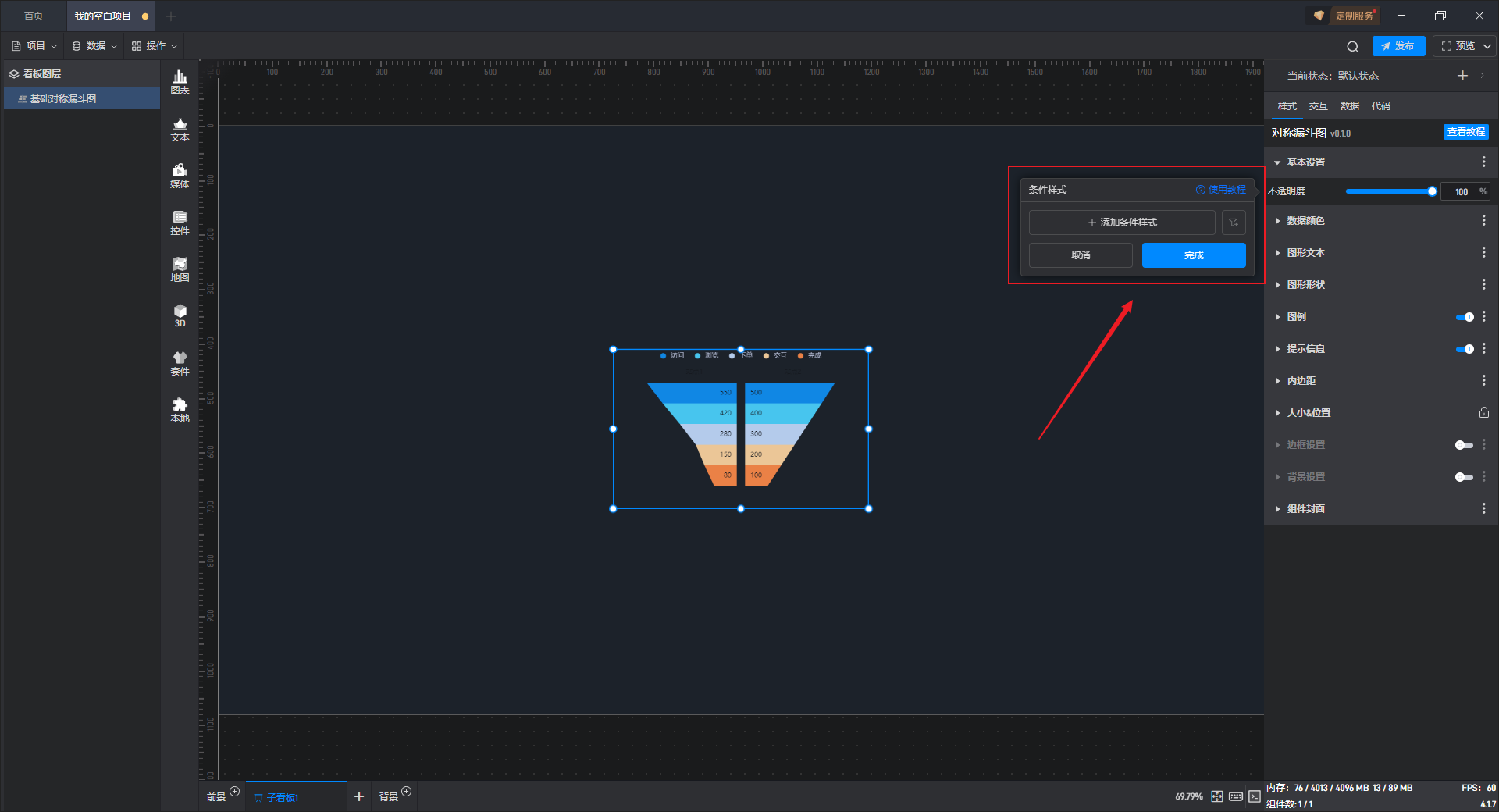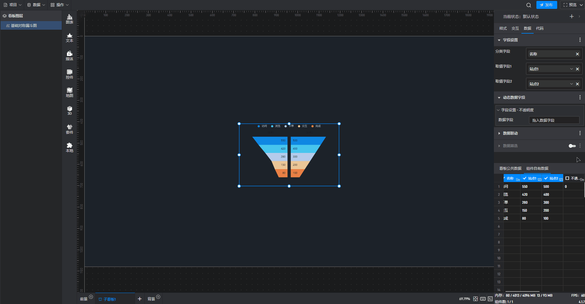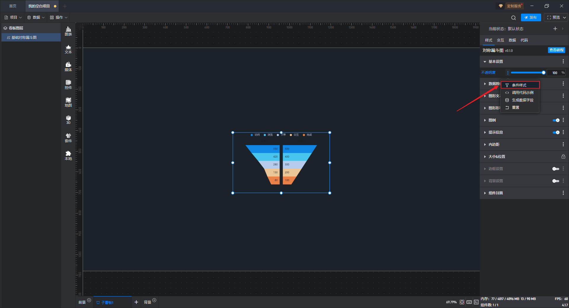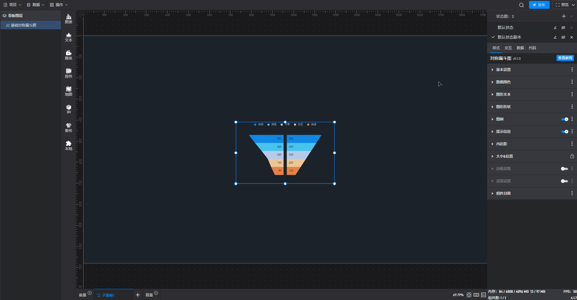 基础对称漏斗图是漏斗图组件的一种预设样式,包含了漏斗图组件所有的功能。