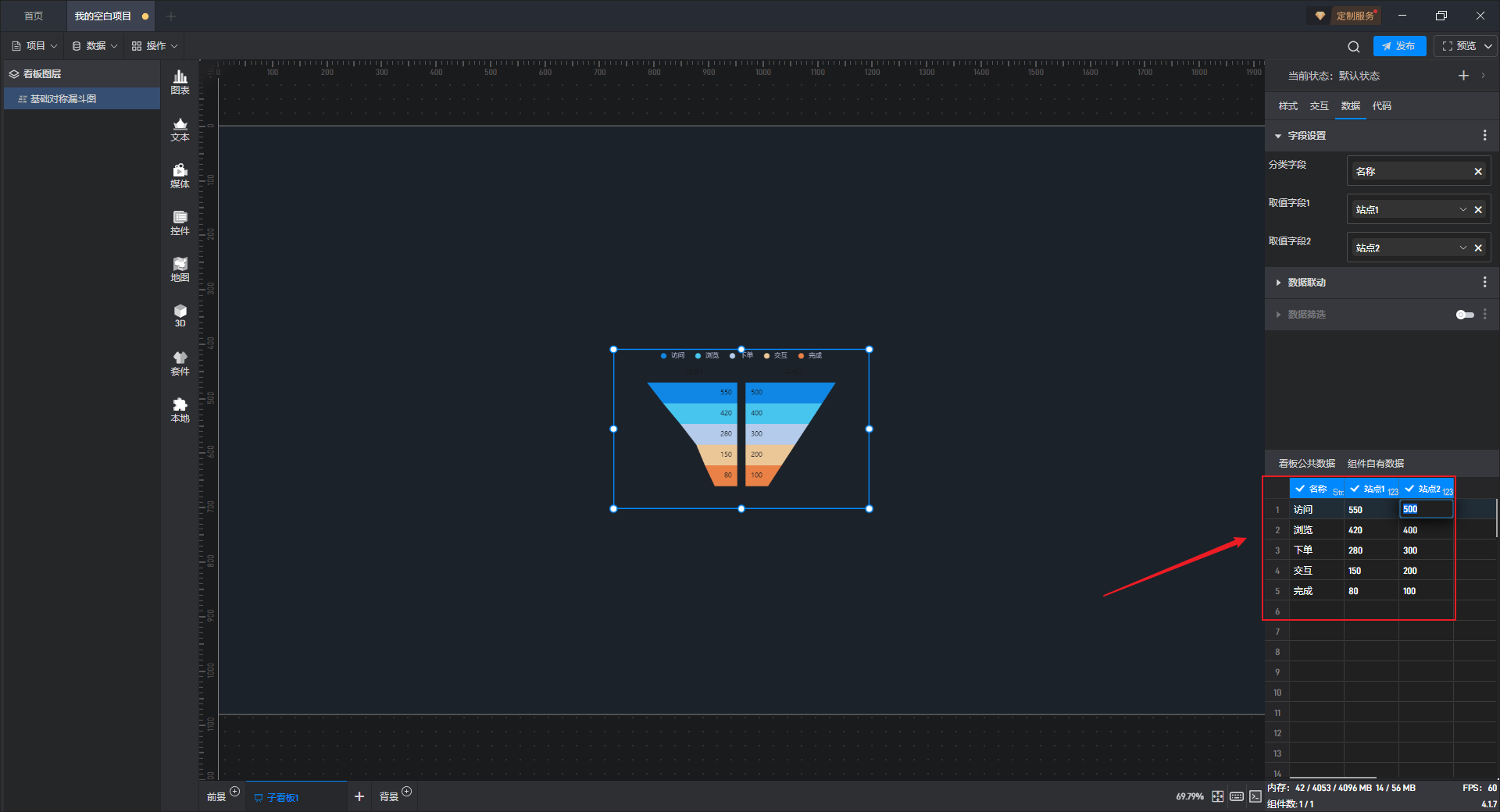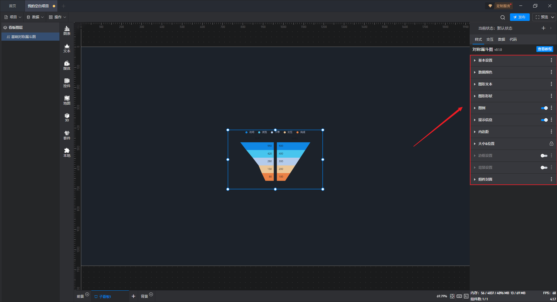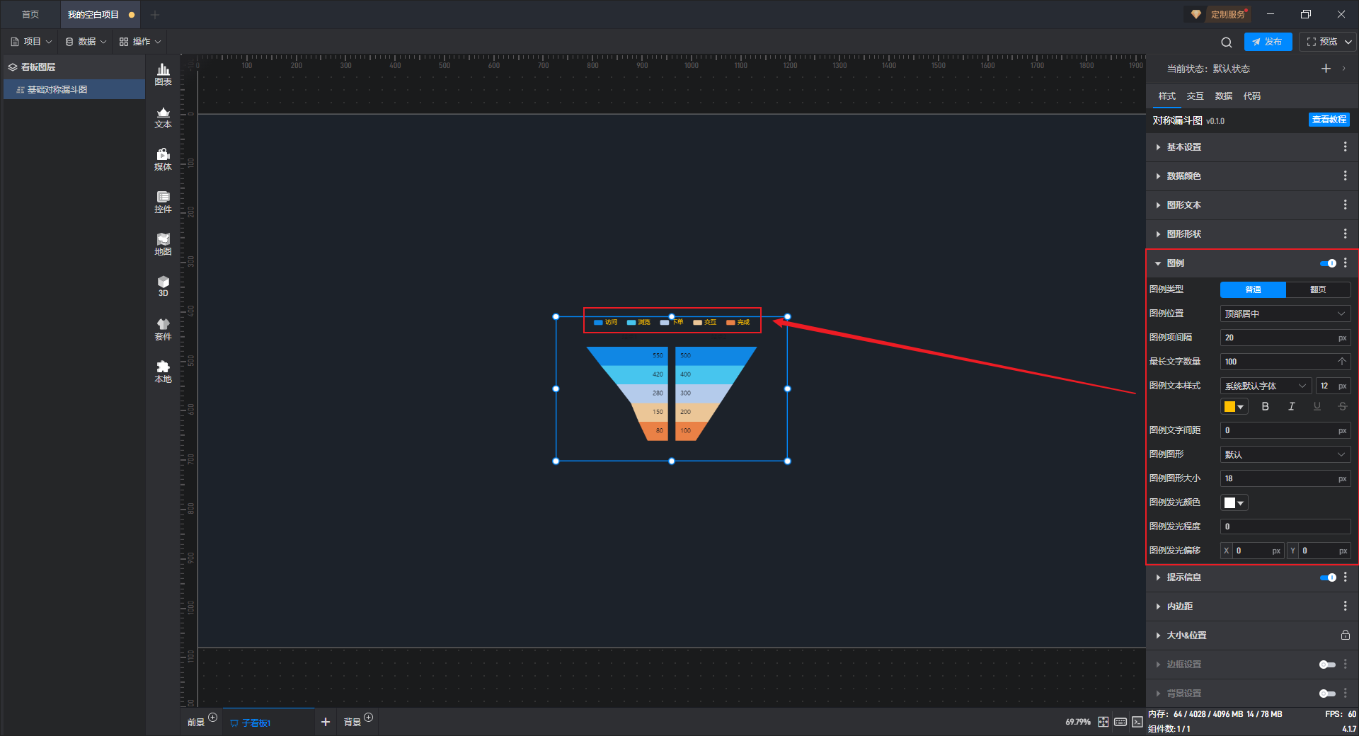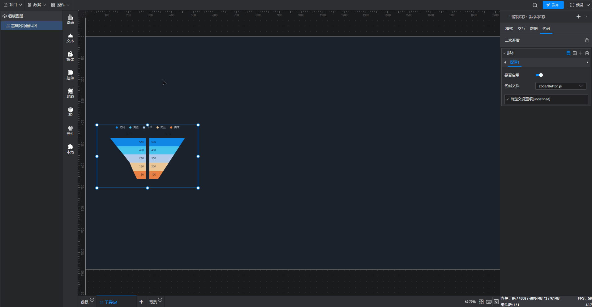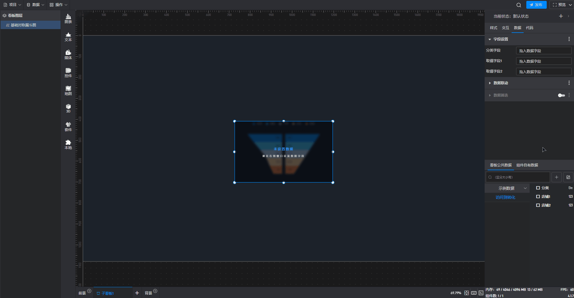 基础对称漏斗图是漏斗图组件的一种预设样式,包含了漏斗图组件所有的功能。