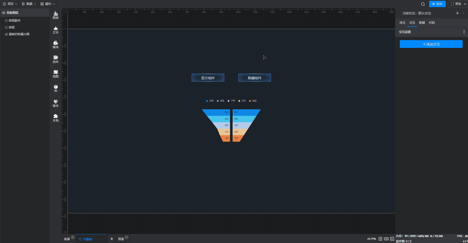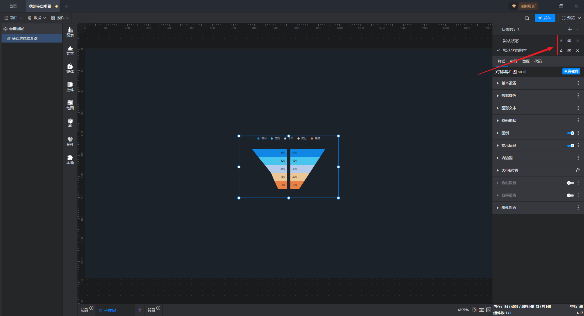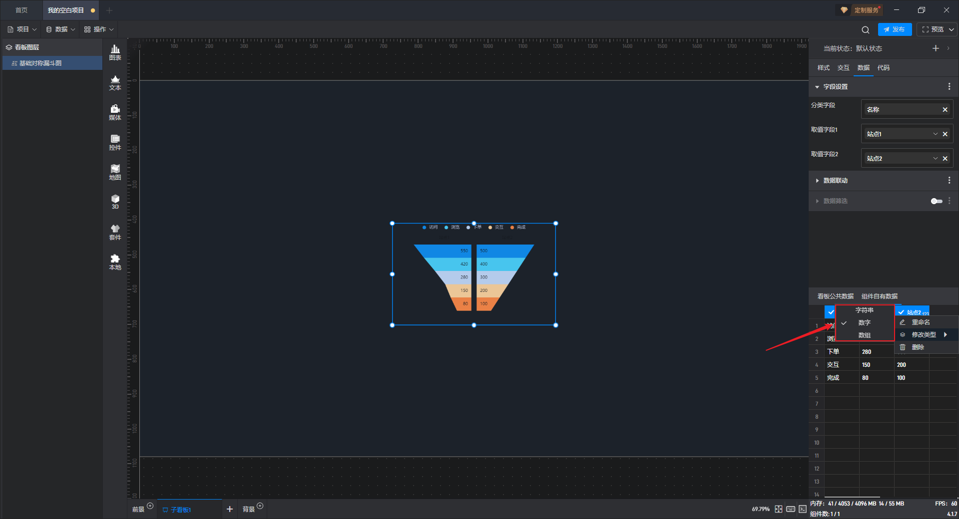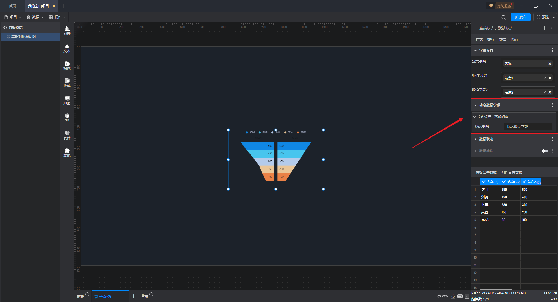 基础对称漏斗图是漏斗图组件的一种预设样式,包含了漏斗图组件所有的功能。