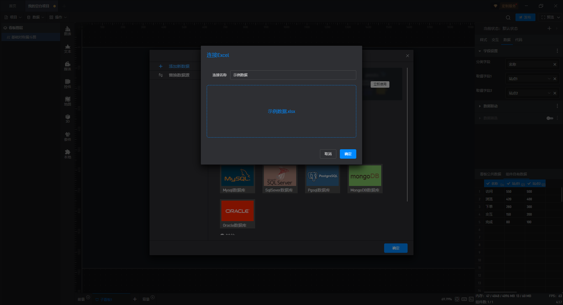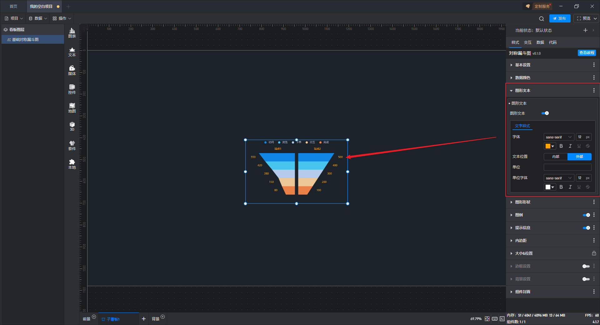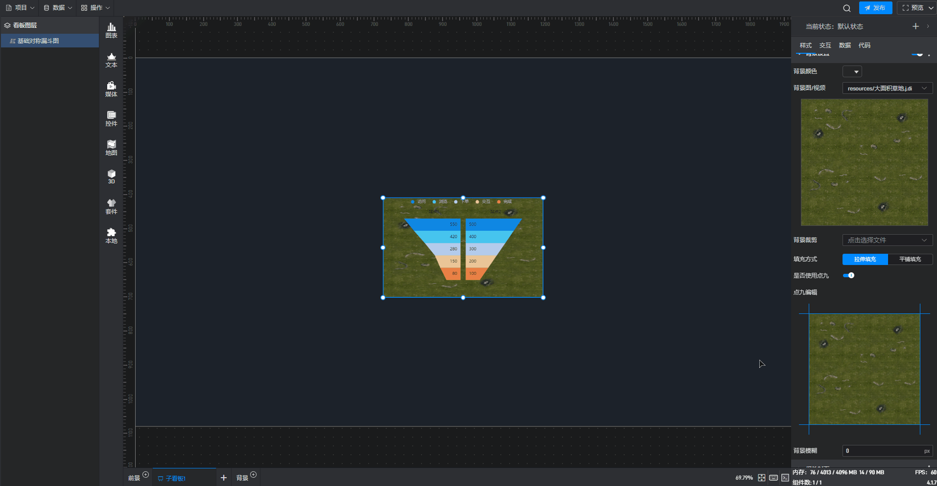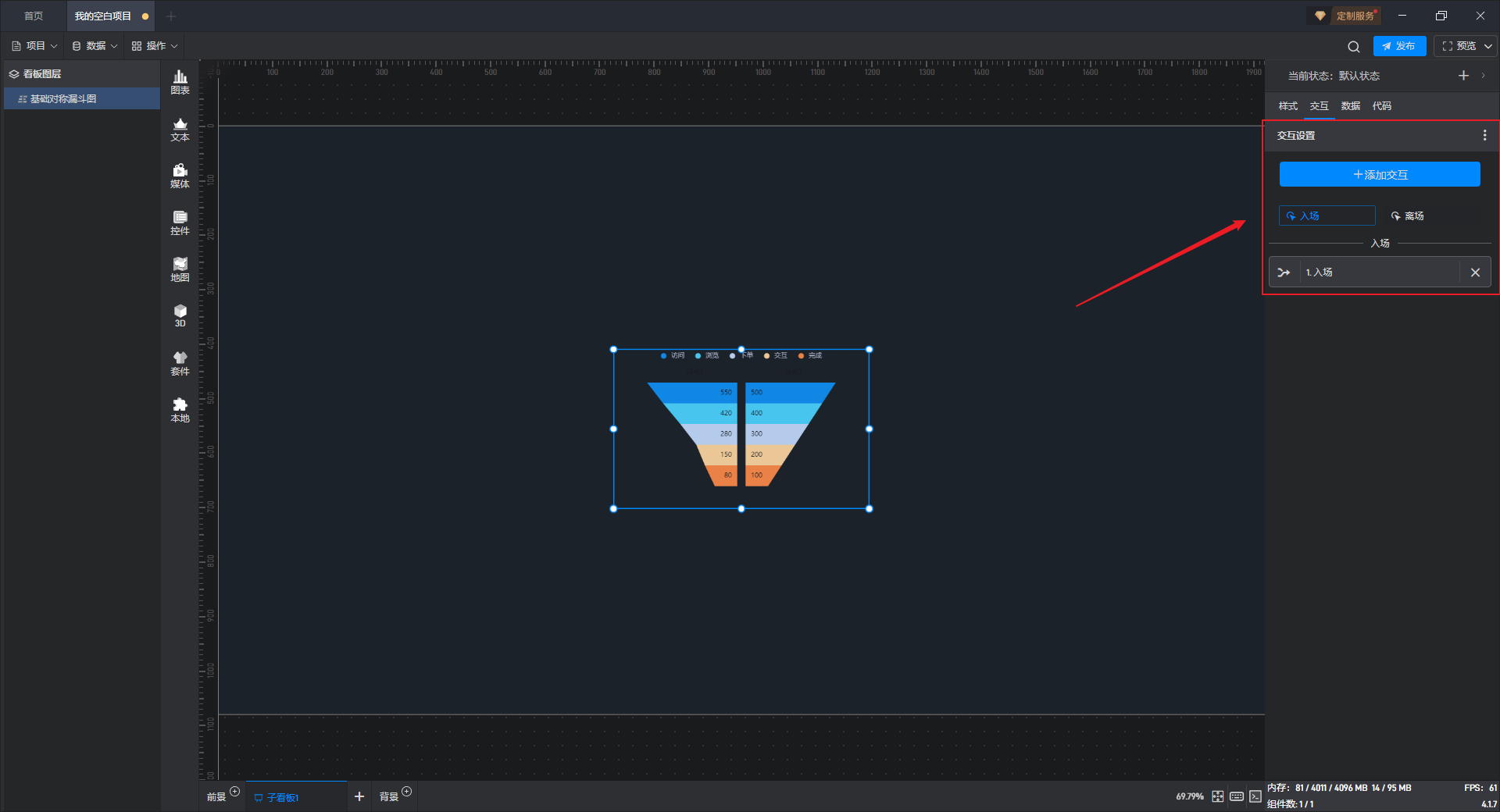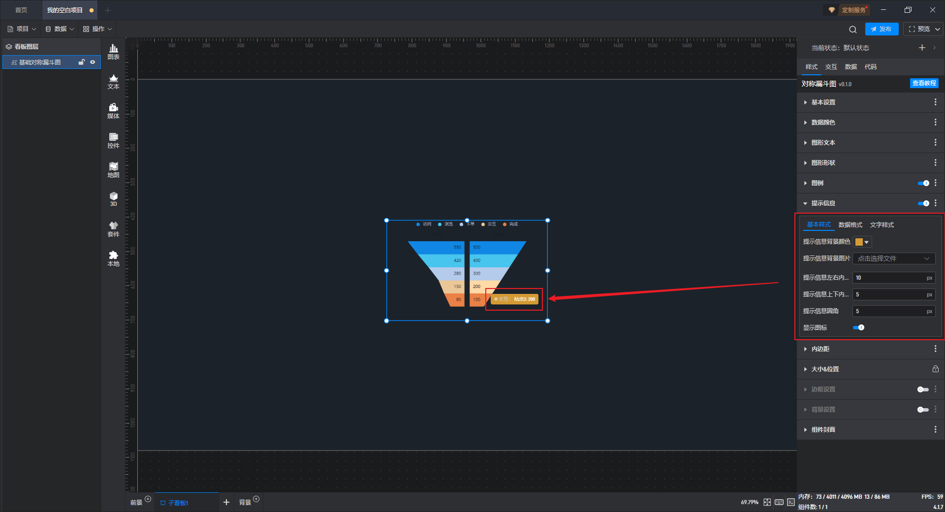 基础对称漏斗图是漏斗图组件的一种预设样式,包含了漏斗图组件所有的功能。