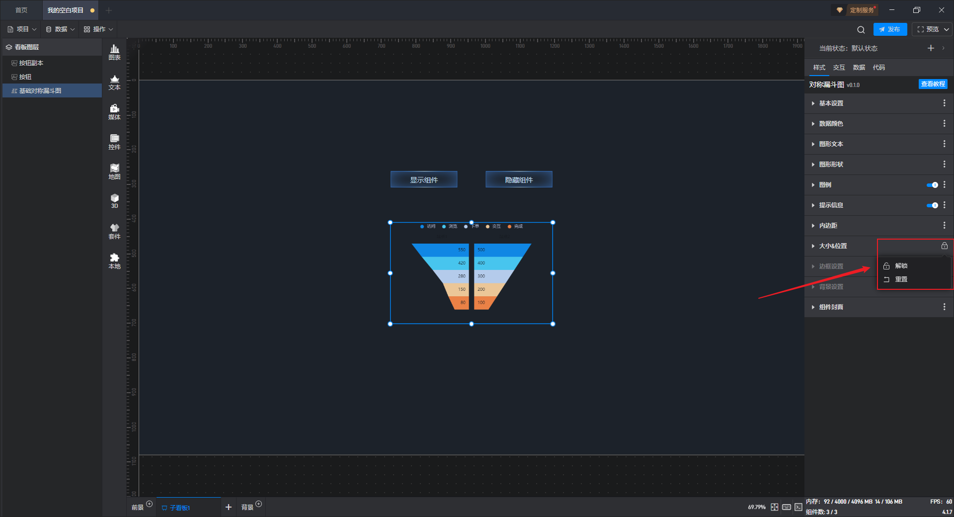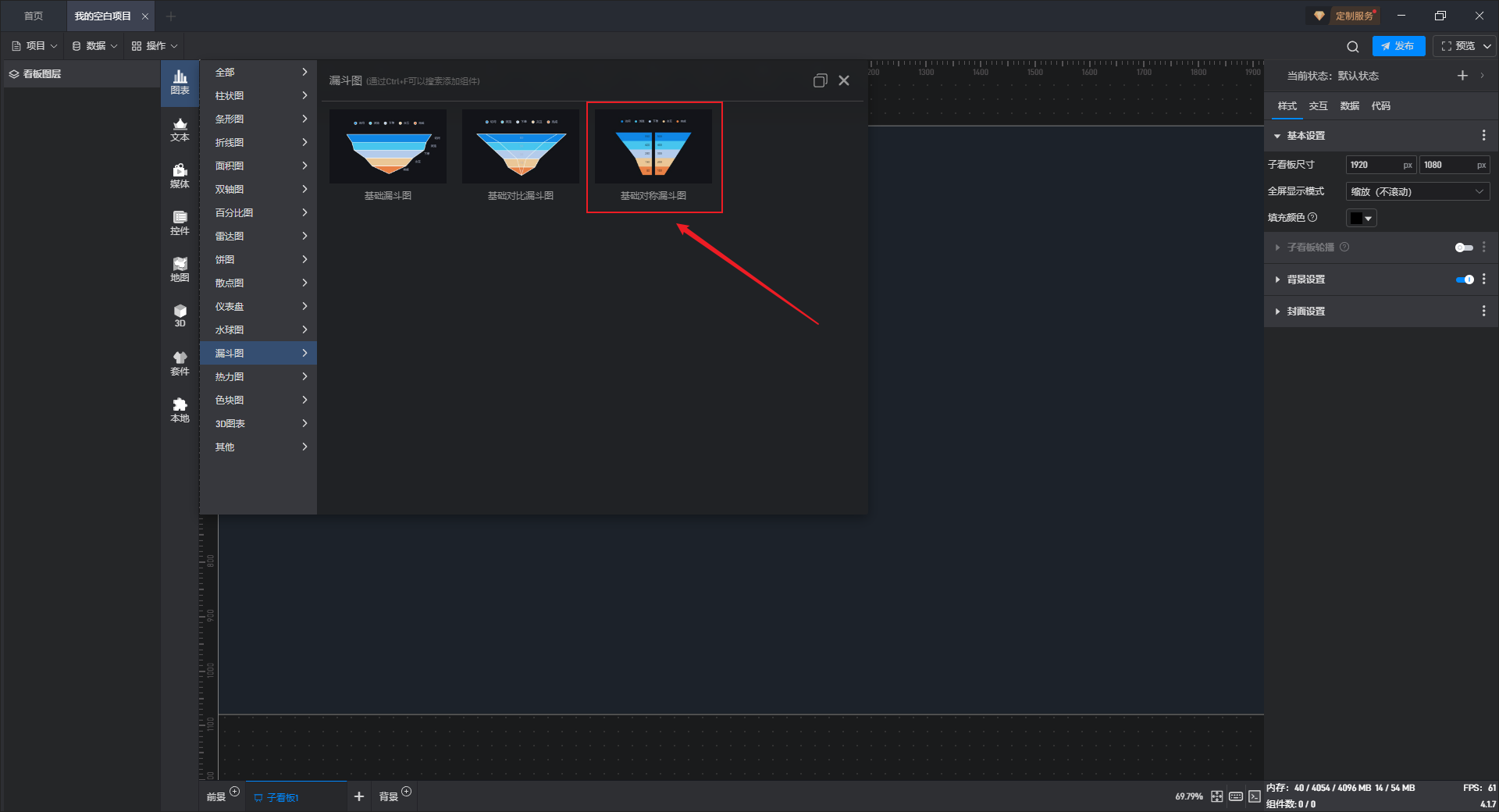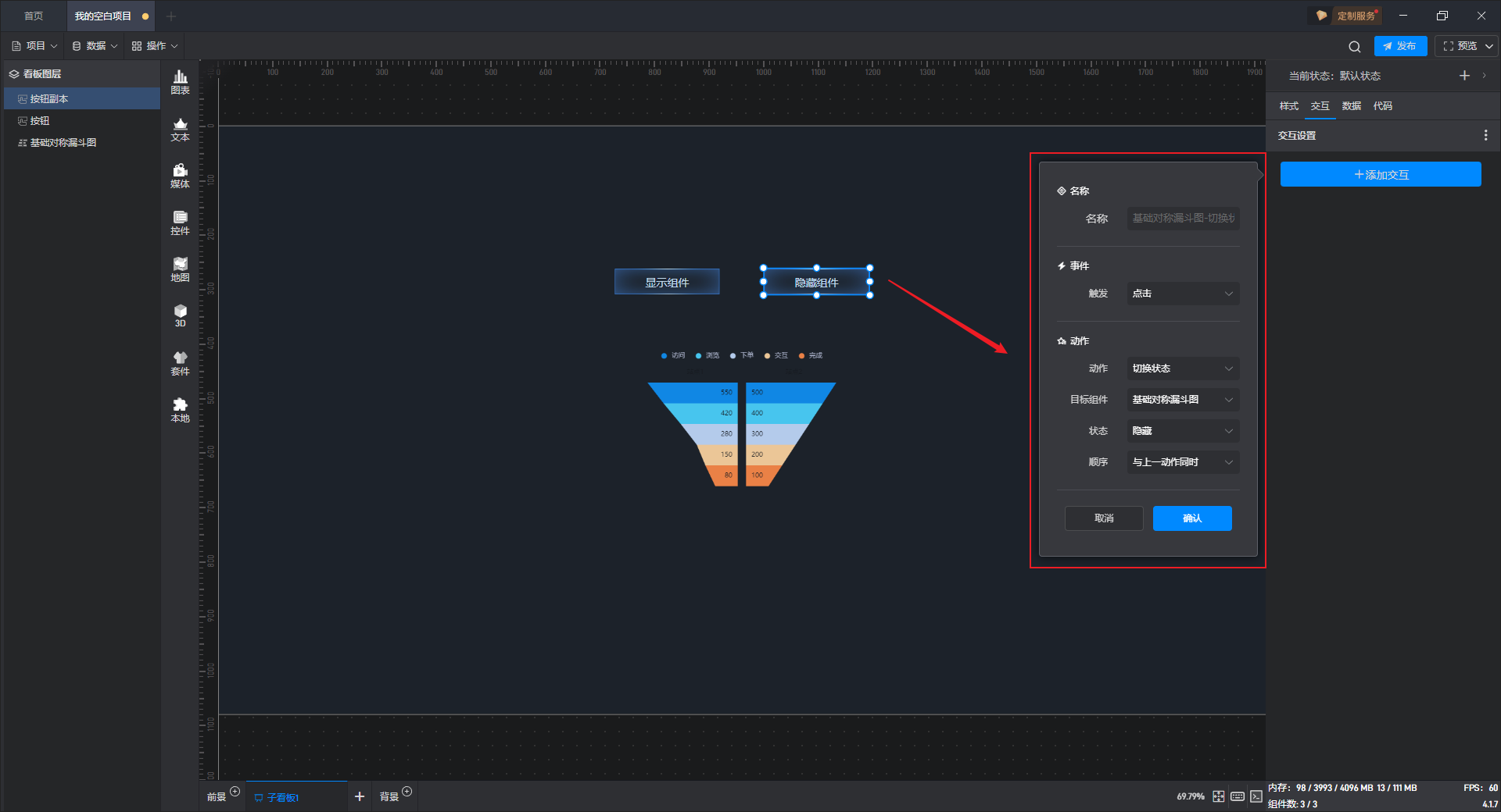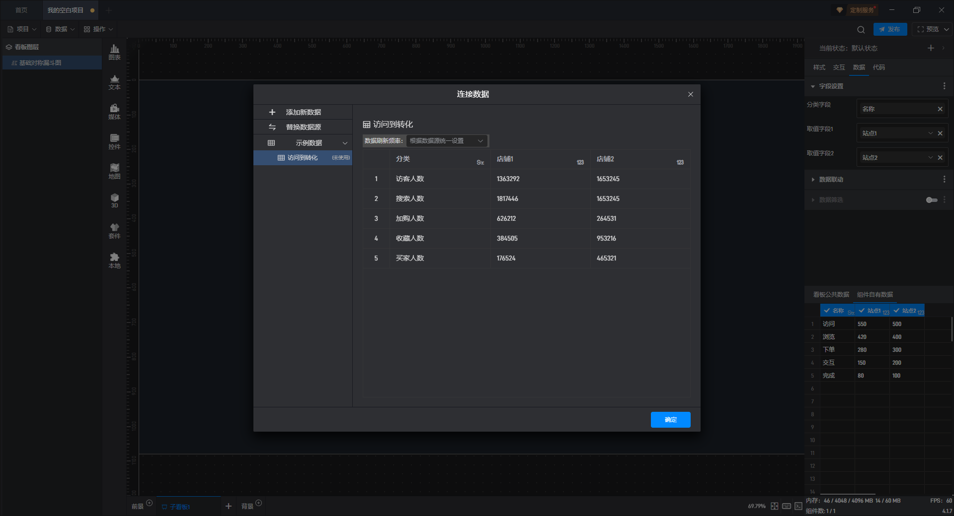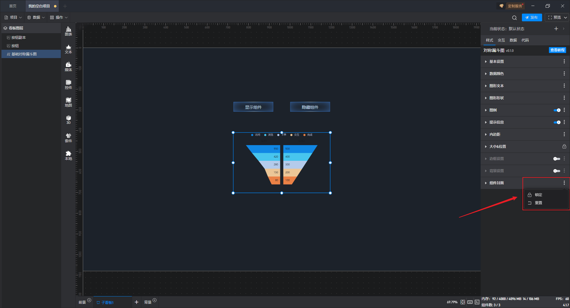 基础对称漏斗图是漏斗图组件的一种预设样式,包含了漏斗图组件所有的功能。