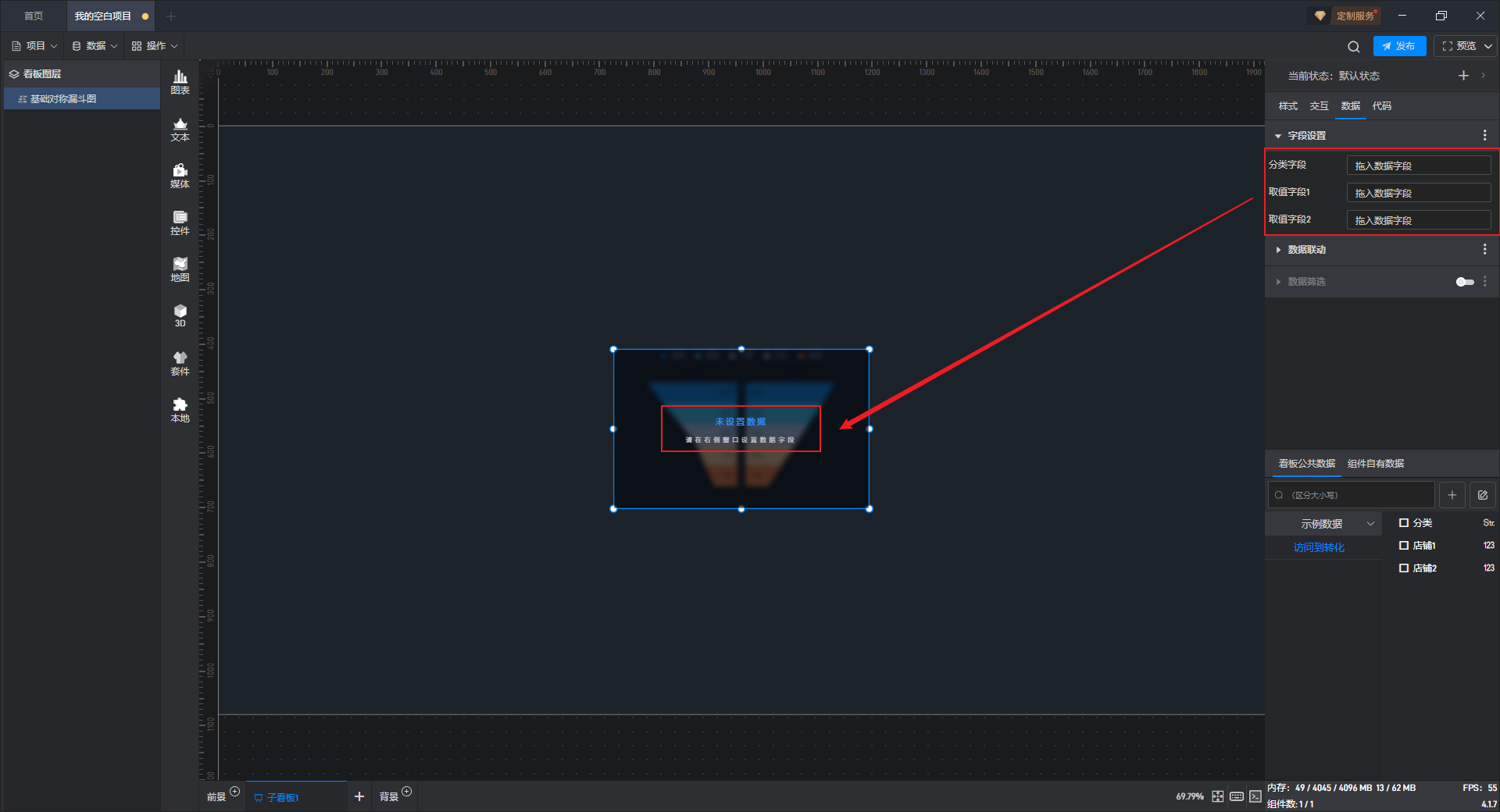 删除当前字段后,右侧字段栏为空,同时组件会提示“未设置数据”。
