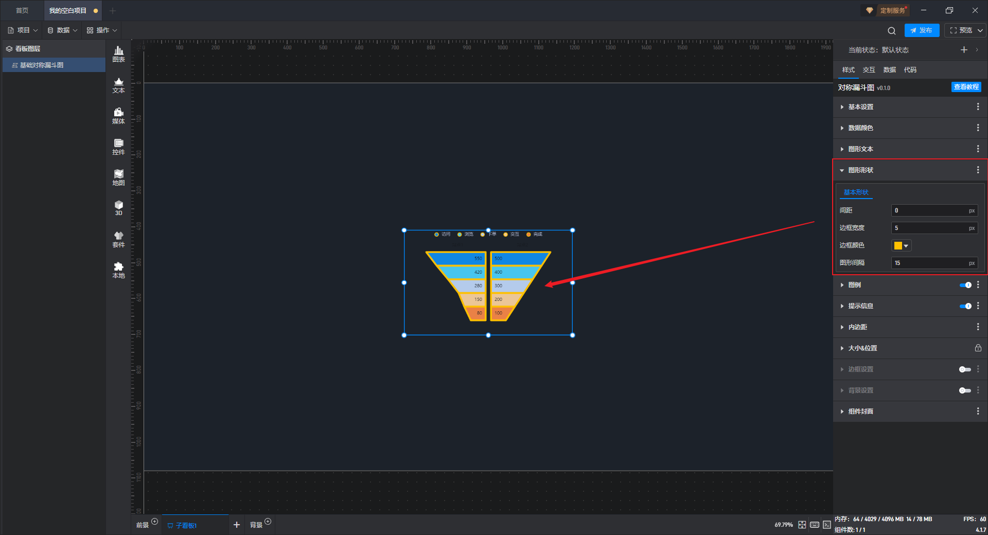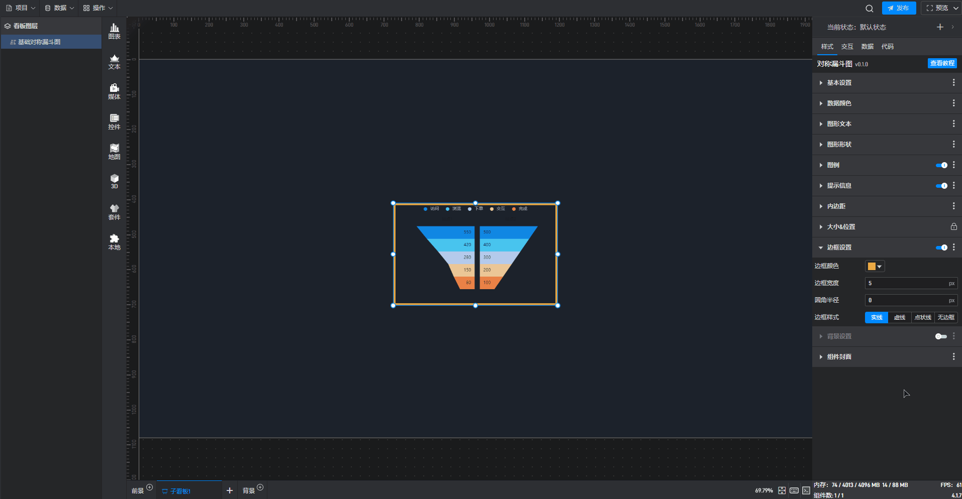| 边框宽度 | 自定义设置数据梯形边缘形状的宽度,默认宽度“0px”。 |