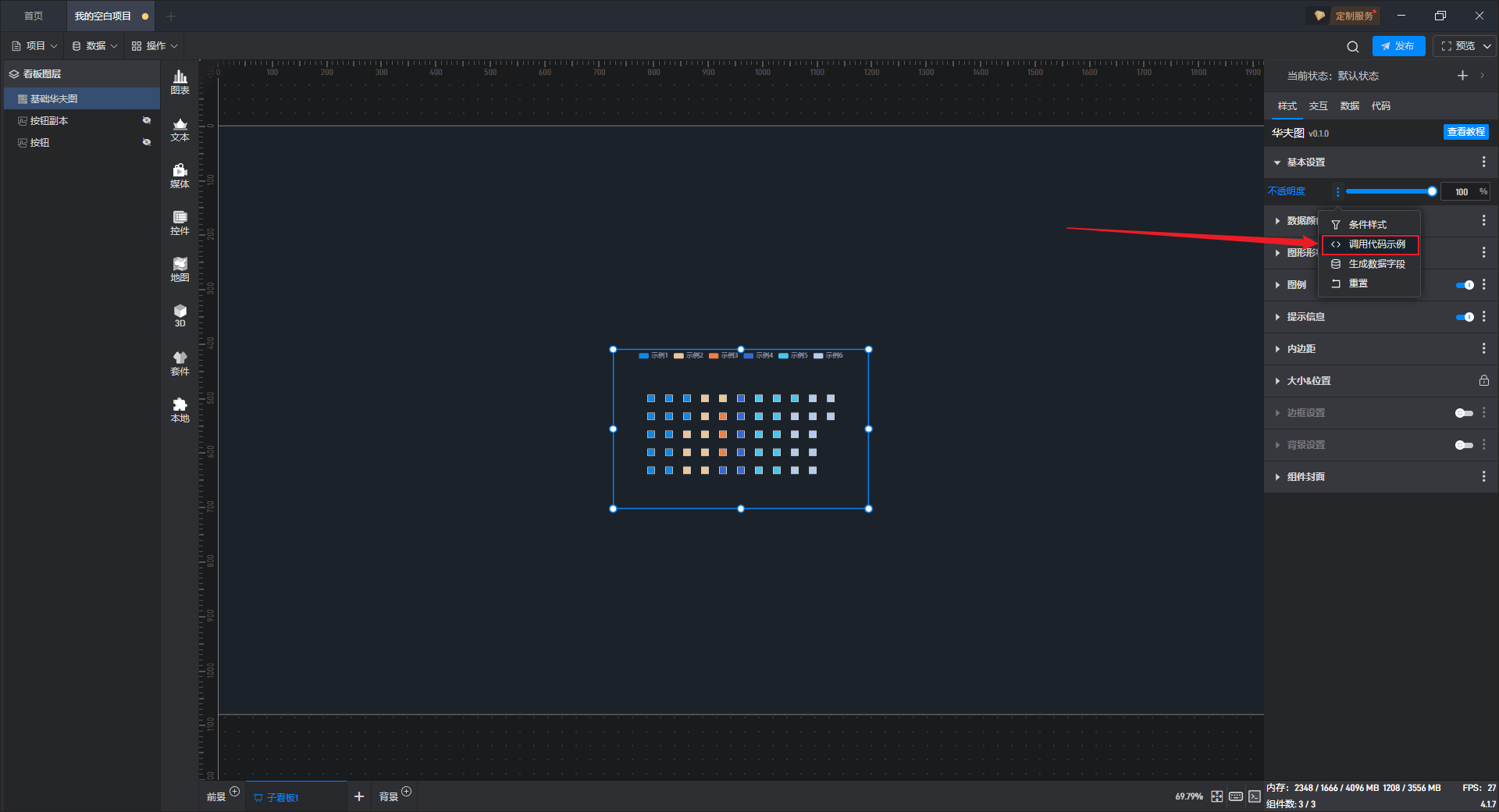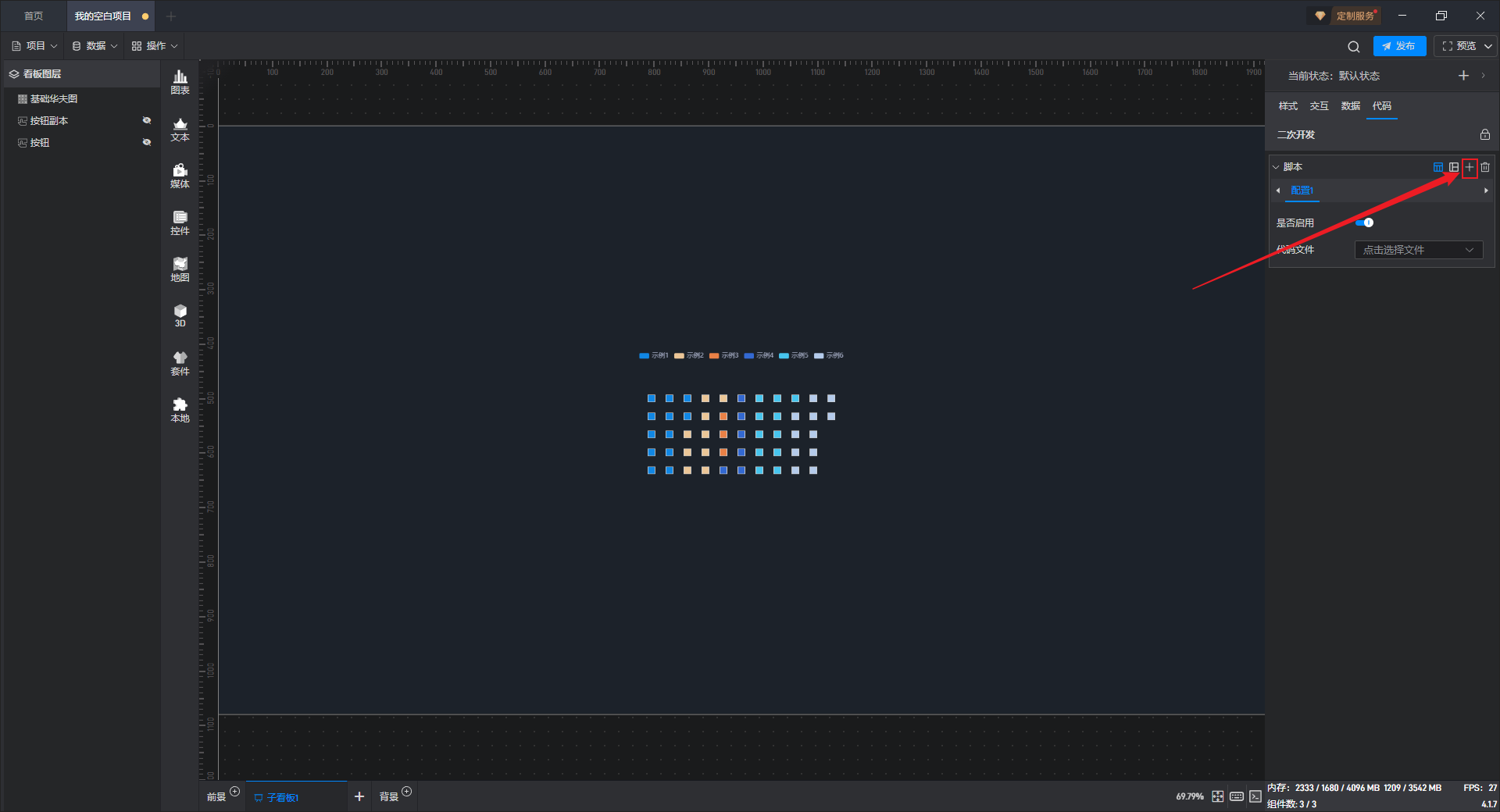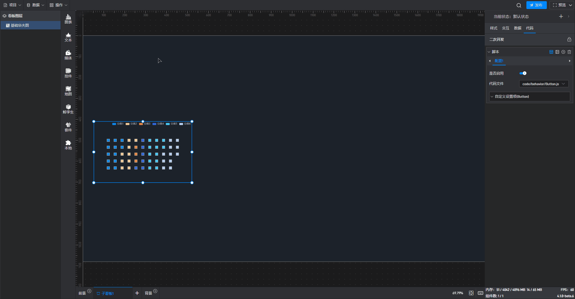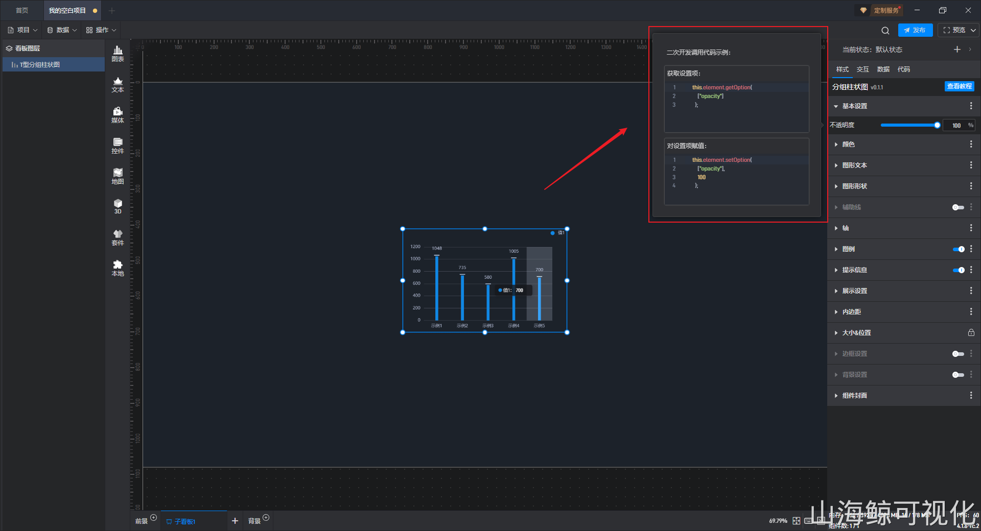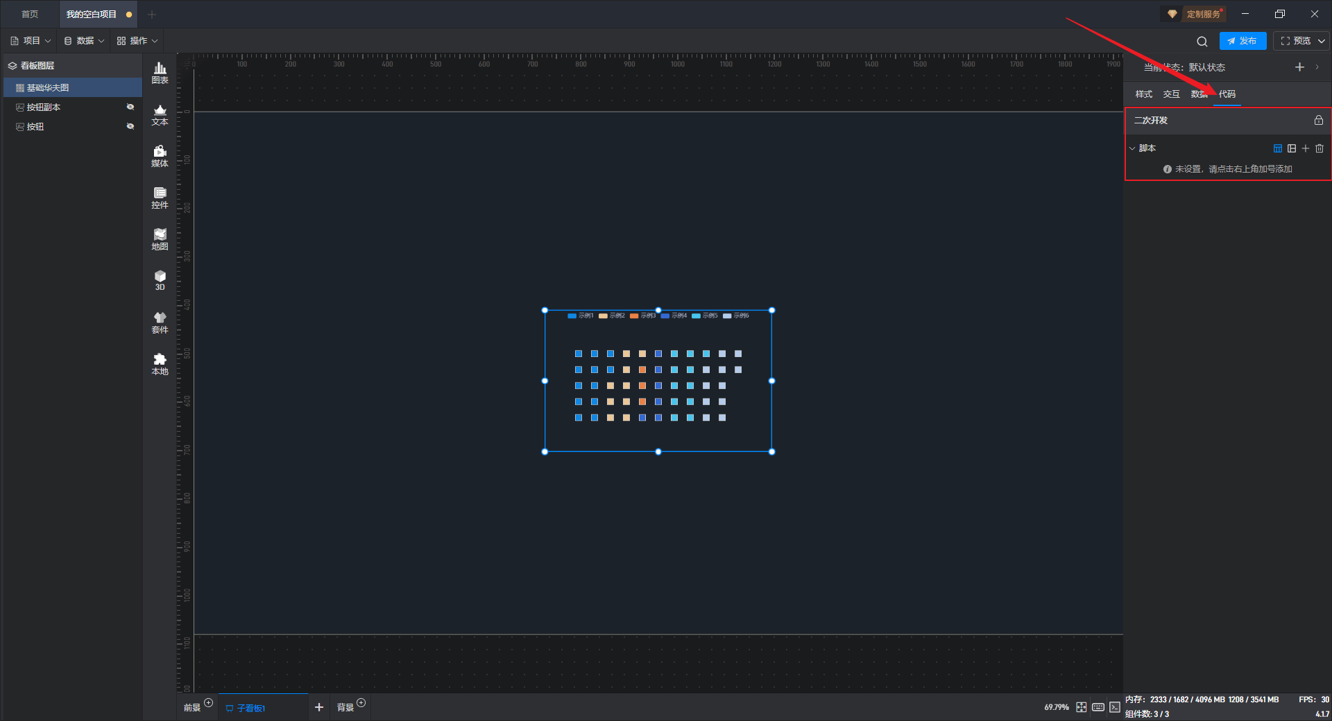 点击选中组件,在右侧“代码”设置窗口中可以对组件进行二次开发设置。