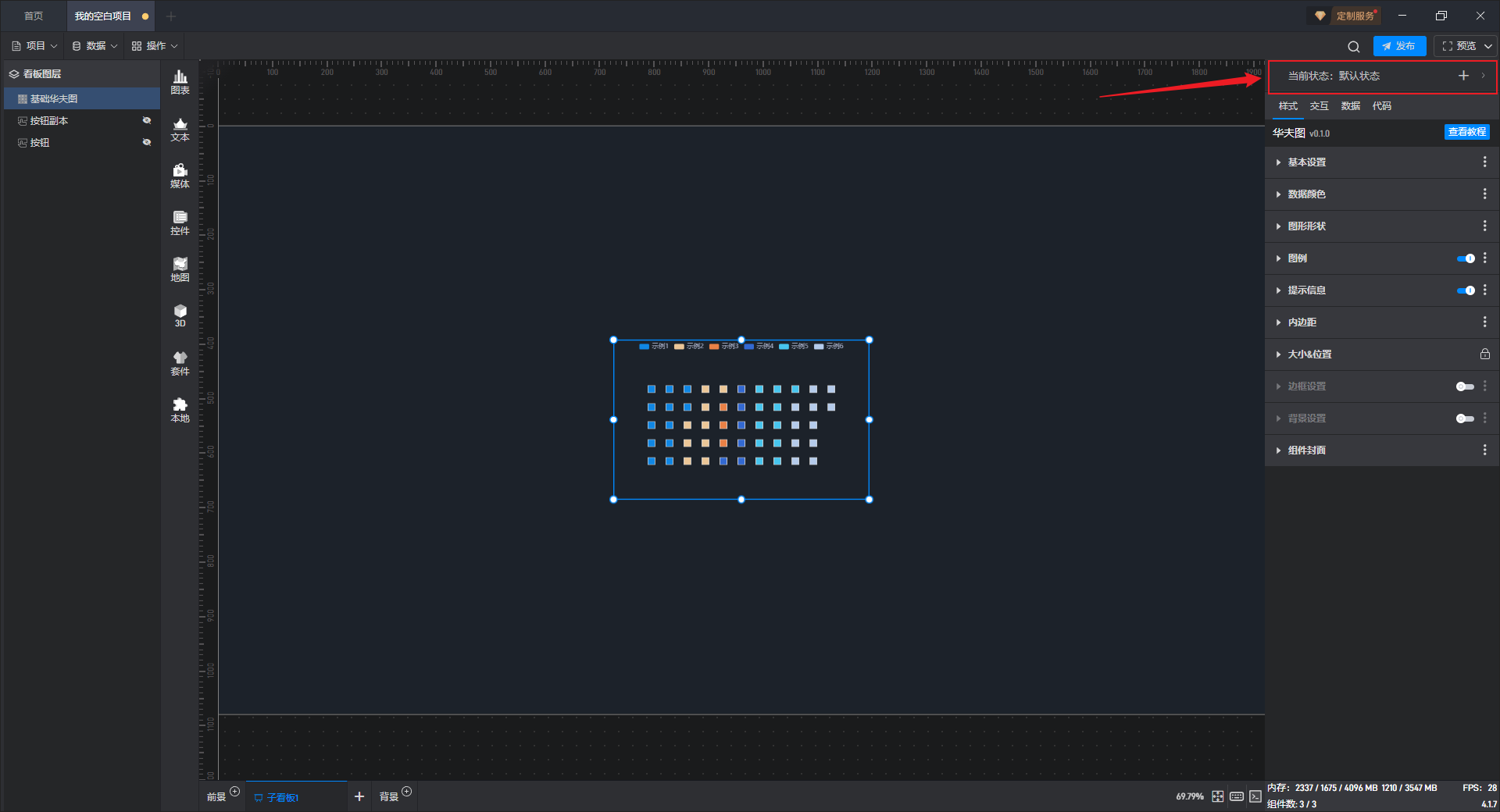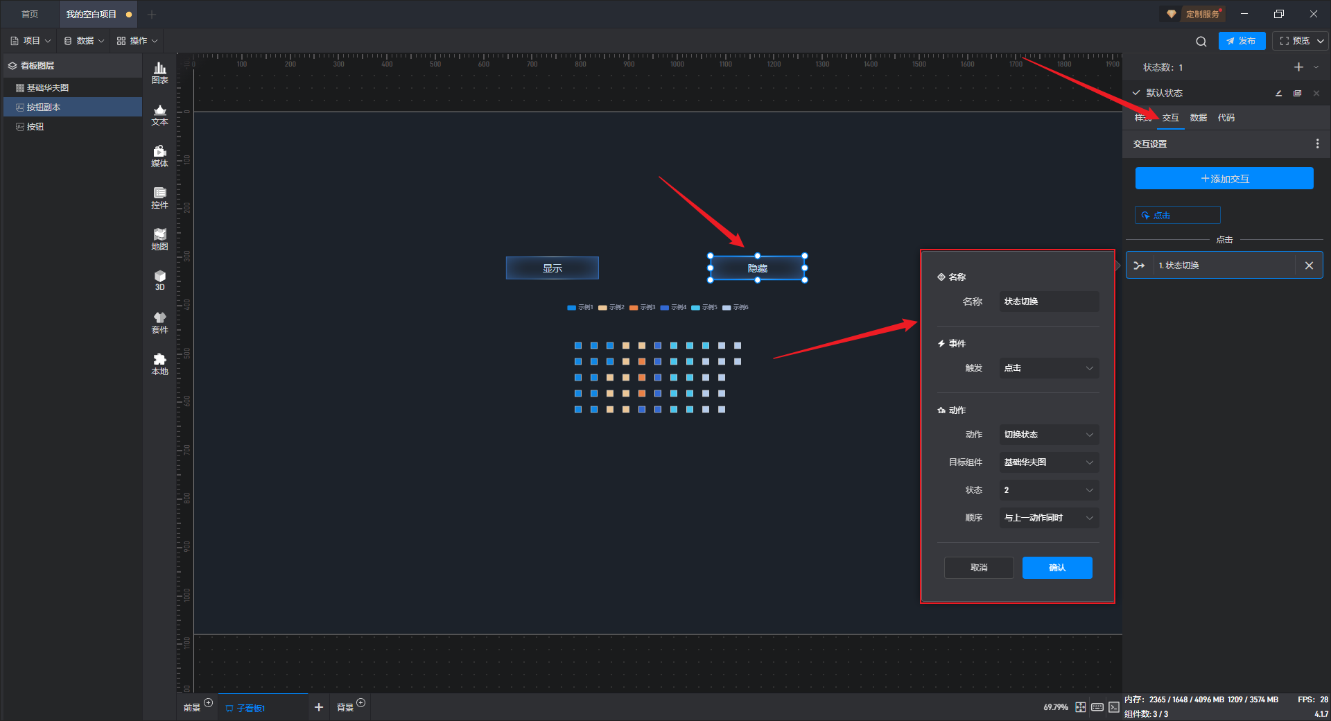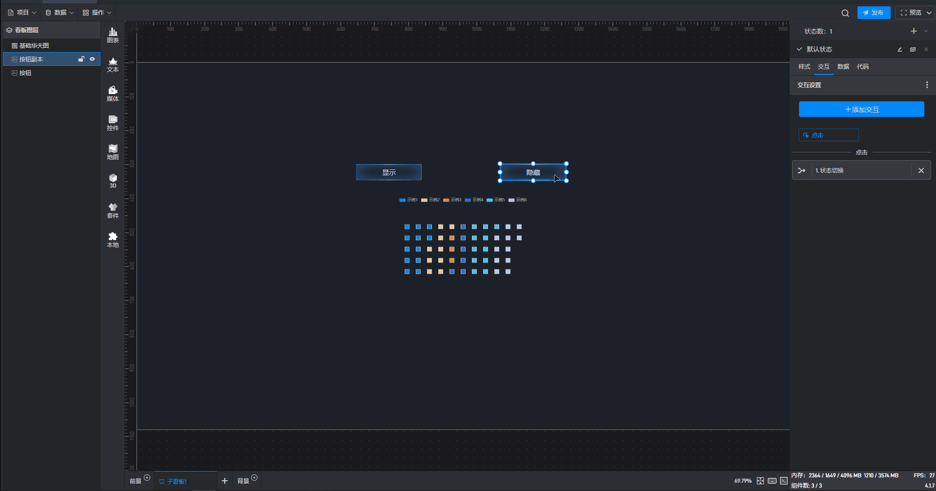 多状态主要用于通过数据条件或是点击交互(通常是点击其他组件来触发本组件的状态切换)来切换组件设置项的场景,这里的设置项包括组件的样式、交互、数据和代码。