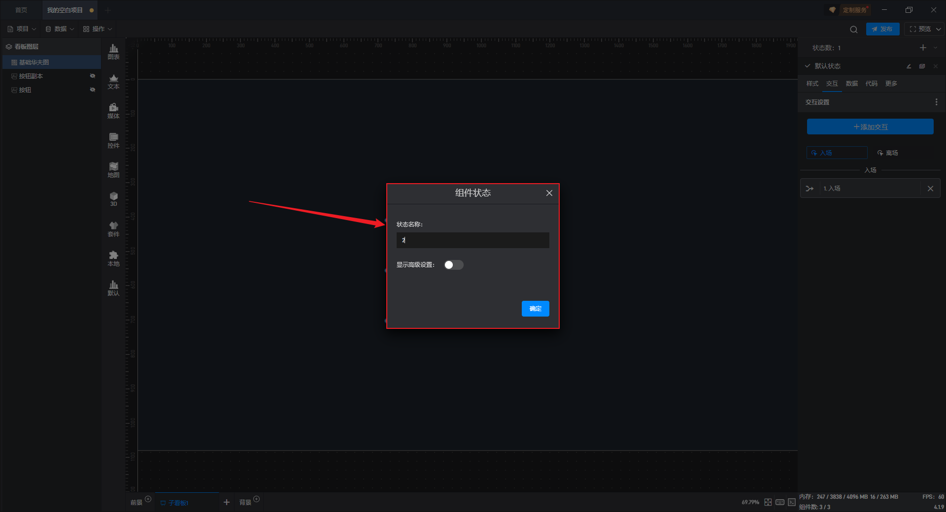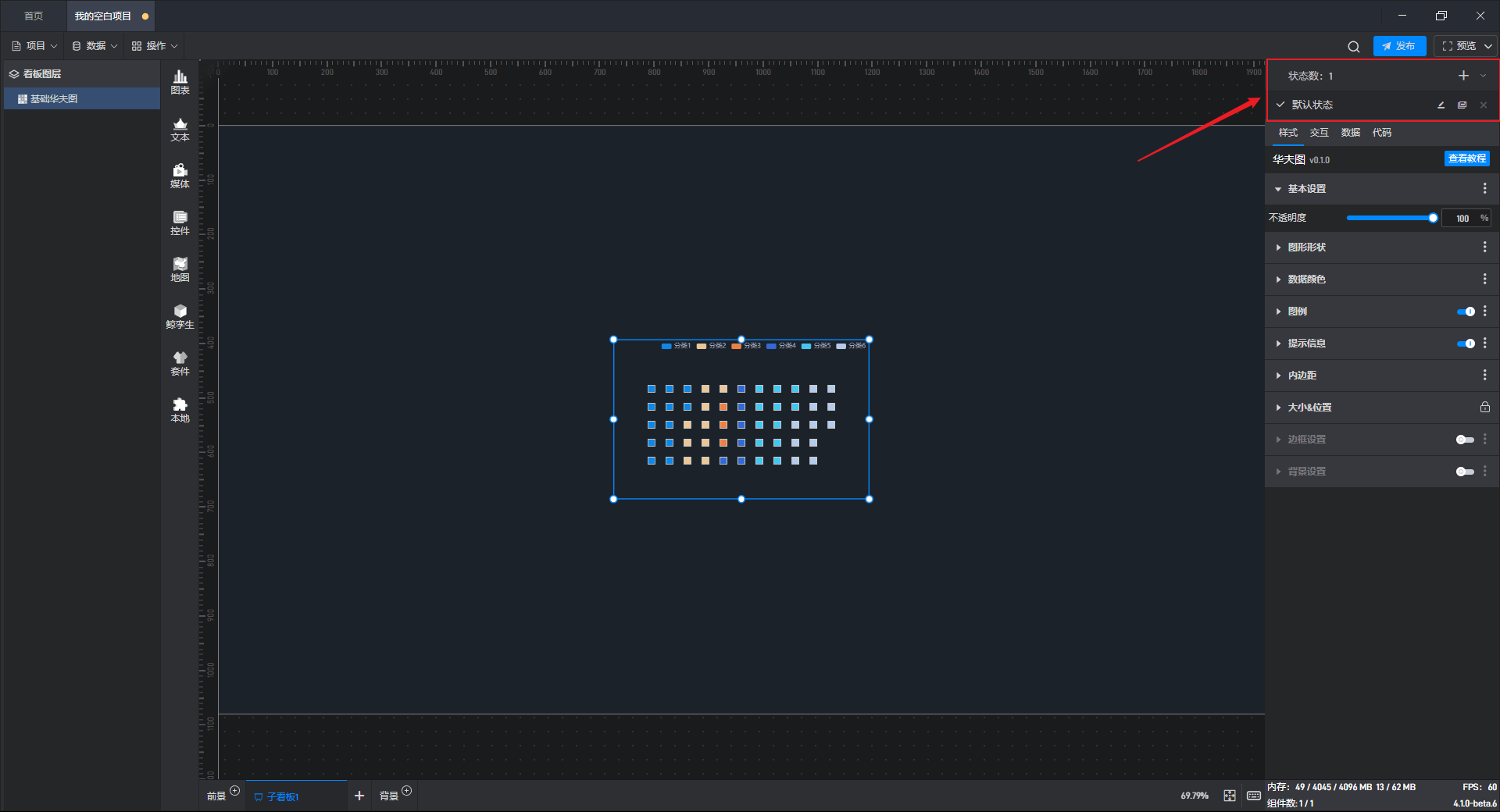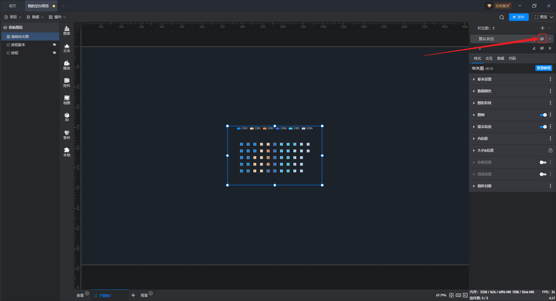 多状态主要用于通过数据条件或是点击交互(通常是点击其他组件来触发本组件的状态切换)来切换组件设置项的场景,这里的设置项包括组件的样式、交互、数据和代码。