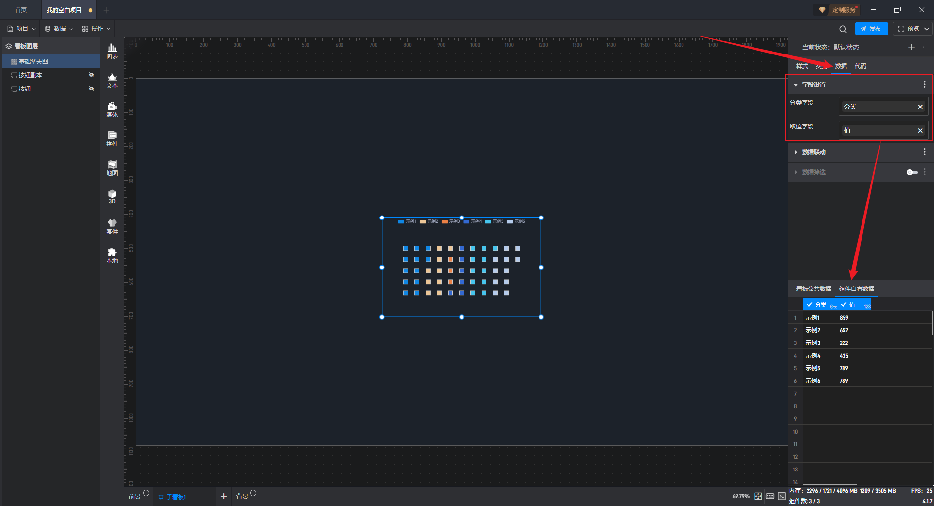 单击选中组件,在右侧“数据”设置窗口中,可以看到组件已经设置好了数据字段,且数据字段来自于“组件自有数据”。