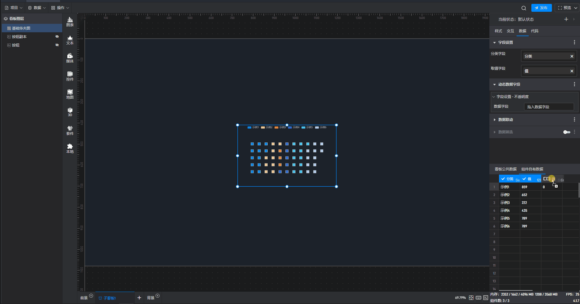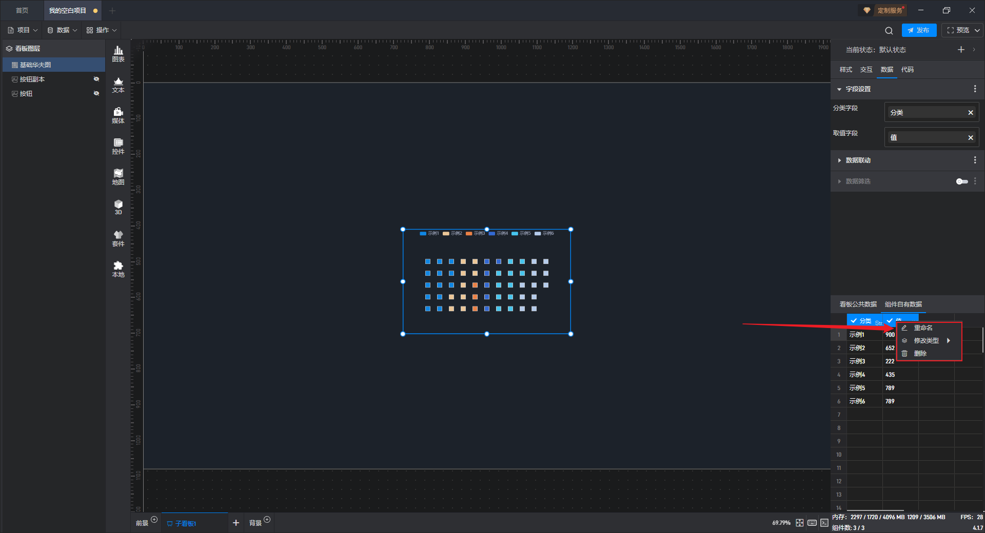 在“数据”设置界面下方可以直接修改数据,组件中的数据也会实时更新。