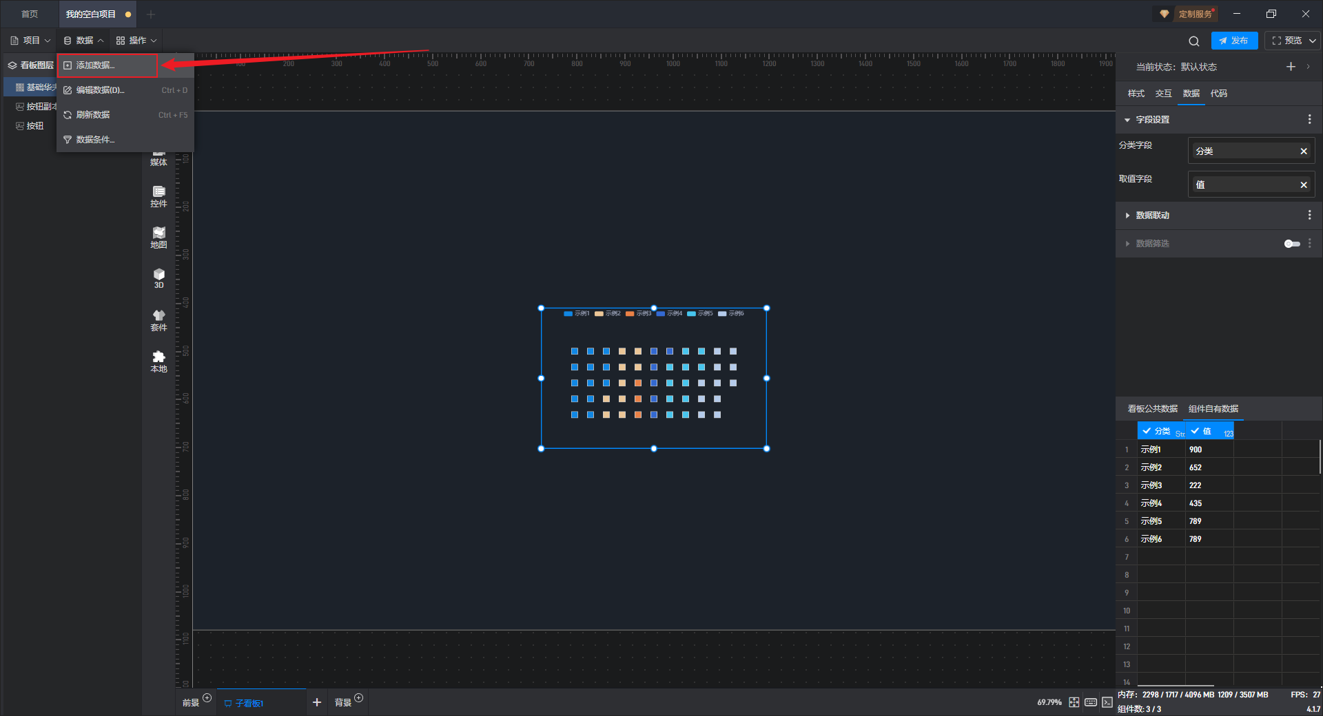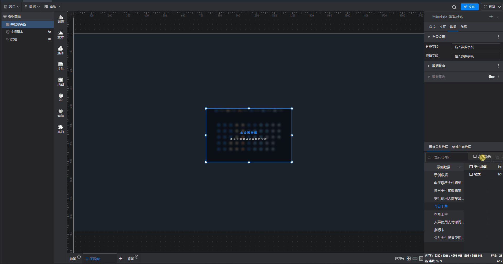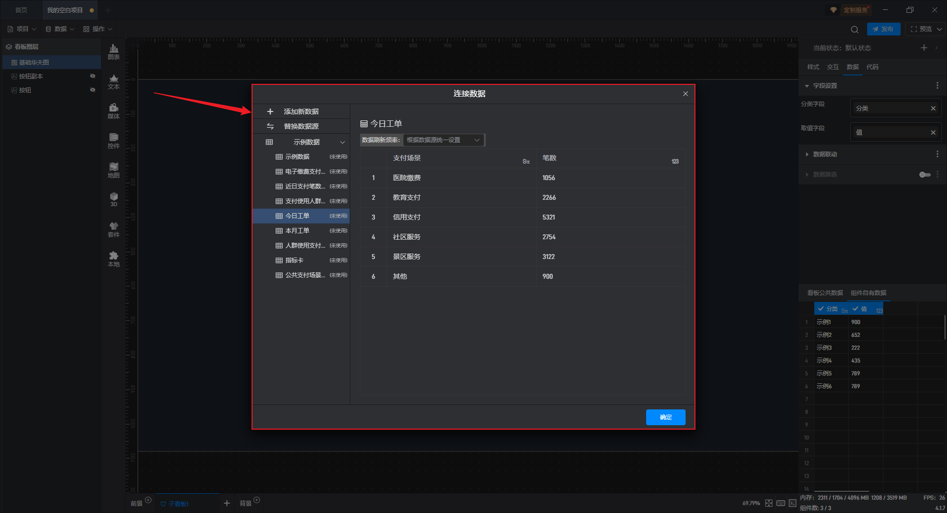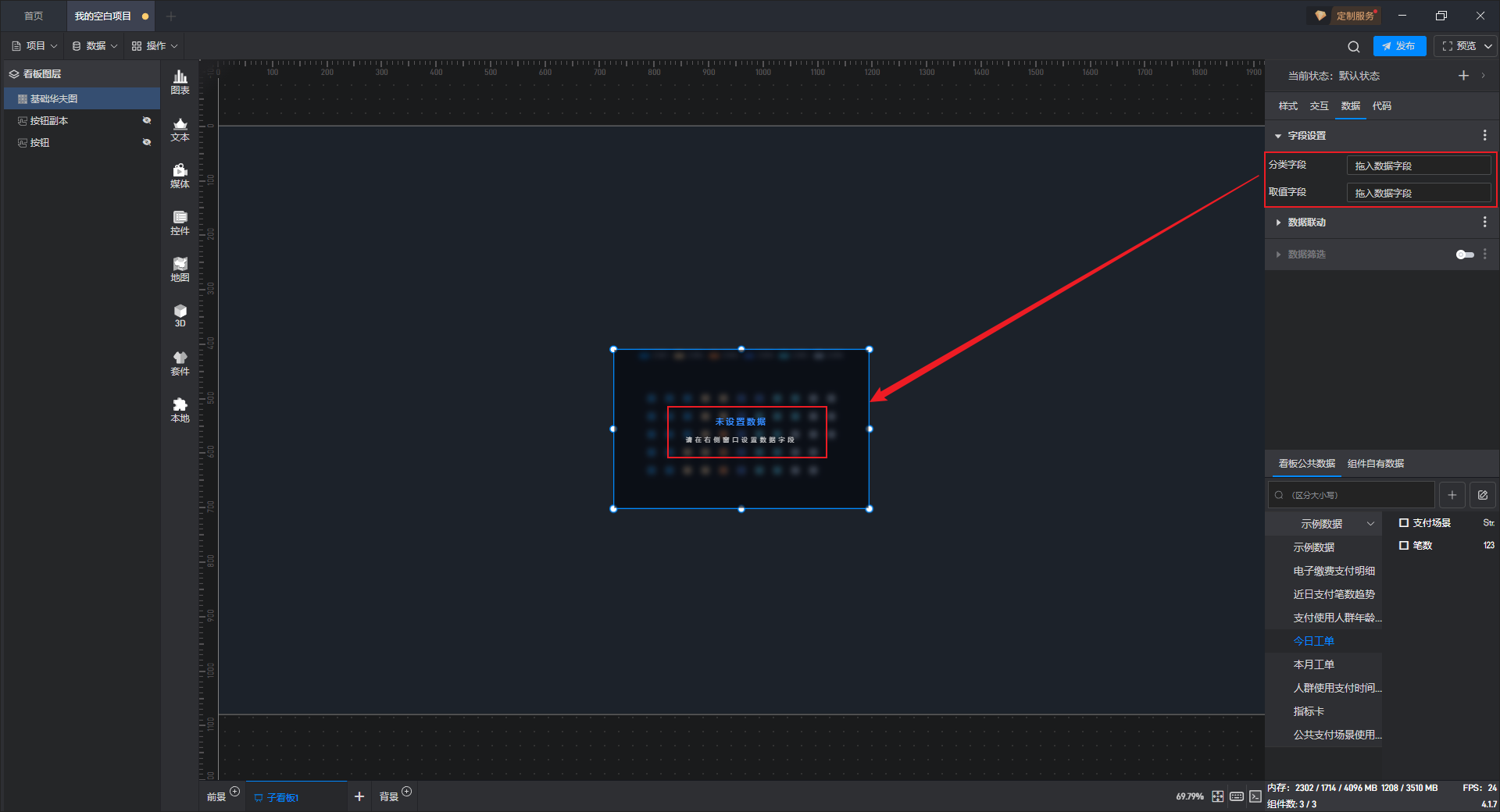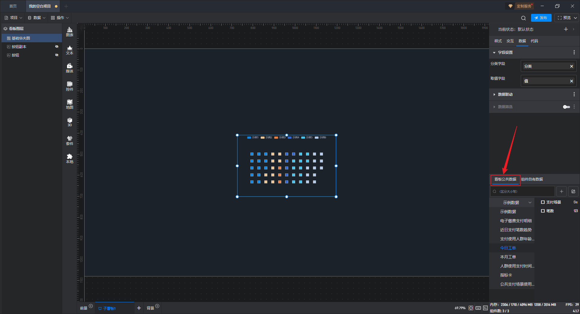点击选中组件,在右侧“数据”设置窗口中切换到“看板公共数据”(同一个项目中所有数据源是共享的)。