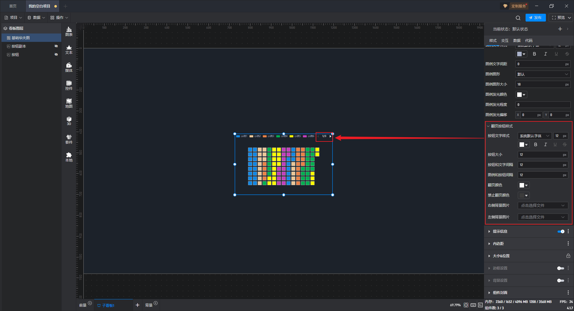当勾选了多个 Y 轴字段,图例就可以以“翻页”的类型来展示,点击“翻页按钮样式”对翻页按钮单独进行配置。