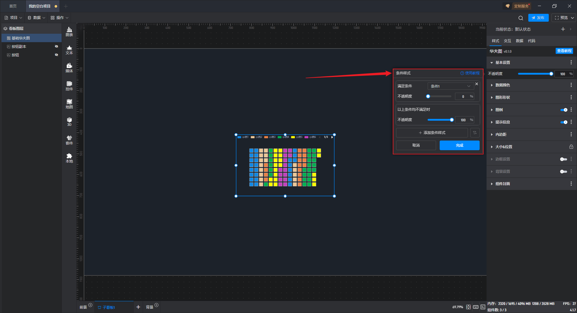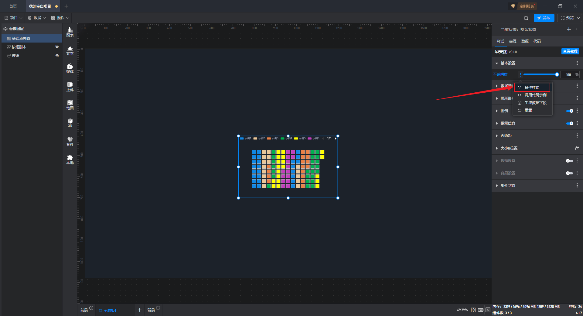 有一些设置项的条件设置方式直接显示在设置项中,这种就可以直接在外面设置,但基础华夫图的条件样式只能通过方式 1 进行设置。