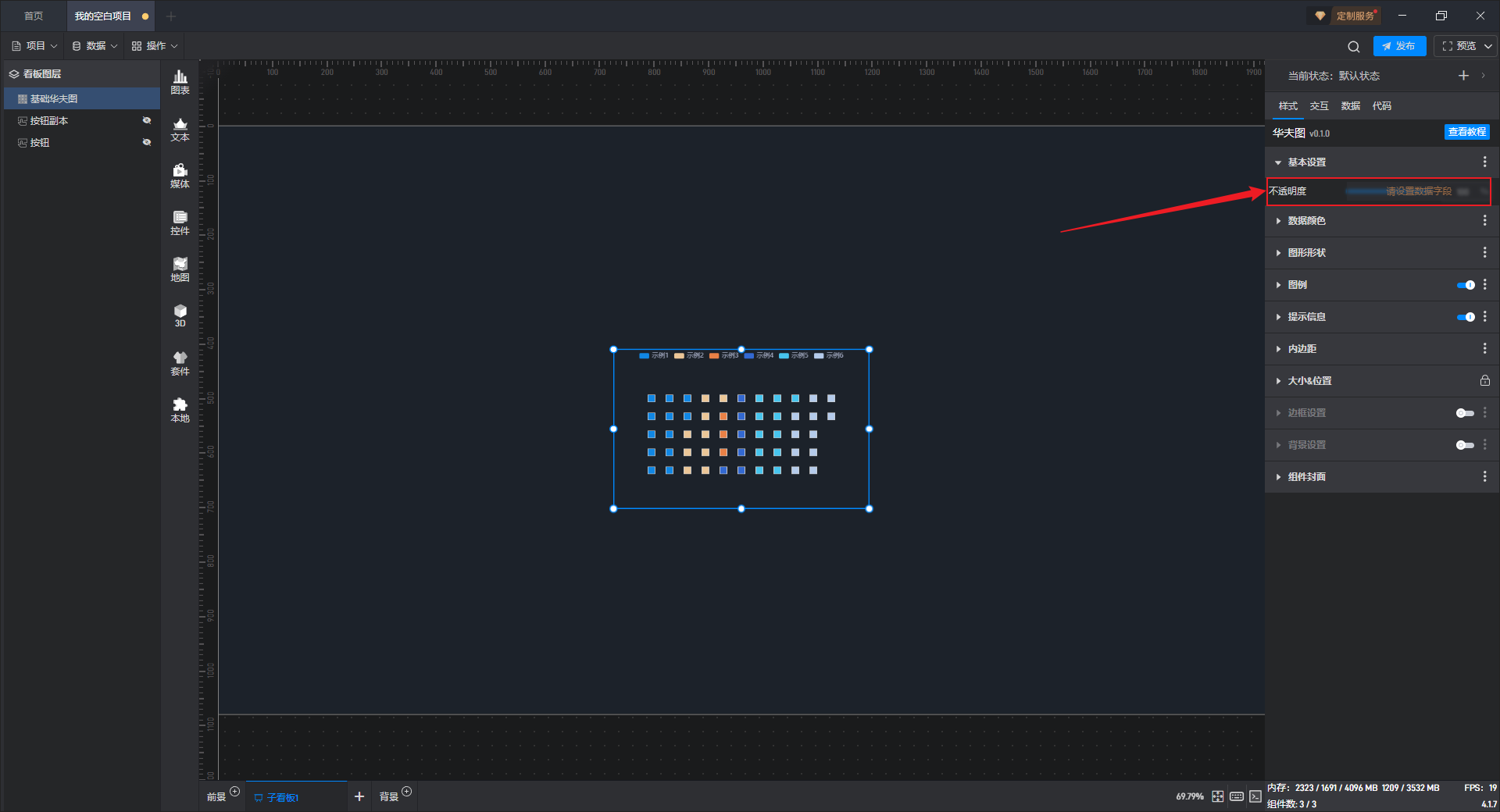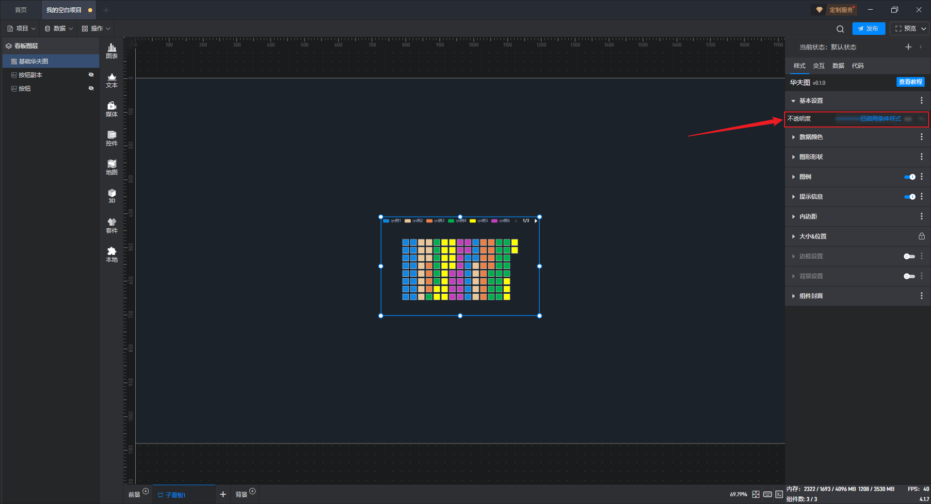 | 不透明度 | 1)根据个人喜好或整体和谐度合理地使用透明度,会让大屏布局更美观; | 2)这个设置项的一个常见用法是结合条件样式/交互/多状态来实现组件的显示和隐藏。 |