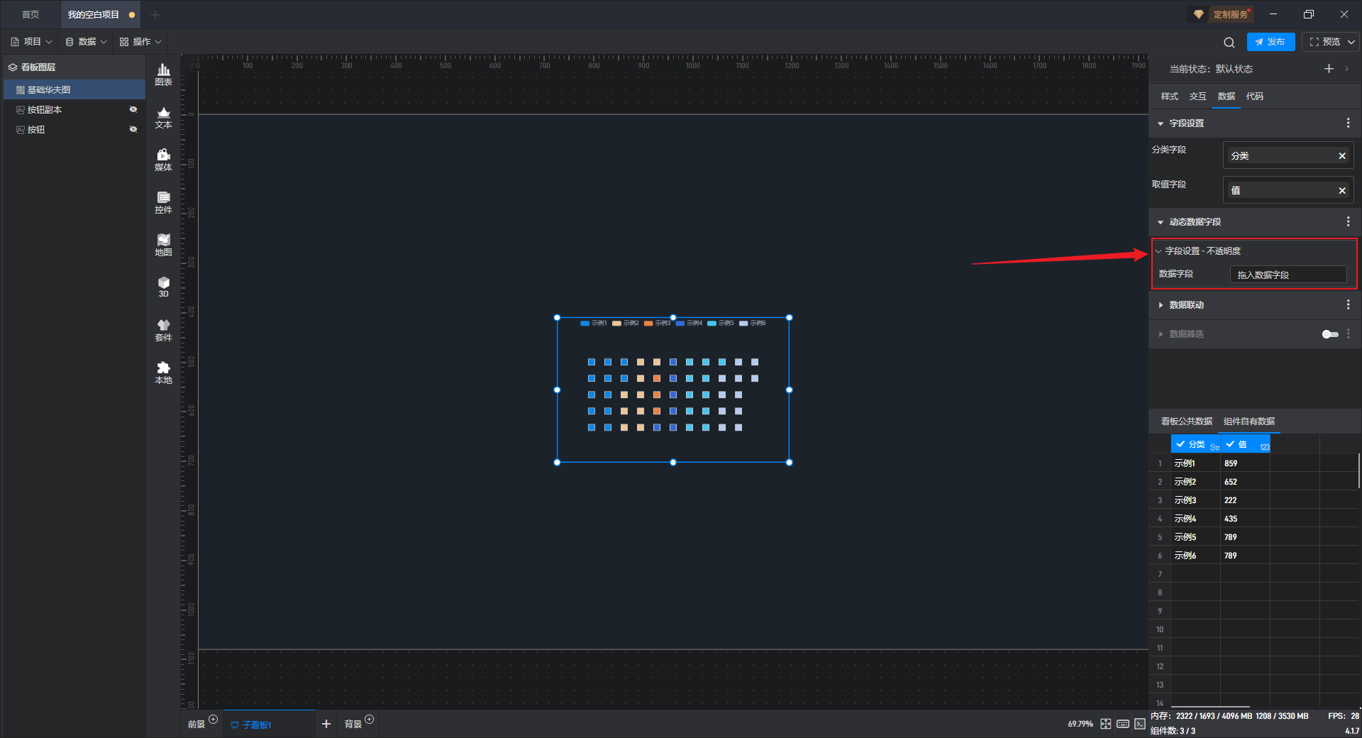 添加一个数值为“0”的数据到数据字段中,可以看到通过动态数据字段将不透明度的数值修改为“0”,从而使组件隐藏。