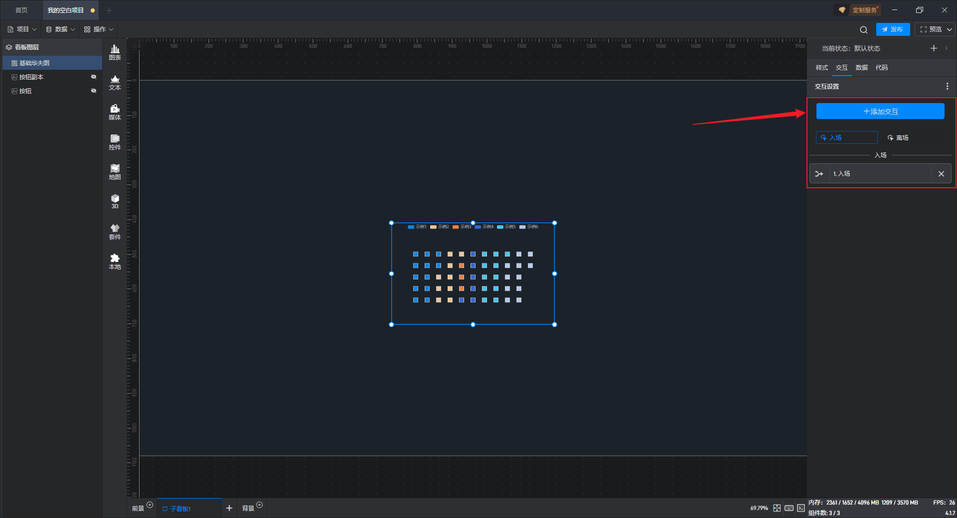点击选中组件,在右侧“交互”设置窗口中可以对当前组件的交互进行添加和删除。