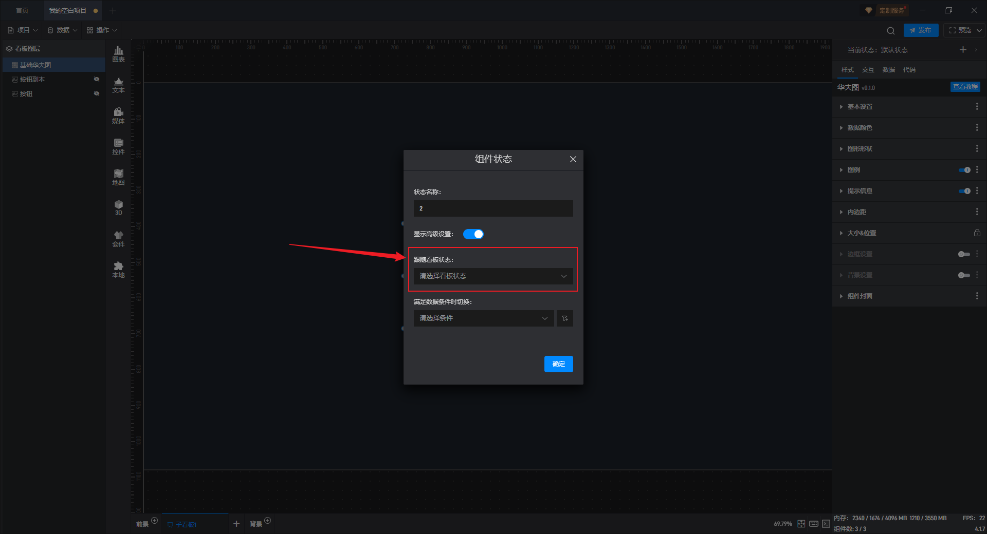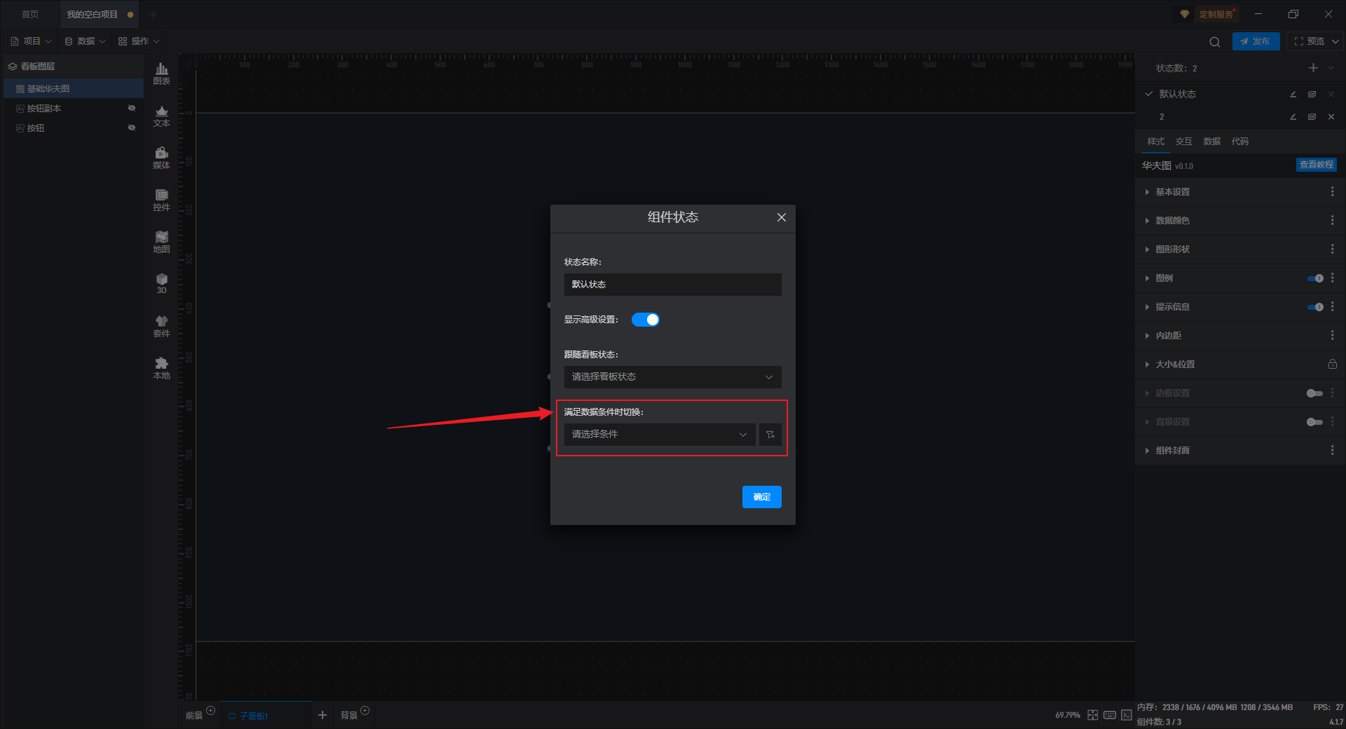 在这里我们可以选择已设置的数据条件,从而在数据条件满足时,组件的状态就会发生变化。