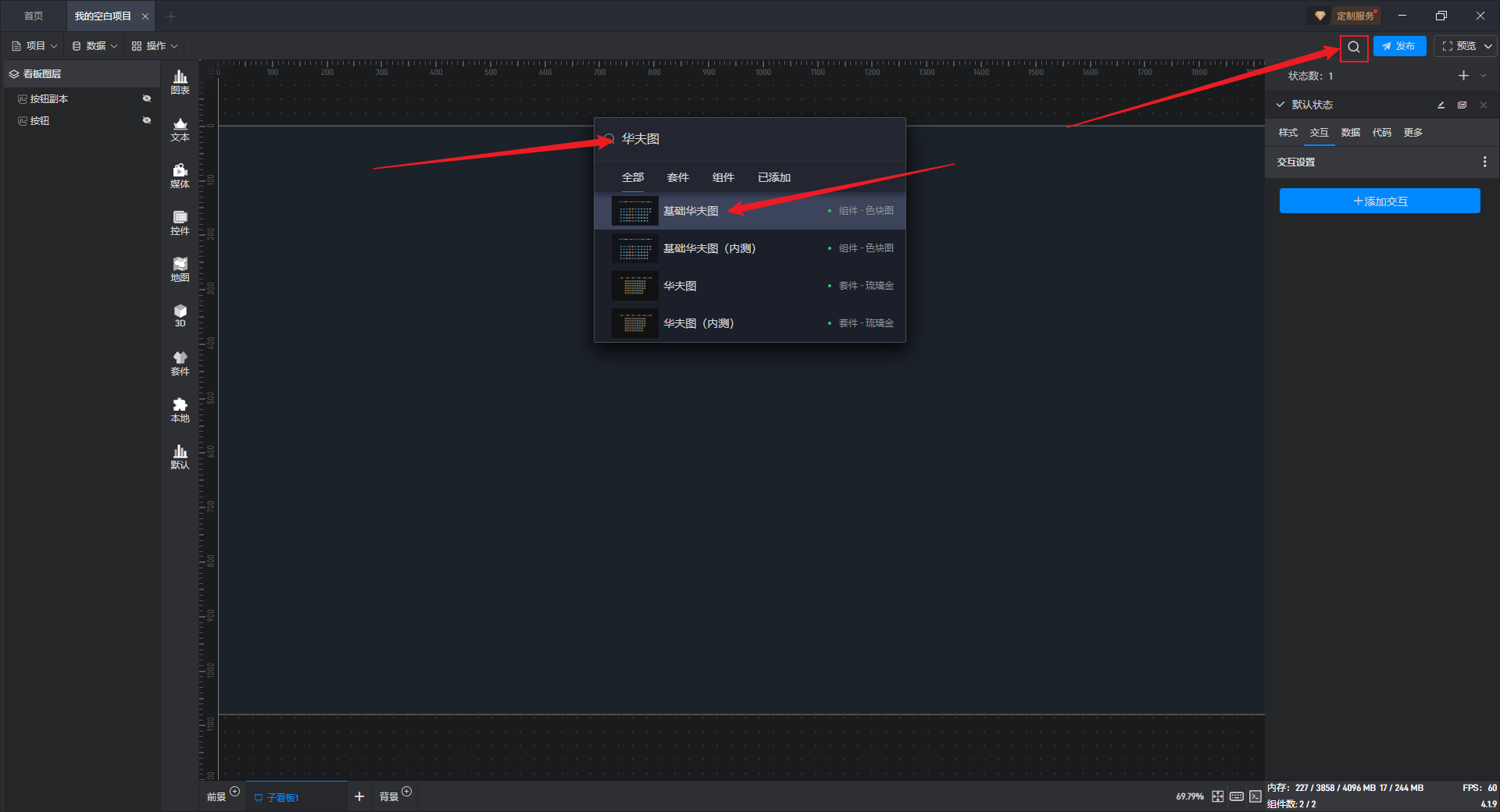 点击搜索按钮或按键盘“Ctrl+F”键打开搜索框,输入组件名称进行搜索,然后点击对应的组件进行添加。